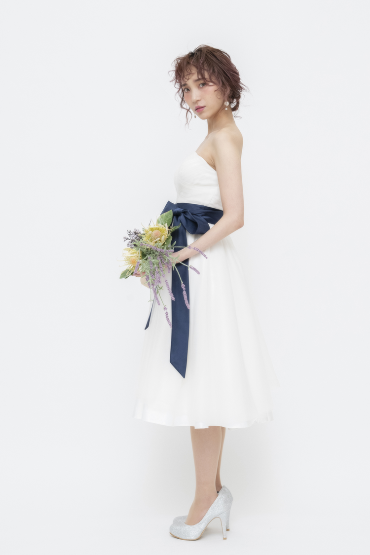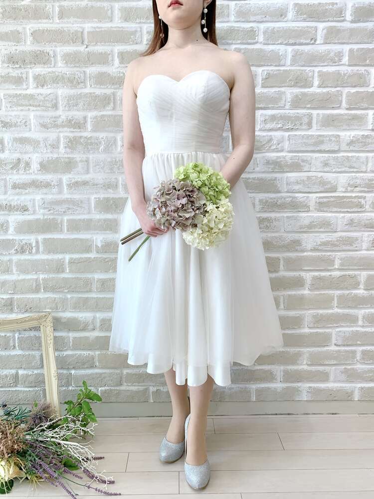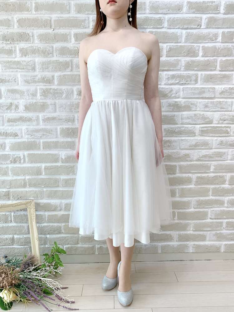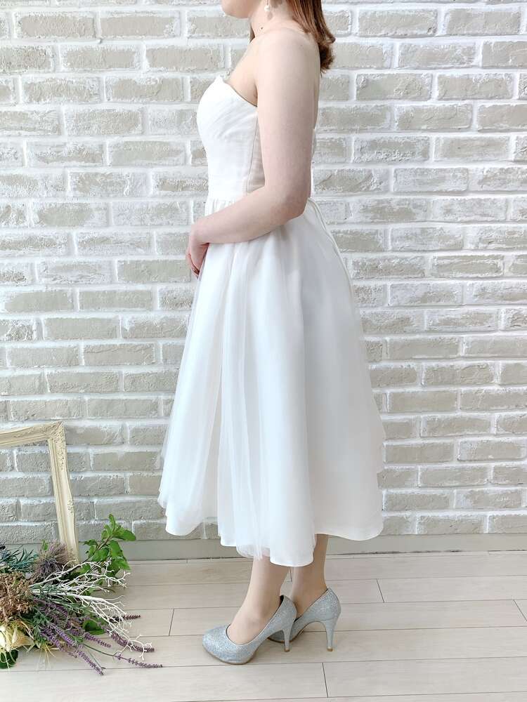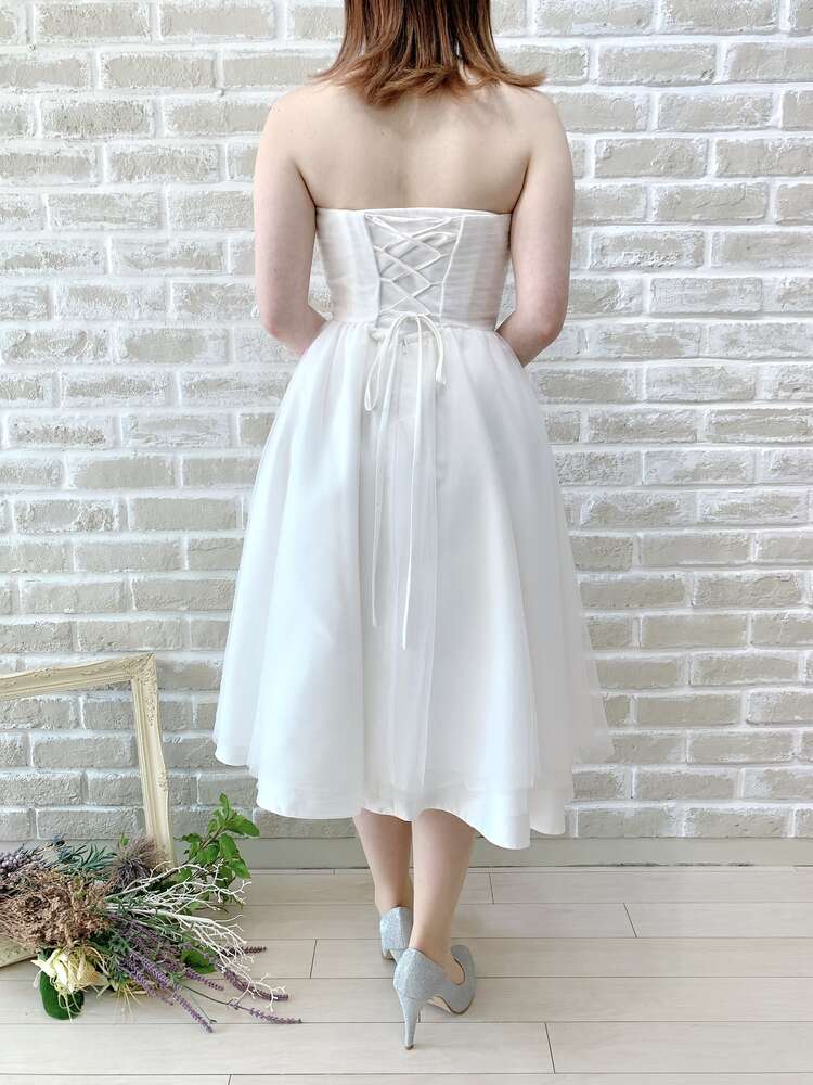 ホワイトチュールのシンプルなミモレ丈ドレス。後ろは編み上げタイプとなっており、サイズの微調節が可能。何重に重なった無垢なチュール生地は、繊細でナチュラルな雰囲気に。華やかさが欲しい場合は大ぶりのアクセサリーを合わせたりパニエでボリュームを、優しい雰囲気でいきたい場合は生花やドライフラワーを合わせてアクセサリーは華奢に、カジュアルに小物で遊びたい場合はスニーカーで外しても?。どのイメージでのコーディネートも叶う万能ドレスです。膝が隠れる丈感のミディアム丈ドレスは近年一番人気。やりすぎないボリューム感は、カフェなど飲食店でのカジュアルな2次会にもぴったりです。