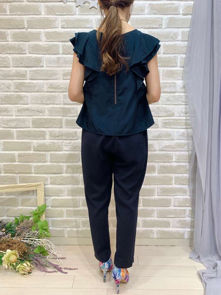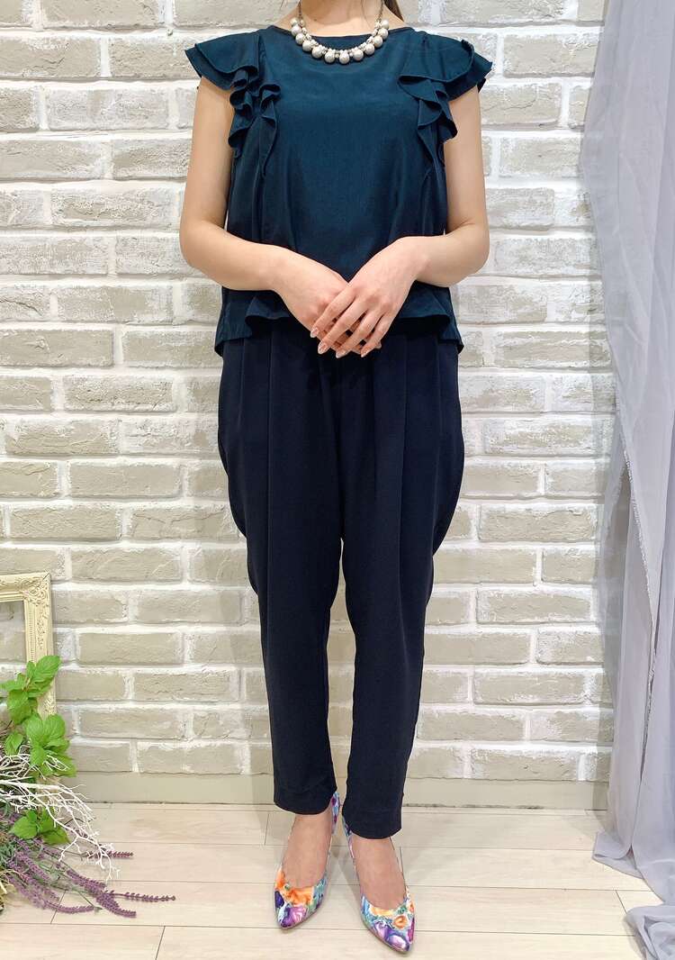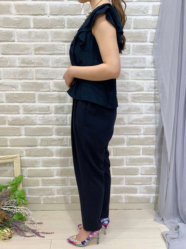 キャミソールオールインワンとその上から被るトップスに分かれた、ツーピースセパレートタイプのパンツスタイルドレス。パンツドレスは、スカートタイプとはまた違った印象のスタイリッシュなマニッシュスタイルを楽しめます。落ち着いたカラーがより大人なイメージに。『可愛らしい』『フェミニン』なスタイルが苦手な方にも着用しやすいドレスです。パンツスタイルならではの、すっきり縦長シルエットは華奢な雰囲気も感じます。フリルスリーブが少しだけ柔らかさをプラスしてくれます。シンプルなデザインで年齢層を選ばす、カジュアルなパーティーや食事会・ご友人の結婚式お呼ばれにも。パンツタイプは1枚で着るのが断然おすすめですが、羽織る場合はストールを。