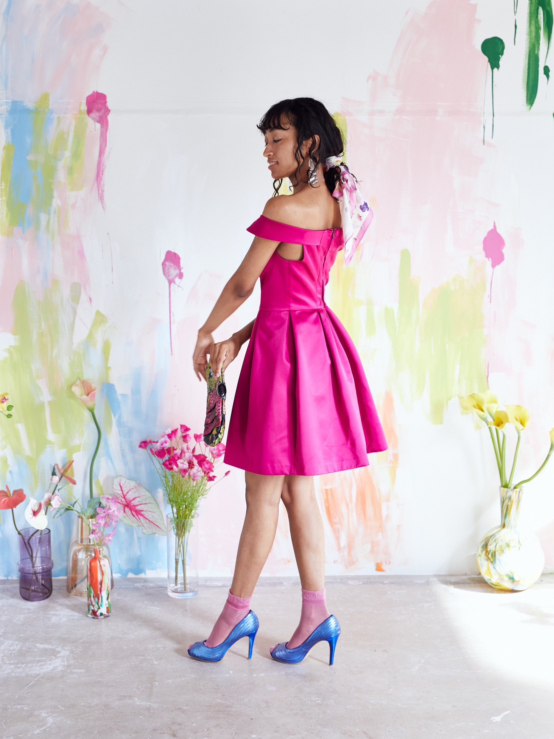 日本でもメジャーになってきたオフショルダーデザイン。コンパクトなデザインながら、濃いめのマゼンタカラーで華やかさバッチリです。華奢なデザインやスタッズ、パール、柄物、いろんな小物と相性が良く、他の小物を控えめにすると品が出て大人な雰囲気に、大ぶりのアクセサリーやカラー小物などを合わせるとインパクト大のパーティースタイルに。羽織ると、オフショルダーのデザインが隠れてしまうので、1枚で着こなせるパーティーでのご利用が1番おすすめ。また、ショルダーデザインを抜いても十分華やかなので、ボレロ等を合わせてご友人の結婚式のお呼ばれドレスにも。色とショルダーにポイントを絞ったやりすぎないデザインがこなれ感を狙える1着です。