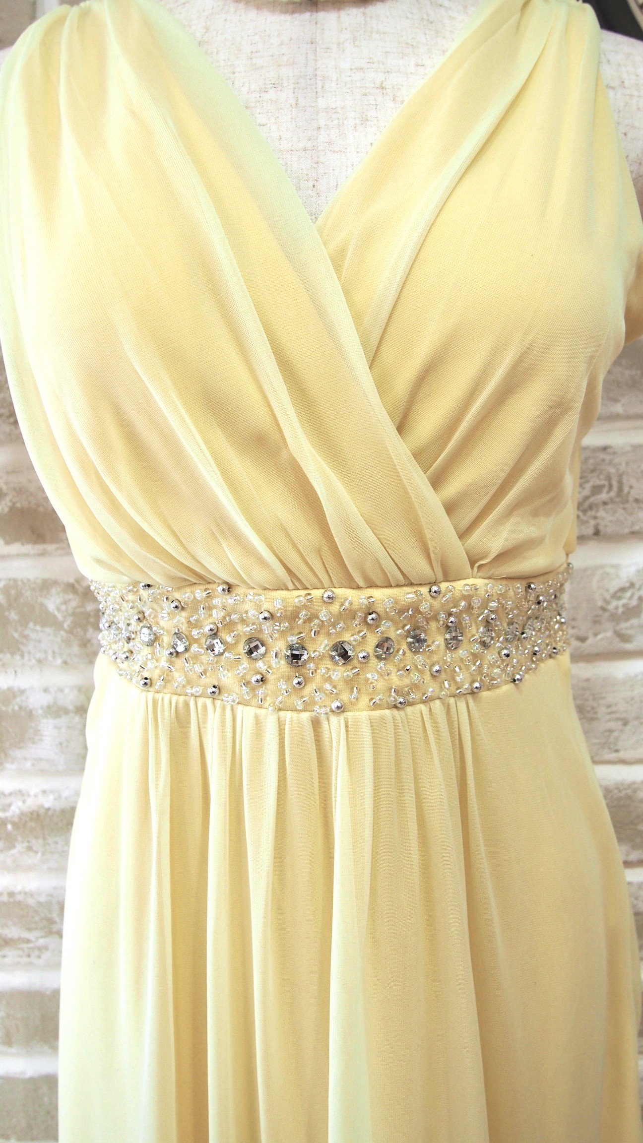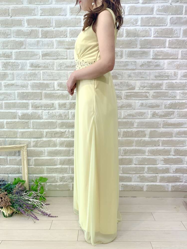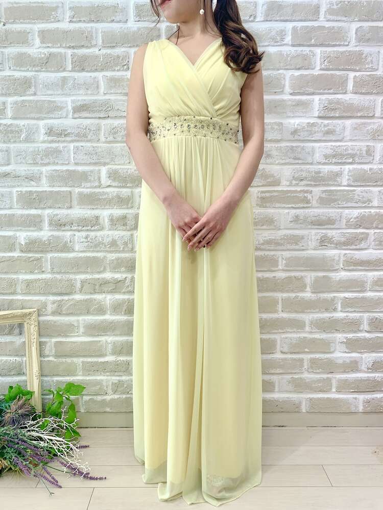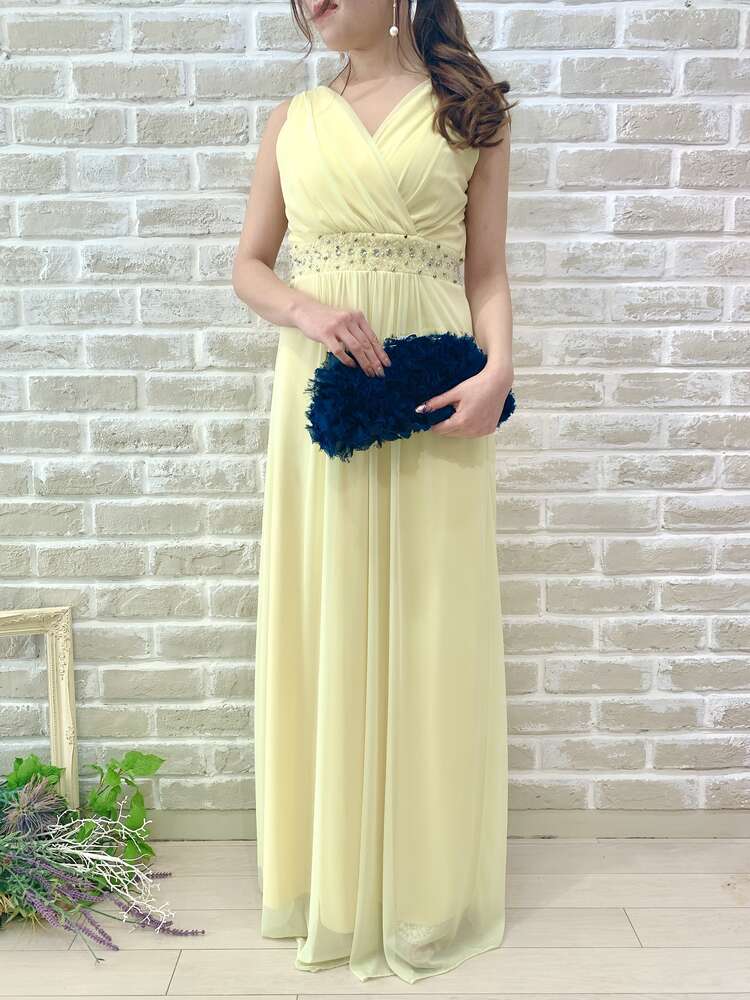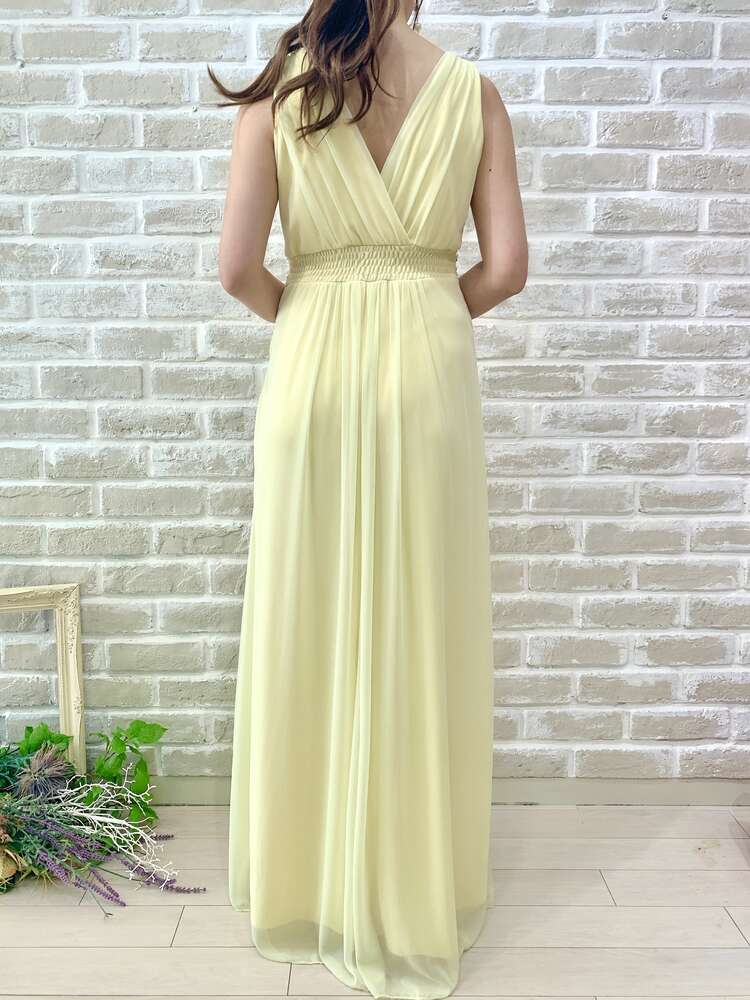 カシュクールVネックのシンプルでスレンダーなラインのロングドレス。明るいパステルイエローの優しい印象の中にもネックデザインが大人っぽさをほどよくプラスしてくれます、歩くたびにひらりと揺れる柔らかな素材が女性らしく目を惹きます。もちろん年間を通して着用いただけますが、爽やかなライトカラーは特に春夏の暖かい季節のパーティーや花嫁さんの2次会用ドレスにぴったりです。20~40代の大人っぽさ・柔らかさを求める女性にぜひ。スレンダーラインのドレスは縦長シルエットで細見え効果も期待できる、女性には嬉しいデザインです。可愛すぎるドレスは苦手だけど、淡いカラーが気になる方、165cm程度以上の長身の方におすすめしたいドレスです。