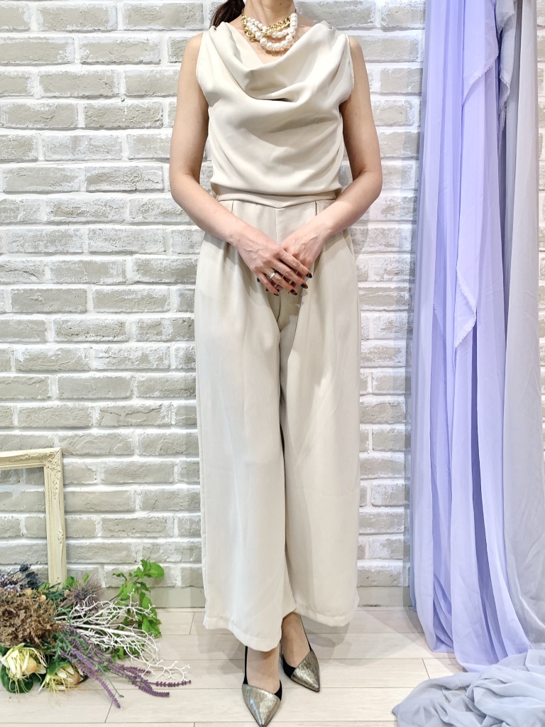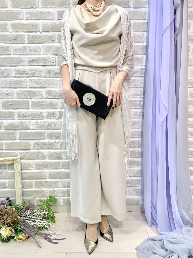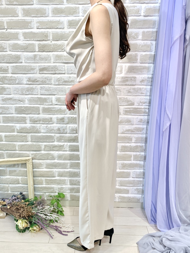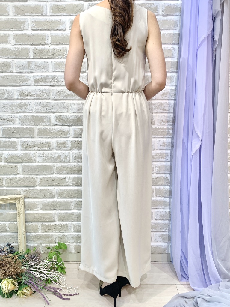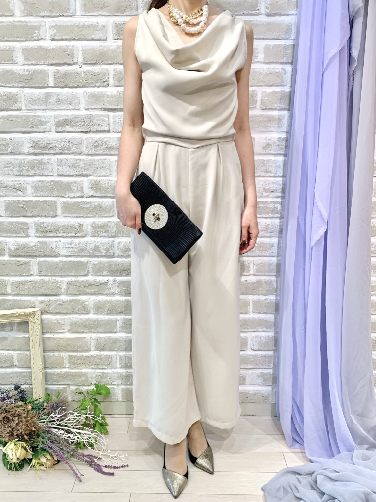 かっこいい印象にキマるジャンプスーツ。スカートタイプでは出せない大人っぽさや媚びないクールな雰囲気を楽しめます。カジュアルなパーティーやちょっとしたお食事会などにぴったり。こちらのパンツドレスは比較的丈も長めとなっておりますので、ロングドレス同様長身の方におすすめです。ウエストラインはゴム仕様で、締め付け感がなく着心地も抜群。スカートスタイルが苦手、ドレスアップスしたいけど脚を出したくない、そんな悩みをお持ちの方もパンツなら挑戦しやすいですね。シンプルなデザインなので年齢層を選ばず着用いただける1着です。羽織らないのが1番バランスが良いですが、ストールをさらっと羽織るとドレッシーなムードに。