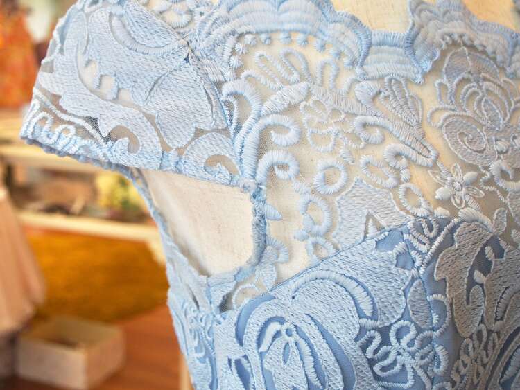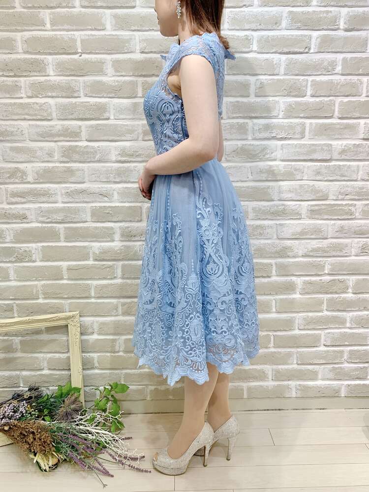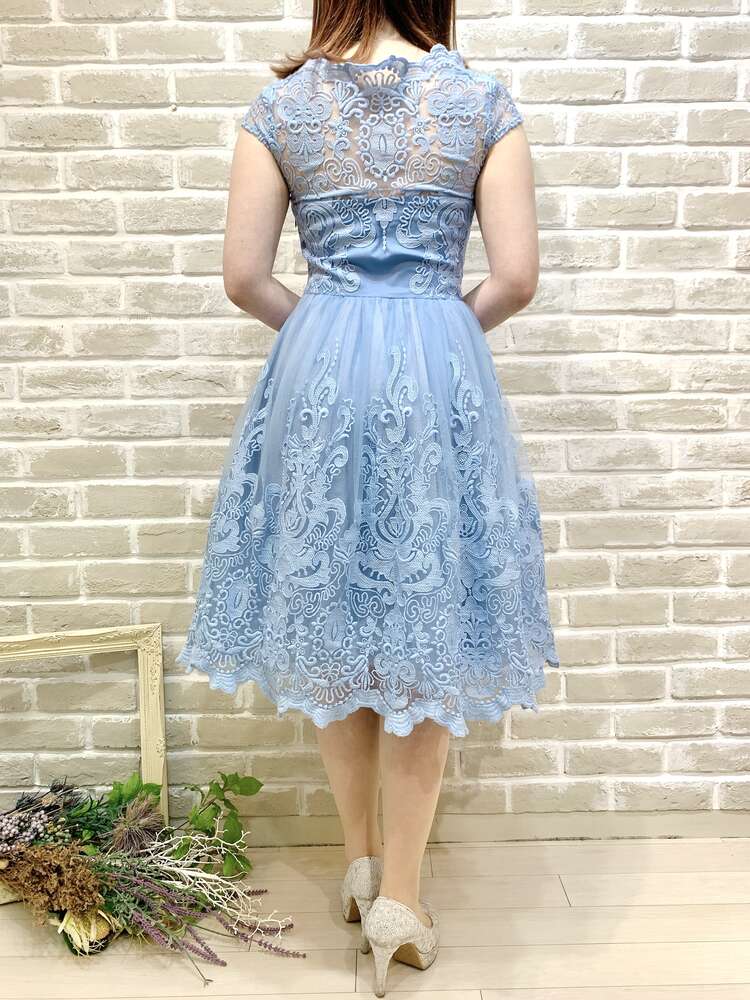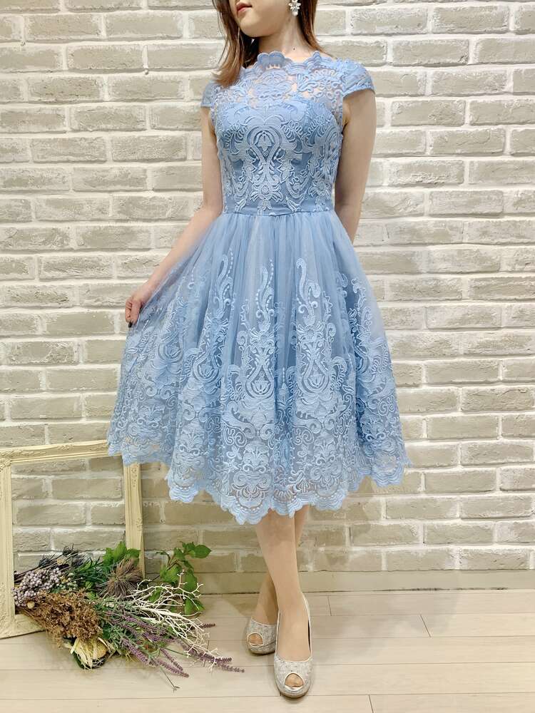 キャップスリーブの露出控えめドレス。ドレス全体に施された大柄の刺繍がとても華やかで主役感満載。ミニ丈やロング丈とはまた違った、大人っぽさと可愛らしさが混在したクラシカルでレディライクな雰囲気を演出してくれるミディアム丈は年々人気上昇中。当店では特にこのタイプが大人気です。ふんわり程よいスカートのボリューム感と年齢層を選ばないデザイン、飲食店等でのカジュアルな2次会にもOKな生地感。新婦様の2次会ドレスや謝恩会など、最高の日に是非オススメしたいカラードレスです。膝下のミディアム丈スカートは、少し高めのヒールでバランスをとるのが美しく見せポイント。