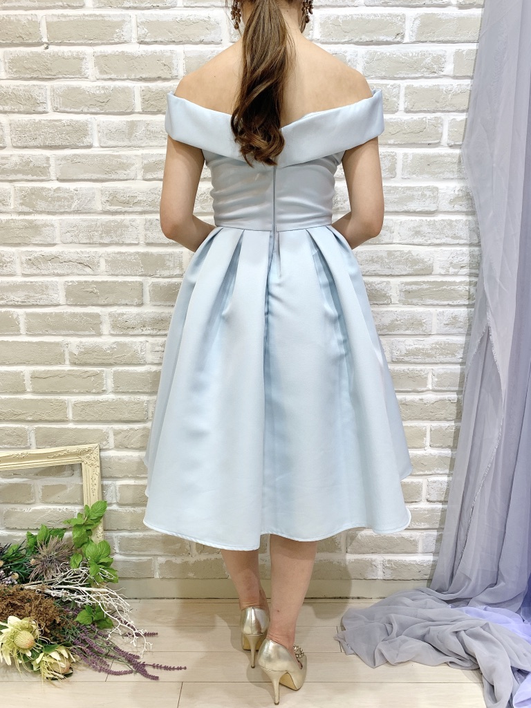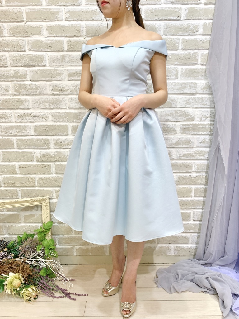 オフショルダーが女性らしいミディアムドレス。淡いブルーがとても優しい印象。ミニ丈ドレスの可愛らしさとはまた一味違った、大人っぽさ・上品さも兼ね備えた雰囲気です。披露宴でカクテルドレス・カラードレスを着用されない新婦様の2次会用ドレスとしておすすめ。女性らしさを強調させ、顔周りをスッキリ見せてくれるデコルテデザインが特徴のオフショルダーは、羽織らずドレス1枚で着用いただくとドレス本来のスタイリッシュで主役感のある華やかさを楽しめます。ネックレスなしで大ぶりのイヤーアクセだと抜け感のあるナチュラルスタイルに、ネックレスをつけると甘くプリンセスのようなスタイルに。ドレスインナーのご用意があると安心です。サイズ違いで3着ご用意しています。ブライズメイドにも。