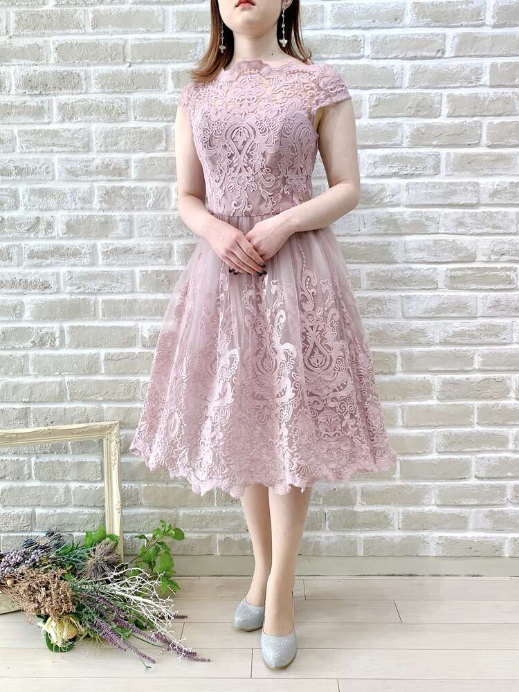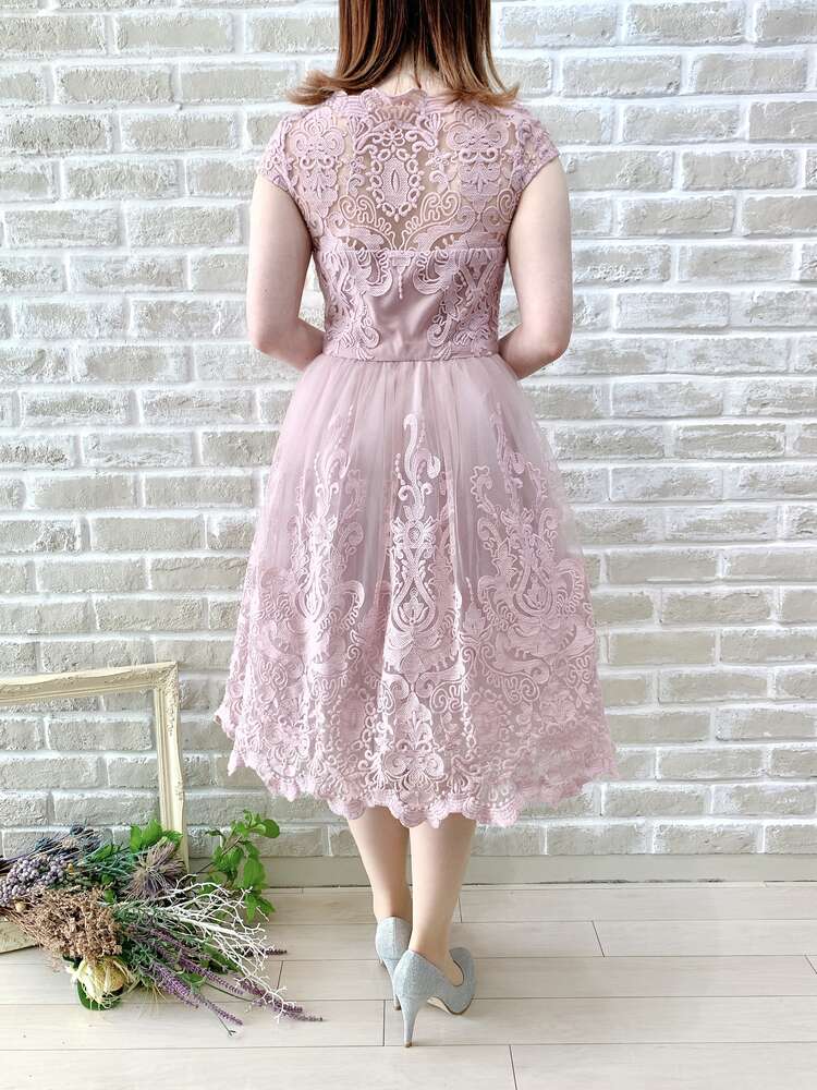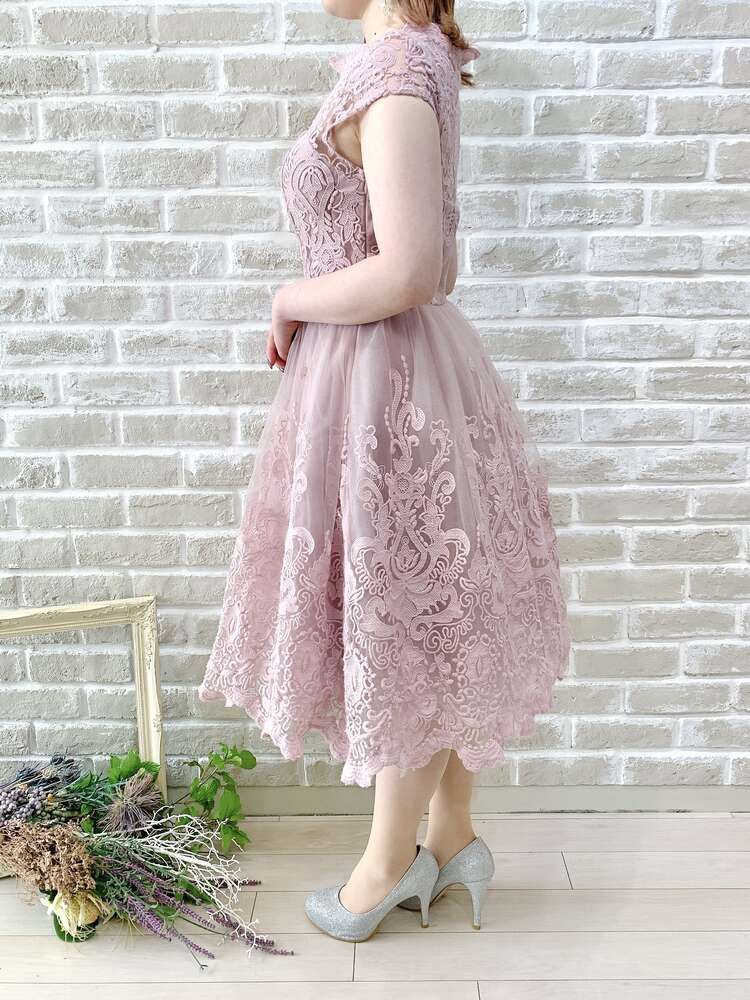 キャップスリーブの露出控えめドレス。ドレス全体に施された大柄の刺繍がとても華やかで主役感満載。ミニ丈やロング丈とはまた違った、大人っぽさと可愛らしさが混在したクラシカルでレディライクな雰囲気を演出してくれるミディアム丈は年々人気上昇中。drerichでは特にこのタイプが大人気です。ふんわり程よいスカートのボリューム感と年齢層を選ばないデザイン、飲食店等でのカジュアルな2次会にもOKな生地感。新婦様の2次会ドレスや謝恩会など、最高の日に是非オススメしたいカラードレスです。膝下のミディアム丈スカートは、少し高めのヒールでバランスをとるのが美しく見せポイント。