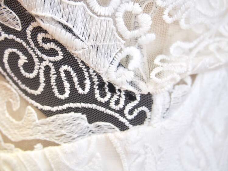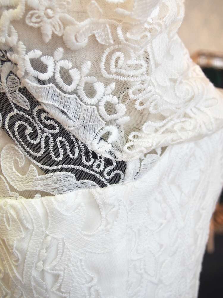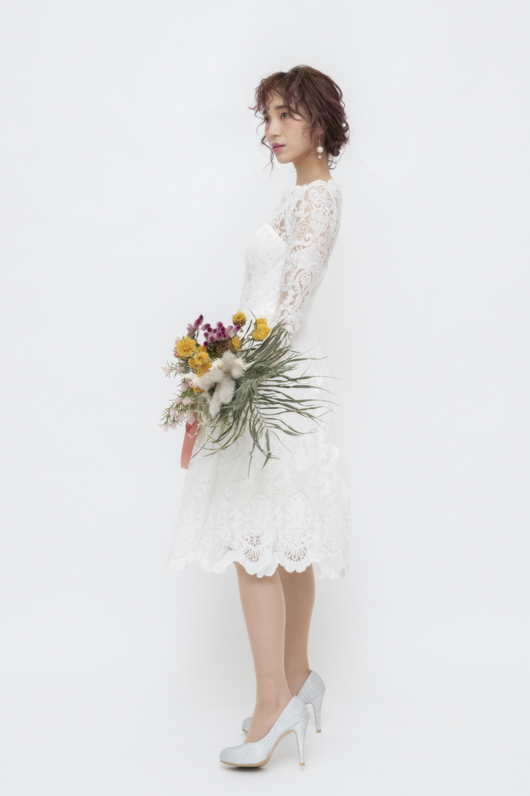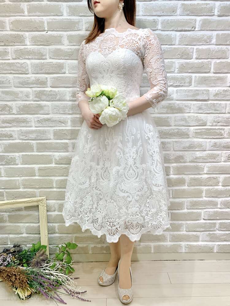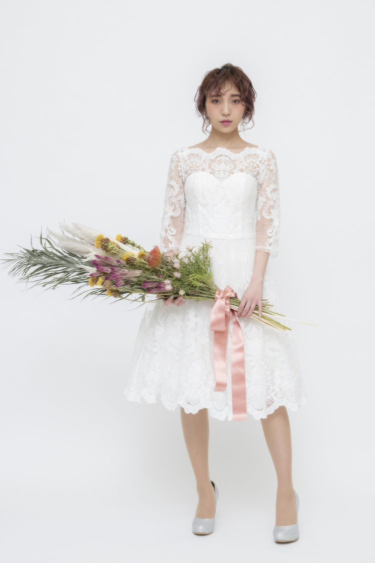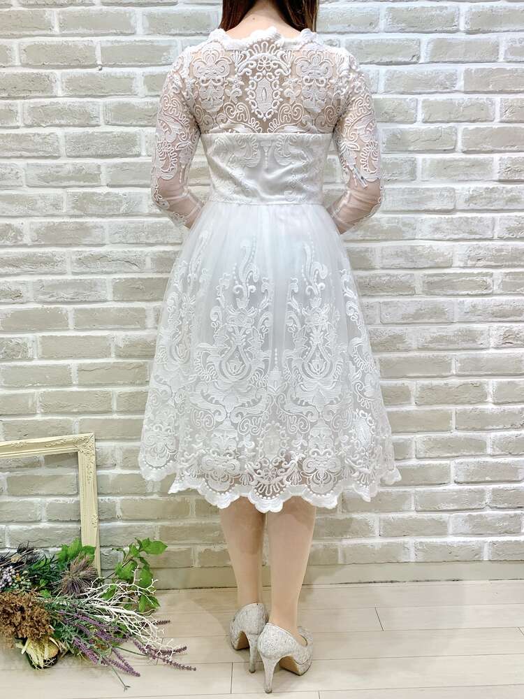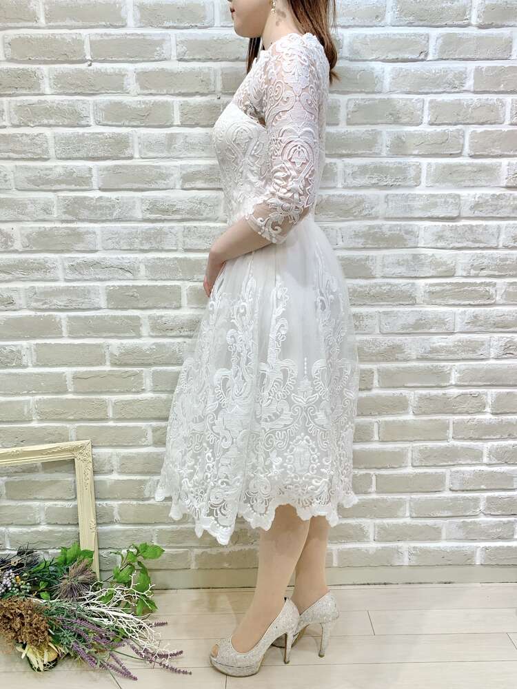 キャップスリーブの露出控えめドレス。ドレス全体に施された大柄の刺繍がとても華やかで主役感満載。ミニ丈やロング丈とはまた違った、大人っぽさと可愛らしさが混在したクラシカルでレディライクな雰囲気を演出してくれるミディアム丈は年々人気上昇中。drerichでは特にこのタイプが大人気です。ふんわり程よいスカートのボリューム感と年齢層を選ばないデザイン、飲食店等でのカジュアルな2次会にもOKな生地感。新婦様の2次会ドレスやお披露目パーティーなど、最高の日に是非オススメしたいホワイトドレスです。膝下のミディアム丈スカートは、少し高めのヒールでバランスをとるのが美しく見せポイント。
