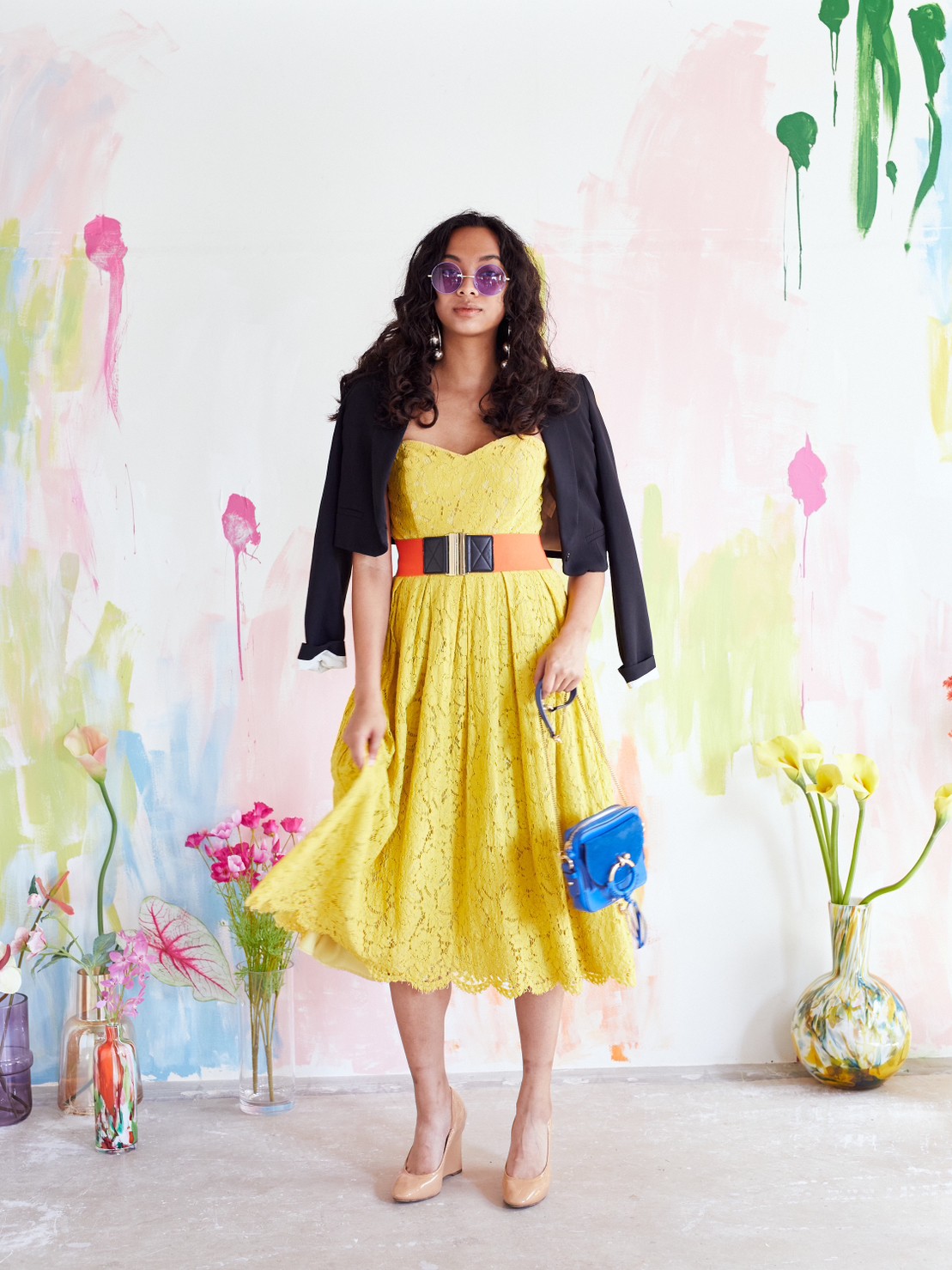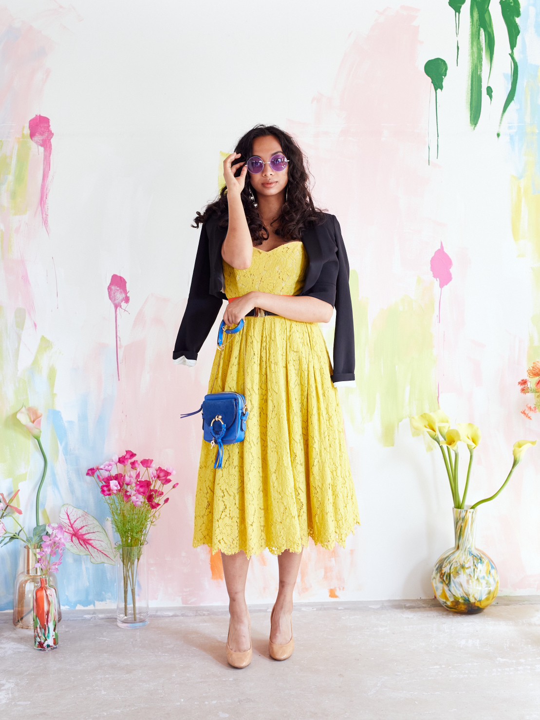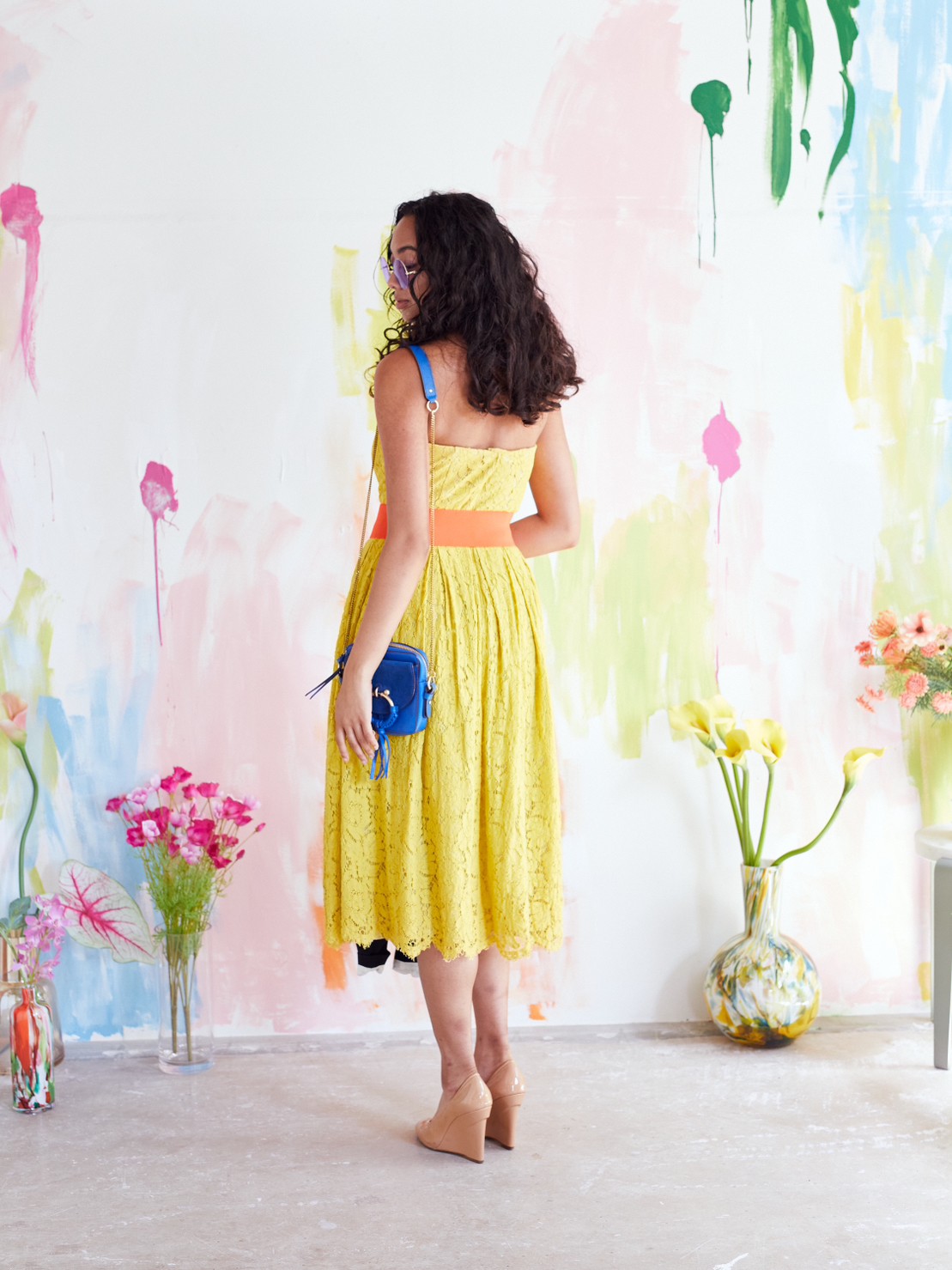人気のミディアム丈スカートのドレス。ミディアム丈は膝下から脛辺りの丈感(身長によって異なります。)となっており、少し重さのあるデザインはクラシックで上品な雰囲気に仕上げてくれます。くすんだマスタードカラーのコットンレース生地で、カジュアルなパーティーや謝恩会などで、周りとは一味違うドレスアップスタイルに挑戦したい方におすすめです。イメージをガラッと変えたい新婦様の2次会ドレスとしても人気です。ミディアム丈のドレスの場合、高めのヒールを履いたり、野暮ったくならないように羽織の丈感やバッグの大きさなど小物のバランスに気をつけてコーディネートしてみましょう。羽織なしや、アクセサリーはボリュームのあるイヤリングのみに絞ったり、スカート以外はスッキリさせるのがポイントです。