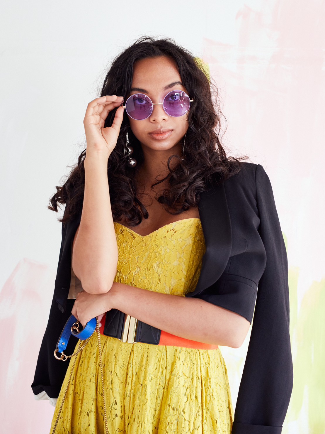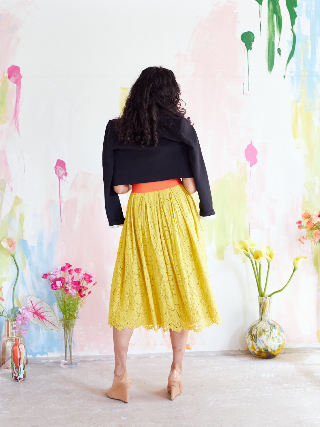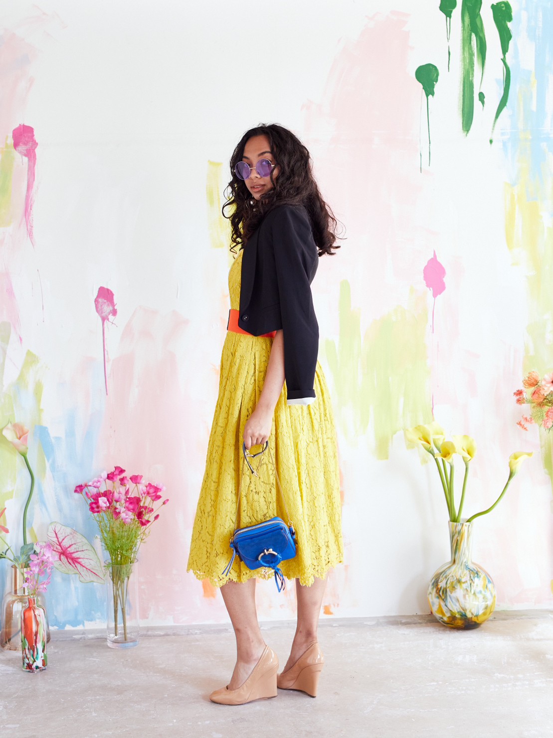 人気のミディアム丈スカートのドレス。ミディアム丈は膝下から脛辺りの丈感(身長によって異なります。)となっており、少し重さのあるデザインはクラシックで上品な雰囲気に仕上げてくれます。くすんだマスタードカラーのコットンレース生地で、カジュアルなパーティーや謝恩会などで、周りとは一味違うドレスアップスタイルに挑戦したい方におすすめです。イメージをガラッと変えたい新婦様の2次会ドレスとしても人気です。ミディアム丈のドレスの場合、高めのヒールを履いたり、野暮ったくならないように羽織の丈感やバッグの大きさなど小物のバランスに気をつけてコーディネートしてみましょう。羽織なしや、アクセサリーはボリュームのあるイヤリングのみに絞ったり、スカート以外はスッキリさせるのがポイントです。