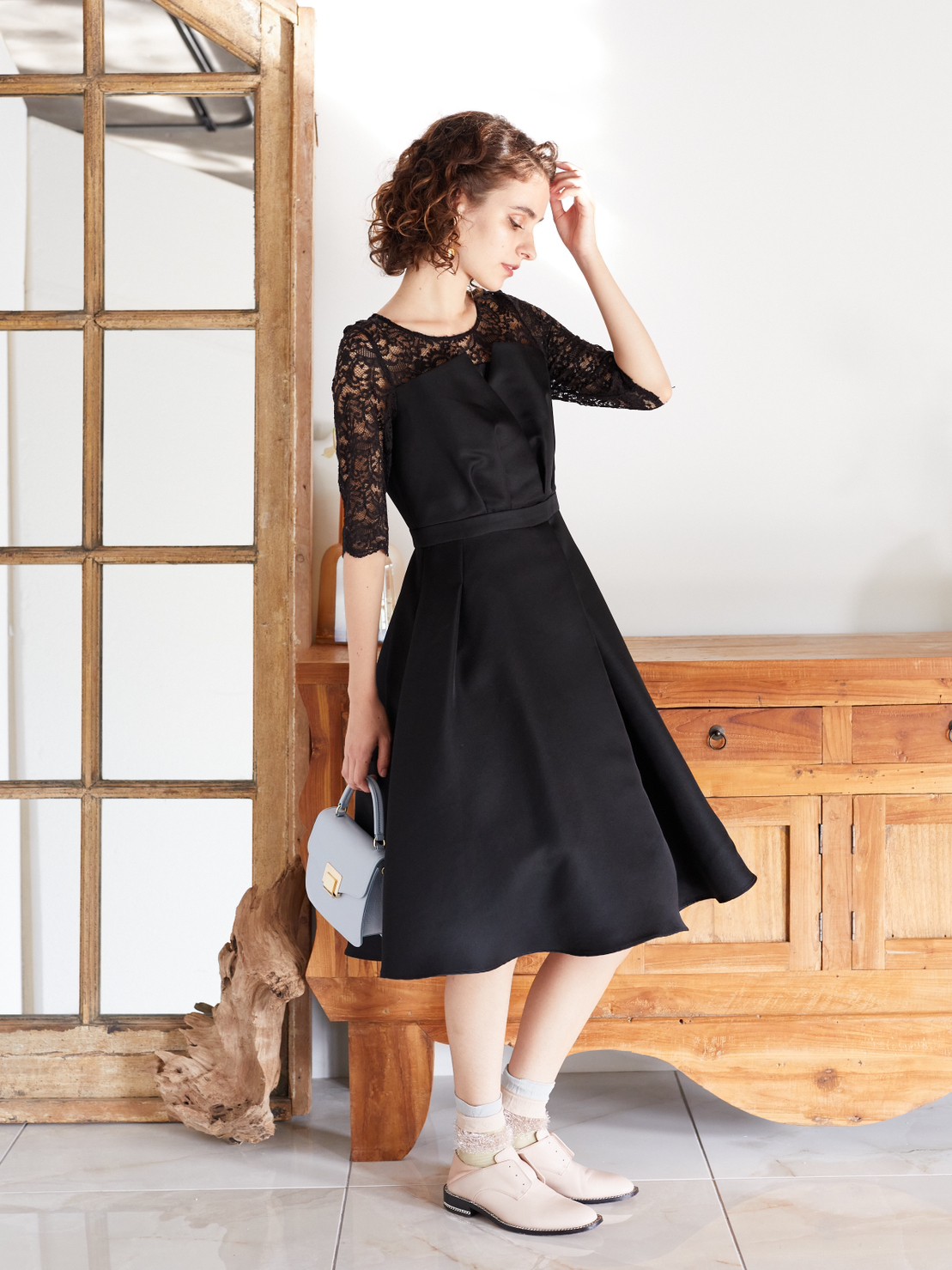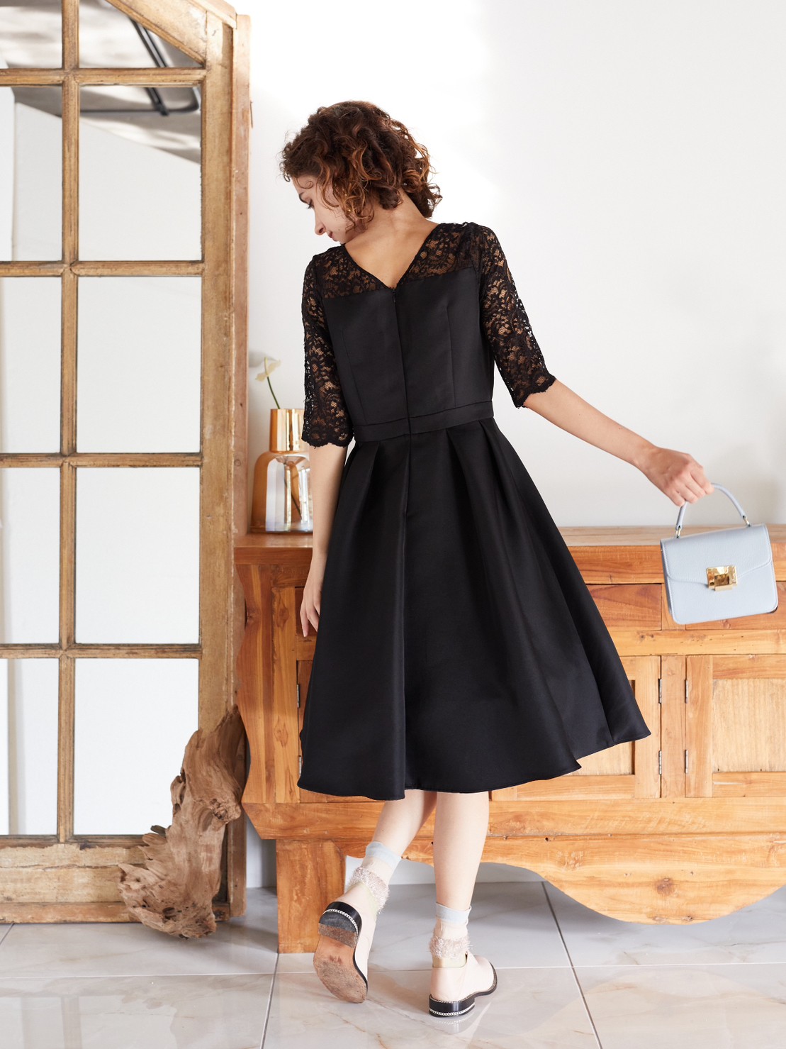 当店ではとても人気のレース生地袖ありドレス。結婚式に参列される際、ドレスにボレロやストールを羽織るのがお呼ばれスタイルとして定番ですが、年々羽織いらずの1枚で着用でき露出も抑えられたタイプが人気上昇中。野暮ったさがなくこなれ感も狙えるので、このブームはこれからも続いていく気がします。羽織で隠れることがないので、ドレス本来の雰囲気を最大限に活かすことができます。1枚でキマるデザインは、コーディネートが苦手な方にもおすすめです。また、レース生地は女性らしく華やかに見せてくれるので幅広い年齢層の方に着用いただけます。短過ぎない丈感も◎。結婚式などのオケージョンドレスとして、ちょっとしたパーティードレスとして、多様なシーンで活躍してくれる1着です。