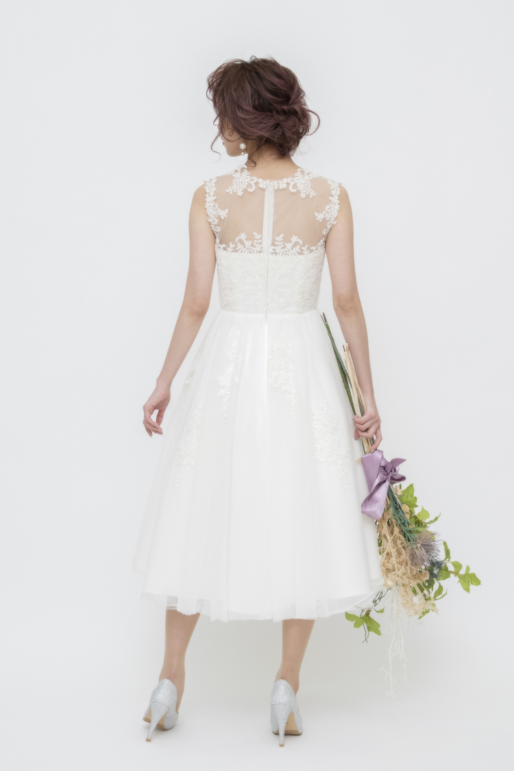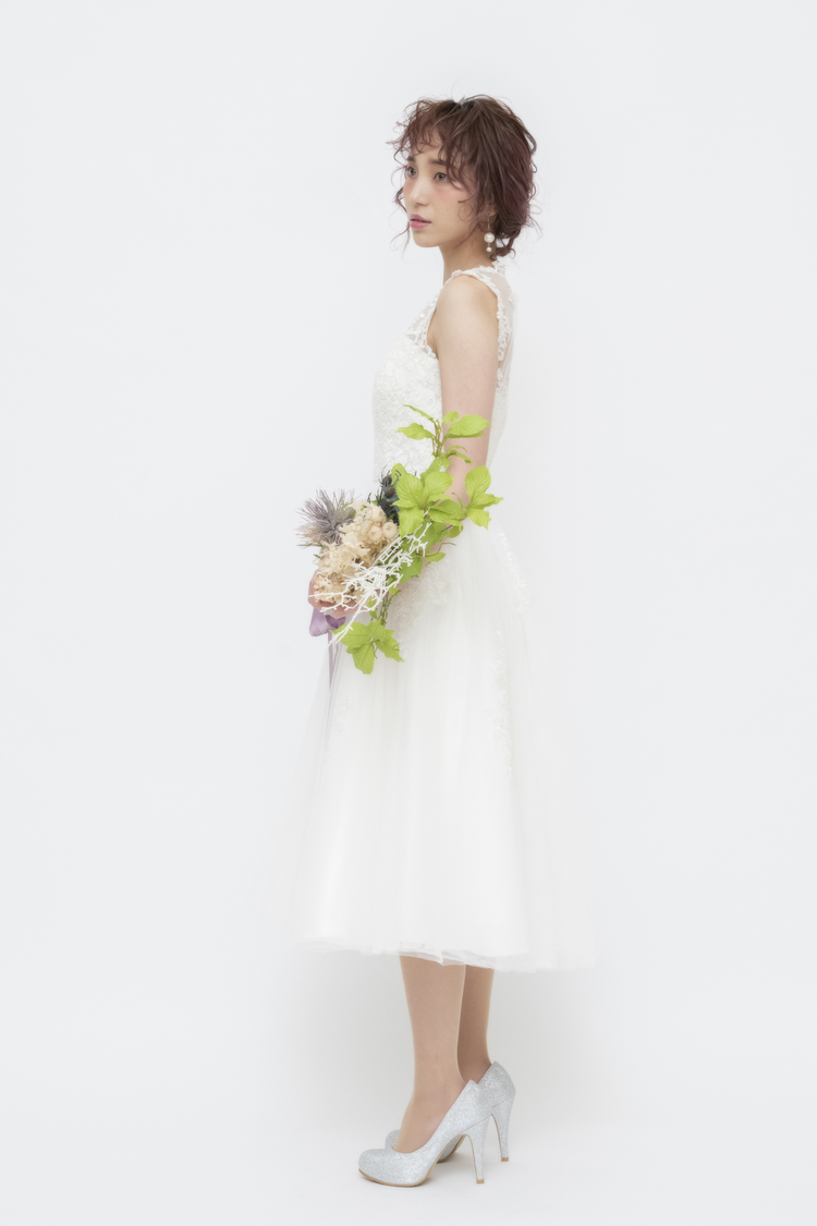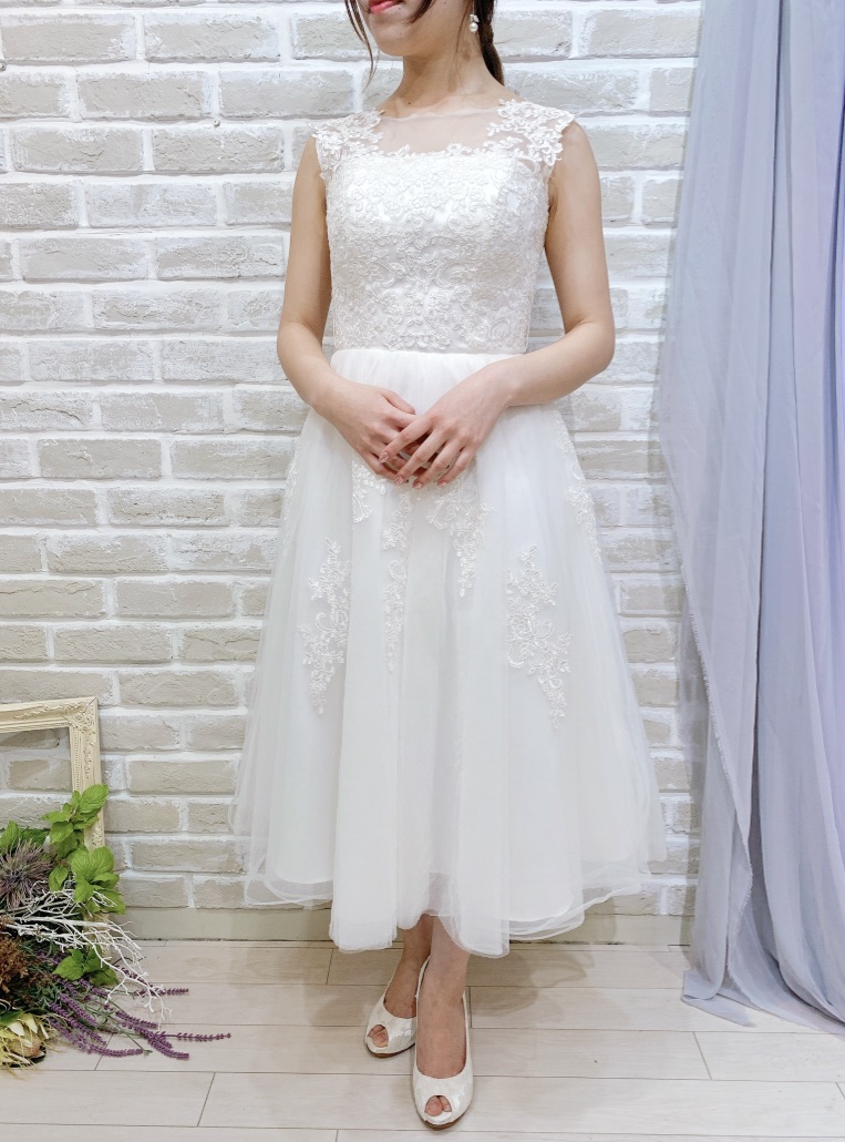 ミモレ丈スカートのホワイトドレス。当店では大人気の肩ありタイプ。とても華やかさのあるドレスです。ロング丈ドレスの大人っぽくキレイめな印象、ミニ丈の可愛らしくガーリーな印象を併せ持った良いとこ取りのミディアム丈ドレス。露出も比較的控えめで、幅広い年齢層のお客様に多くご利用いただいております。ナチュラルで柔らかなふんわりシルエットが、優しく上品で華やかにウエディングスタイルを演出してくれます。ミニ丈のような脚の露出もなく、ロング丈のように裾を踏みつける心配がない動きやすい丈感なので、ウエディングパーティーや2次会でゲストの皆様と思い切り楽しめますね。