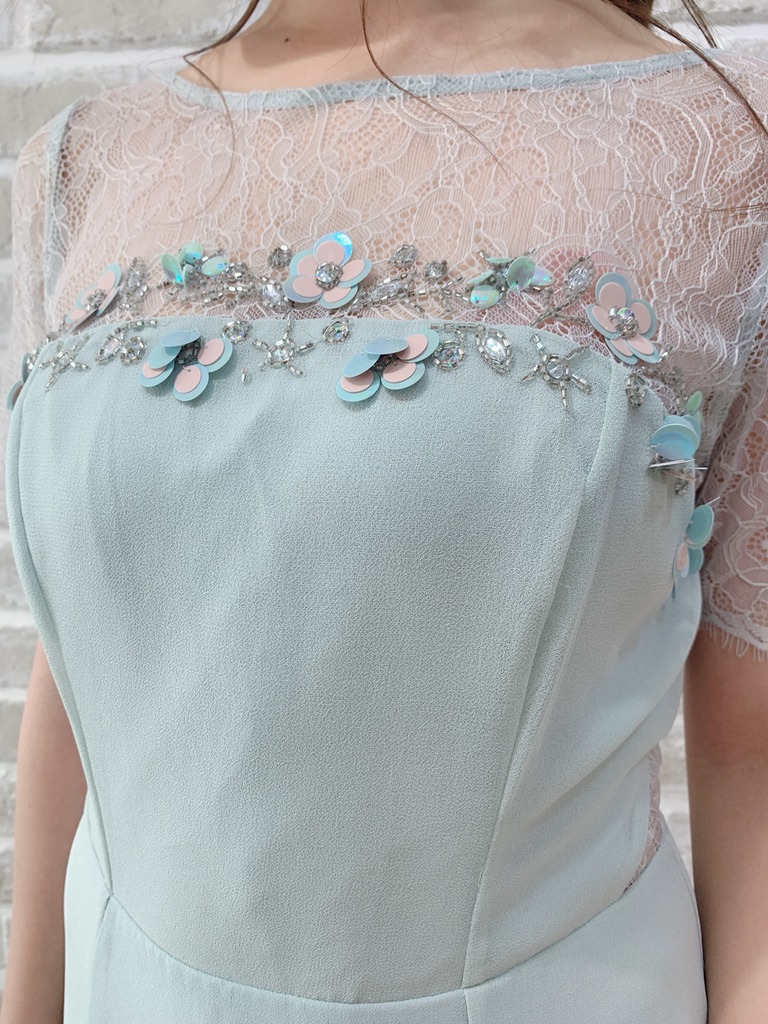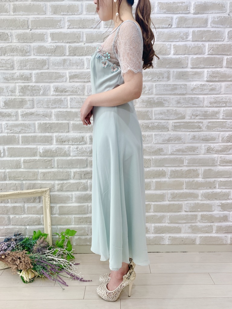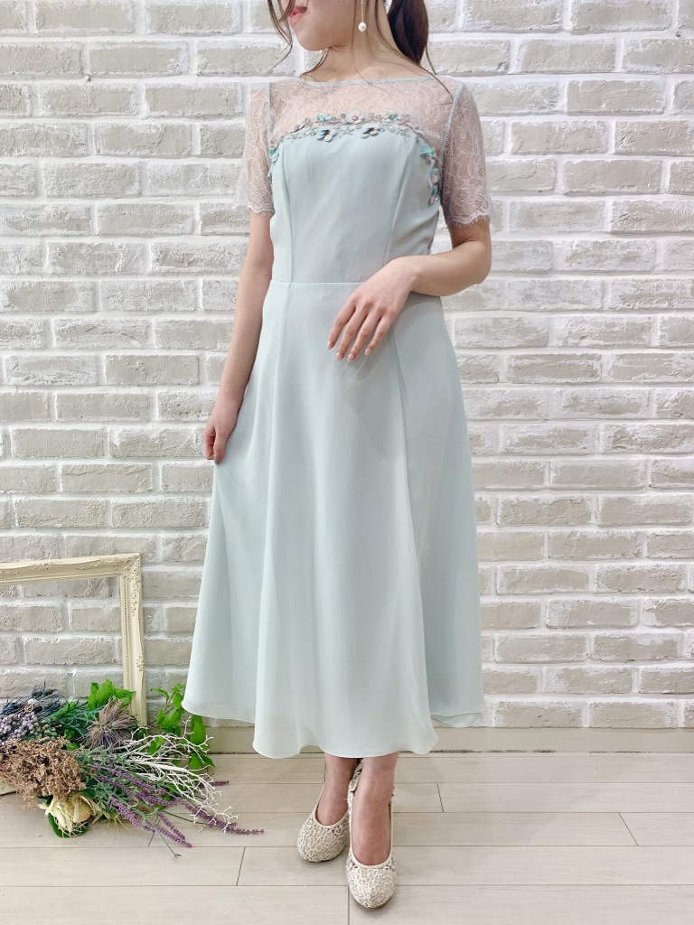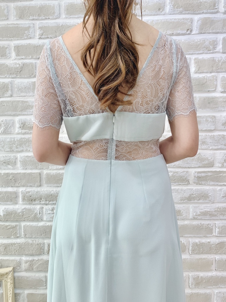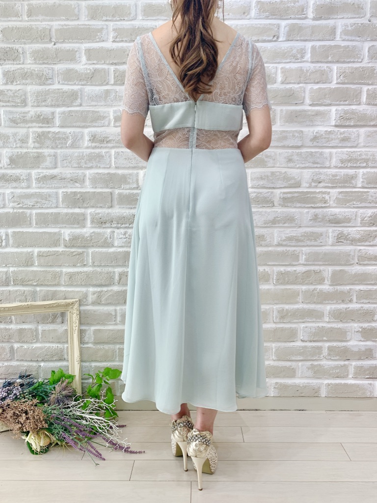 上品な丈感のシンプルデザインドレス。上品な中にどこか優しい印象を持ち合わせた1着。淡い色味に、ボリュームを抑えたストンと落ちるラインのスカートは、動くたびひらりと揺れる軽やかさがある柔らかい生地感で女性らしさが引き立ちます。薄手なので、どちらかといえば春夏向き。秋冬に着用する場合は小物に重みのあるものを持ってくると◎。結婚式のゲストドレスをはじめ、ちょっとドレスアップしたいお食事会など幅広いシーンに。また、シンプルで上品なデザインが年齢層を選ばないのも嬉しいポイント。それぞれのシーン、年代、好みに合わせたコーディネートがお楽しみいただける万能ドレスです。背中はレース生地の透けるデザインです。ヌーブラでの着用がおすすめ。