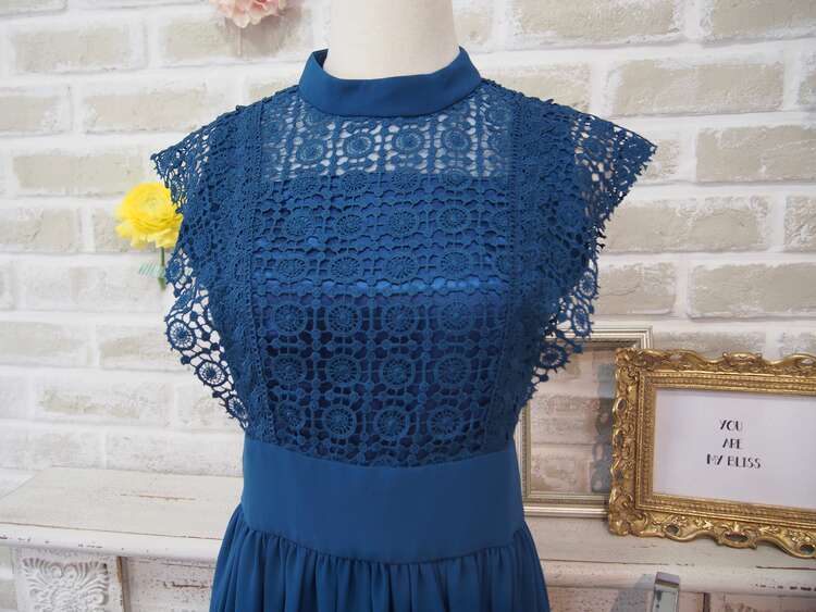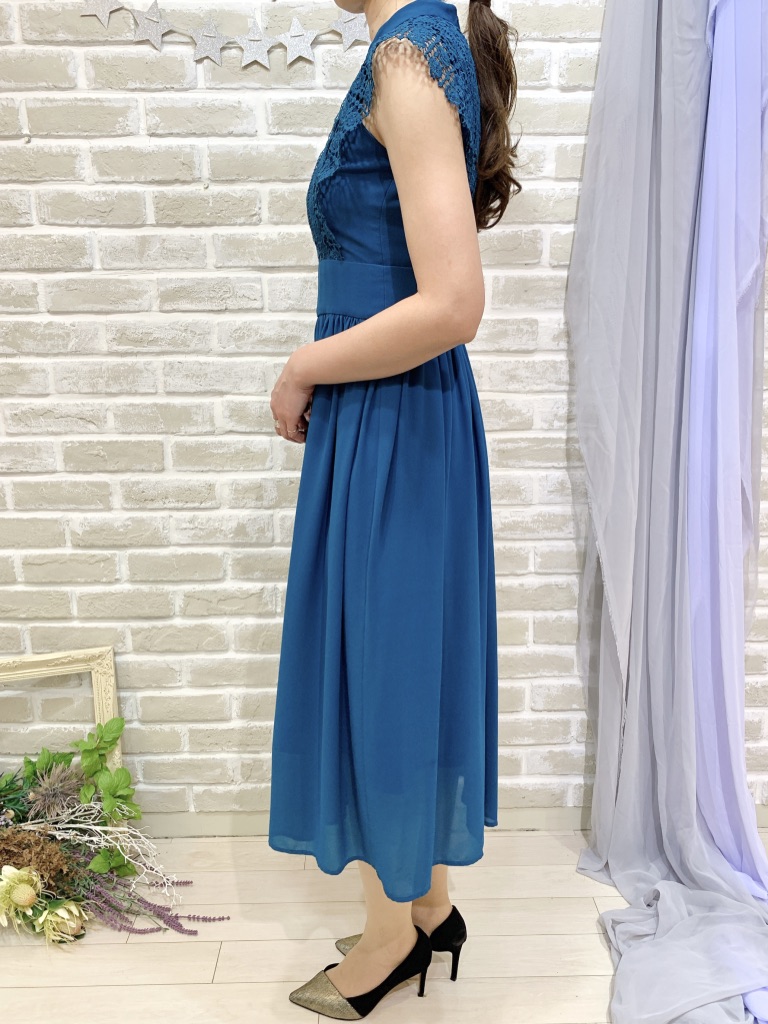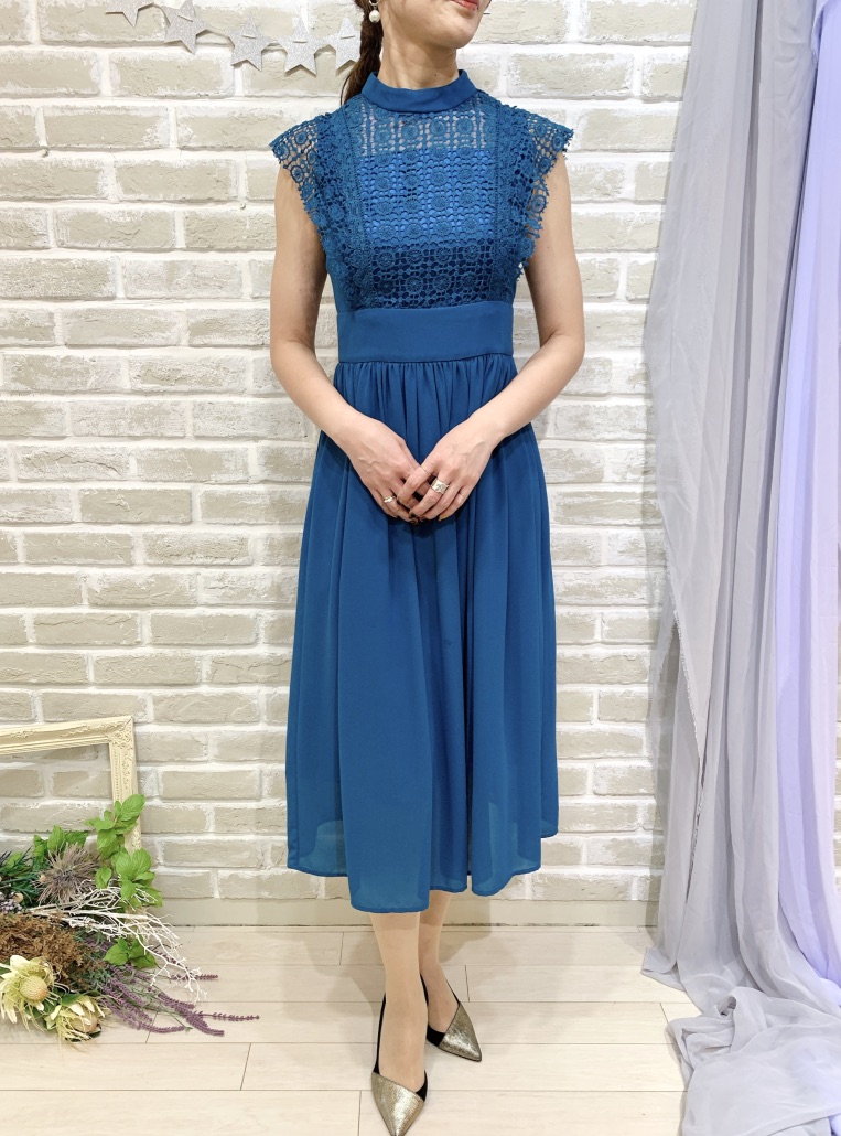 年代を問わず、トレンドのひざ下丈ミディアムドレス。羽織いらずの一枚で着れるタイプはその中でも特に人気です。袖はスッキリ短めなので、丈が長くても重たく見えることがありません。このタイプをご利用いただく場合は、肩紐のないインナーを着用ください。グリーンとブルーの中間のような絶妙な色味は、凛としてかっこよくファッショナブルなイメージに仕上がります。大振りなクロシェレースが特徴的で、さらにおしゃれ度UPです。首が詰まったデザインなので、ネックレスはつけずに、大振りのイヤーアクセを合わせたコーディネートが顔周りをスッキリ見せてバランス◎です。ブラック系を合わせるとシックで大人に、ホワイトやイエローなどはっきりした色を合わせると明るくメリハリが出ます。