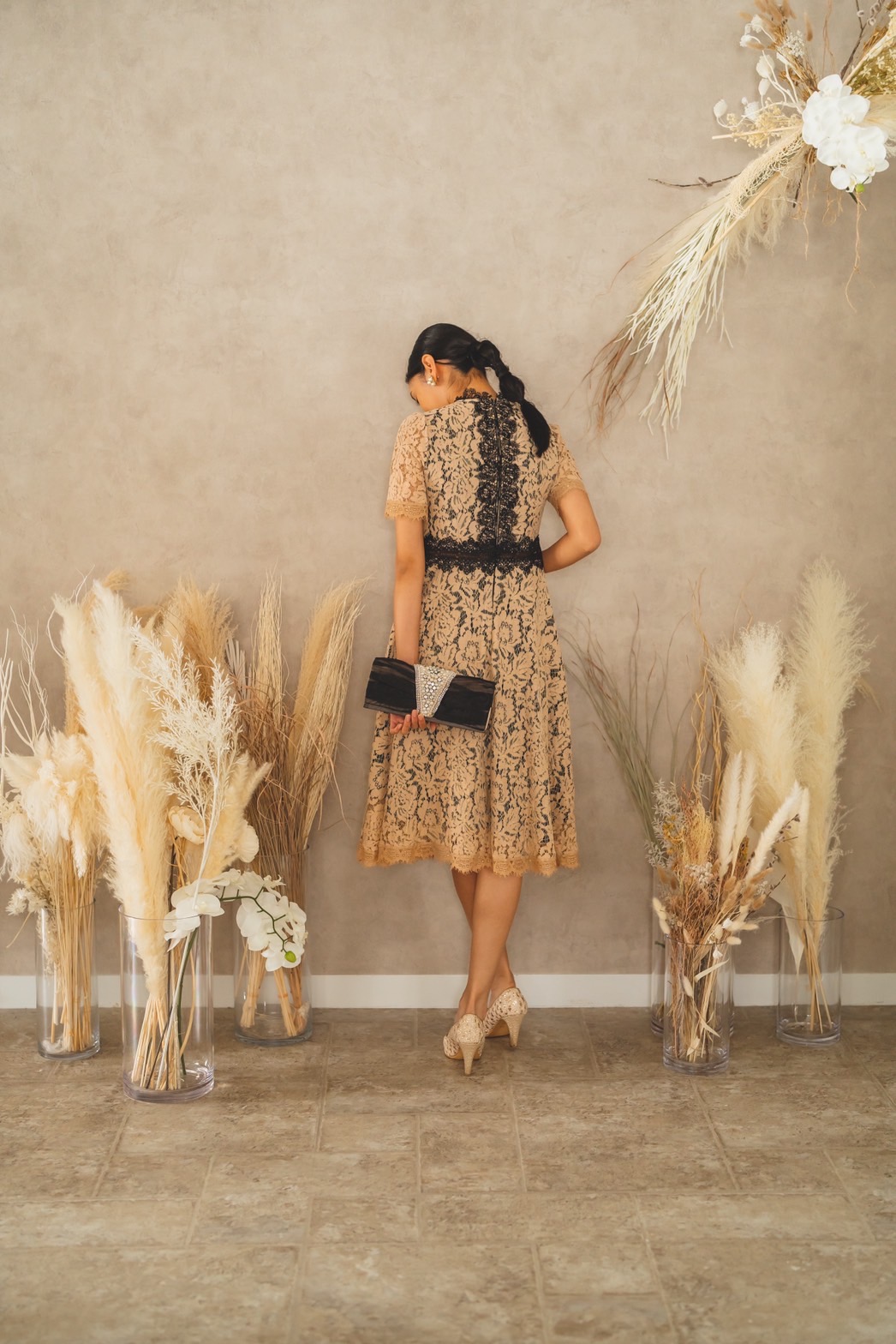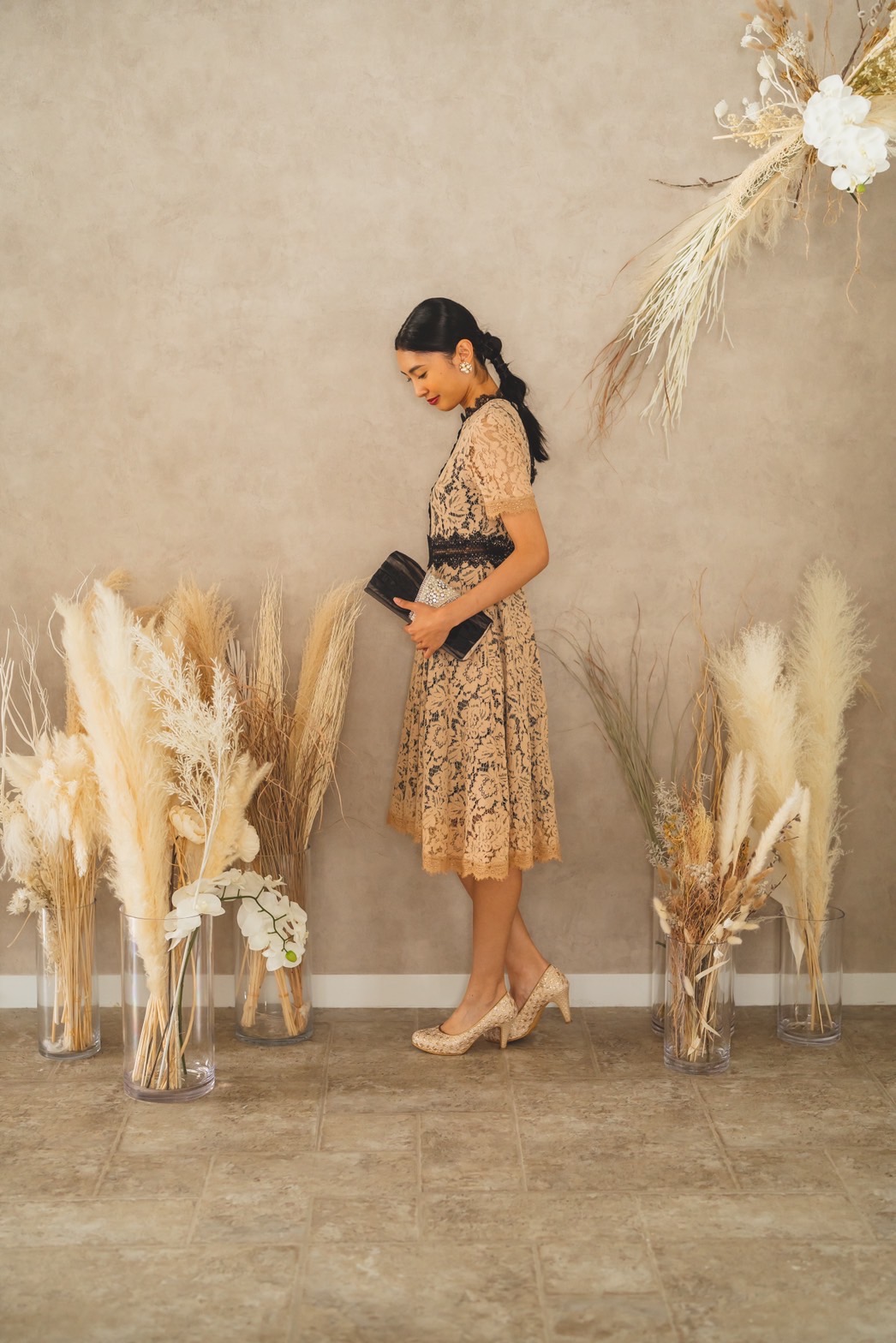 トレンドのレース生地ミディアム丈ドレス。羽織いらずの一枚で着れるタイプはその中でも特に人気です。お腹のレースが少し透けるデザインですがそこまで気にならない方が多く、人気のアイテムです。もし透け感が気になる場合はレースと同じ色のブラックのインナーを着用いただくと安心です。クラシックな雰囲気のデザインとは対照的に、ポイントのブラックがピリッと効いてファッショナブルなイメージに仕上がります。首が詰まったデザインなので、ネックレスはつけずに、大振りのイヤーアクセを合わせたコーディネートが顔周りをスッキリ見せてバランス◎です。小物はウエストと合わせてブラックでまとめると大人っぽく、バッグにホワイトやグリーン・ブルーなどの差し色を持ってくると少し明るい雰囲気に。