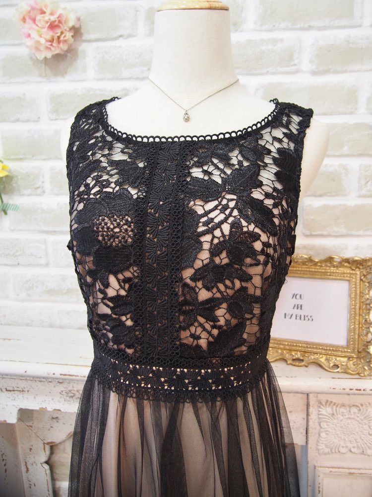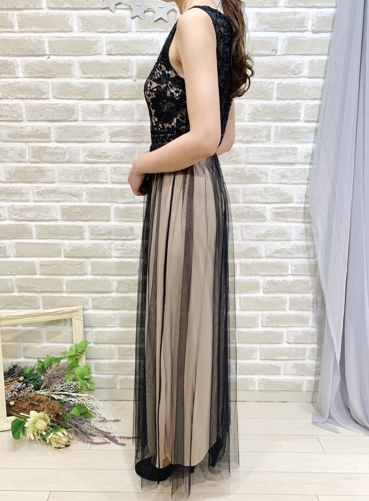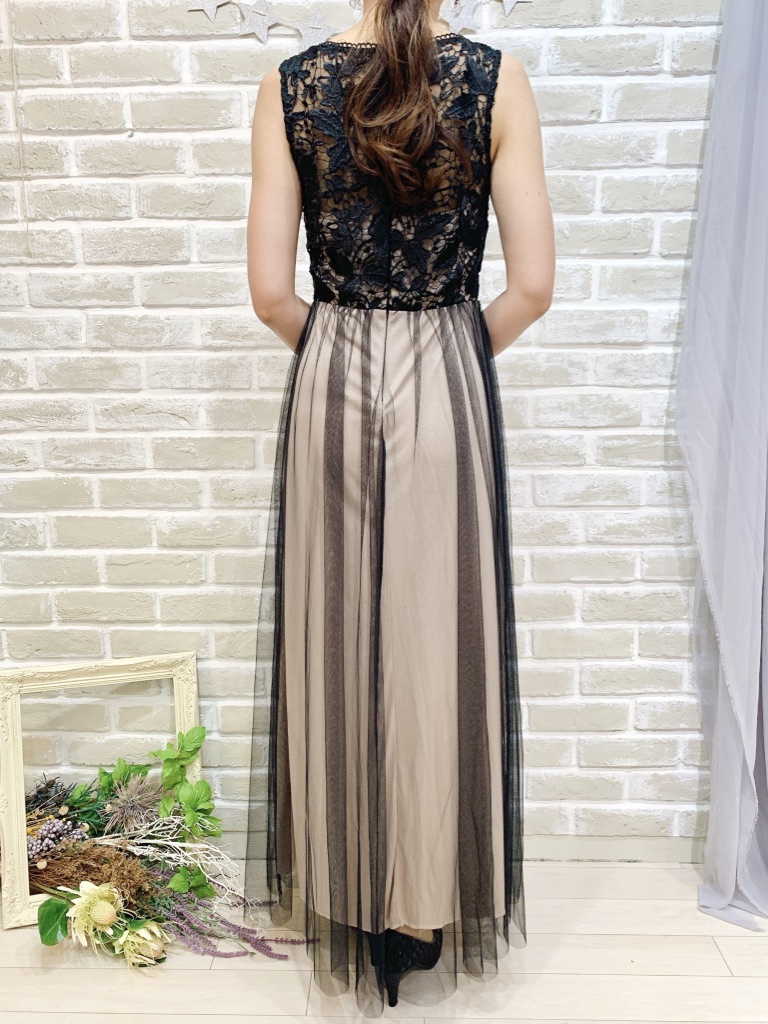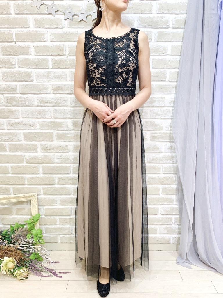 落ち着きのある印象のタンクトップタイプのロングドレス。シックで大人なブラックのレースをボディーに使用し、それを重たく見せないベージュの裏地とチュール生地のスカートで、やりすぎ感を抑えることのできるデザインです。1枚で着用して少しカジュアルなイブニングパーティーや、羽織ものをプラスしてミセスの結婚式参列ドレスとしてもご利用いただけます。肩のあるデザインはネックレスなしでイヤーアクセを大振りにするなど、ポイントを絞って、その代わり合わせる小物はアクセントになるものでコーディネートするのが野暮ったく見せずかっこよくコーディネートするコツです。