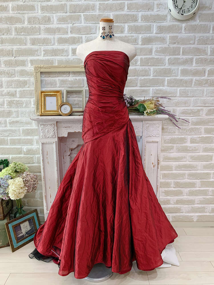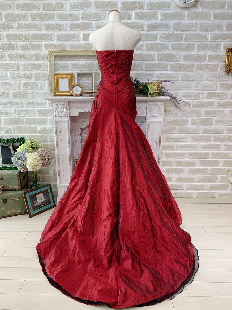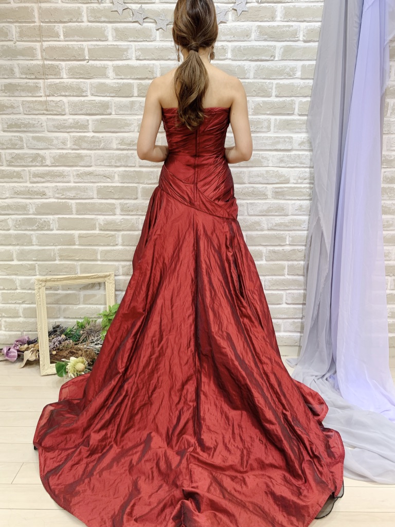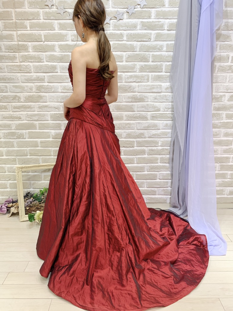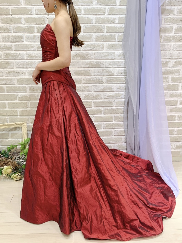 ディープレッドのシンプルなカクテルドレス。シンプルとは言ったものの、うっすら透け感があり角度によって色が変わって見える赤の偏光生地にブラックの生地を内側に重ね、深みを持たせた色味で表情のあるデザインです。後ろのトレーンは長めで、ボディ全体に入ったギャザーも相まってかなり重厚感のある”大人の赤”の印象を持ちます。秋冬の披露宴のお色直しや、前撮り用のカラードレスにぴったりです。前の長さはヒールで調整いただくと、身長が高くない方でも着易い丈感。レッドリップで大人なスタイリングも素敵ですね。