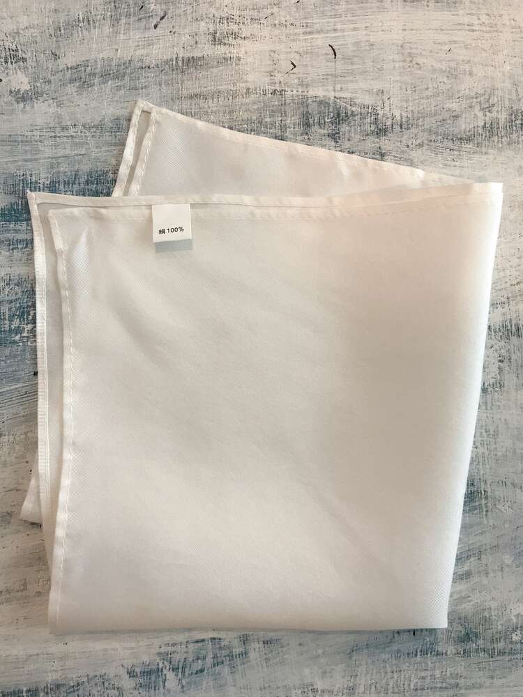 しなやかさと程よい光沢感が特徴的な、シルク100%のポケットチーフです。清潔感を感じさせるシンプルなホワイト。ホワイトといってもシルク本来の優しい生成りがかった上品なお色なので、顏なじみは抜群です。新郎や主賓におすすめ。