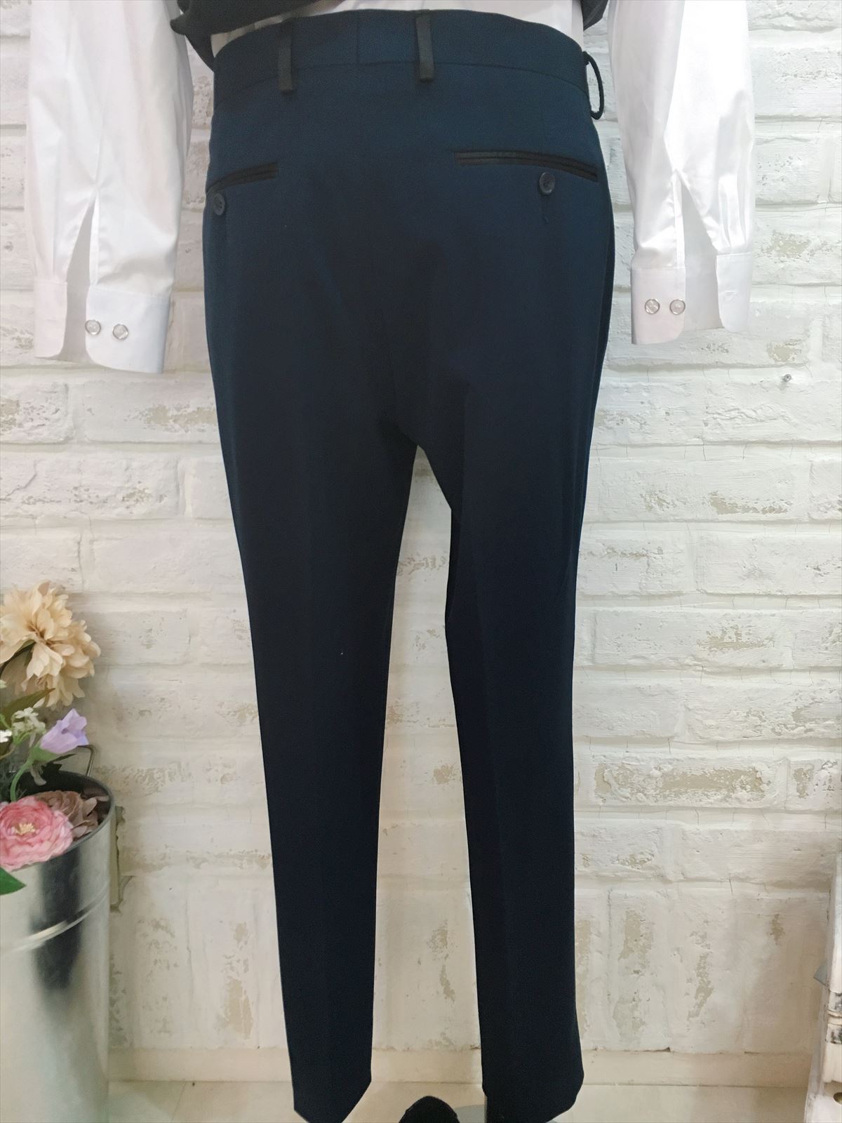 ダークネイビーのパンツはマットな仕上がりで、とても上品な素材です。セットのジャケットと合わせれば暗めな色味でも華やかな印象になります。挙式などにもお使い頂けるデザインとなっておりますので、前撮り写真撮影にもおすすめです。生地感は柔らかいので、長時間着ていても負担は少ないと思います。披露宴のお色直し、二次会、1.5次会、リゾートウェディング、レストランウェディング、パーティー、様々なシーンでご利用頂けます。伸縮性のある素材なので、着心地も抜群です。