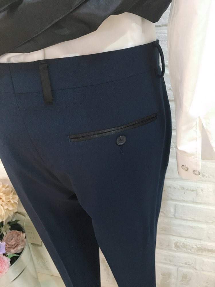 ダークネイビーのパンツはマットな仕上がりで、とても上品な素材です。セットのジャケットと合わせれば暗めな色味でも華やかな印象になります。挙式などにもお使い頂けるデザインとなっておりますので、前撮り写真撮影にもおすすめです。生地感は柔らかいので、長時間着ていても負担は少ないと思います。披露宴のお色直し、二次会、1.5次会、リゾートウェディング、レストランウェディング、パーティー、様々なシーンでご利用頂けます。伸縮性のある素材なので、着心地も抜群です。
