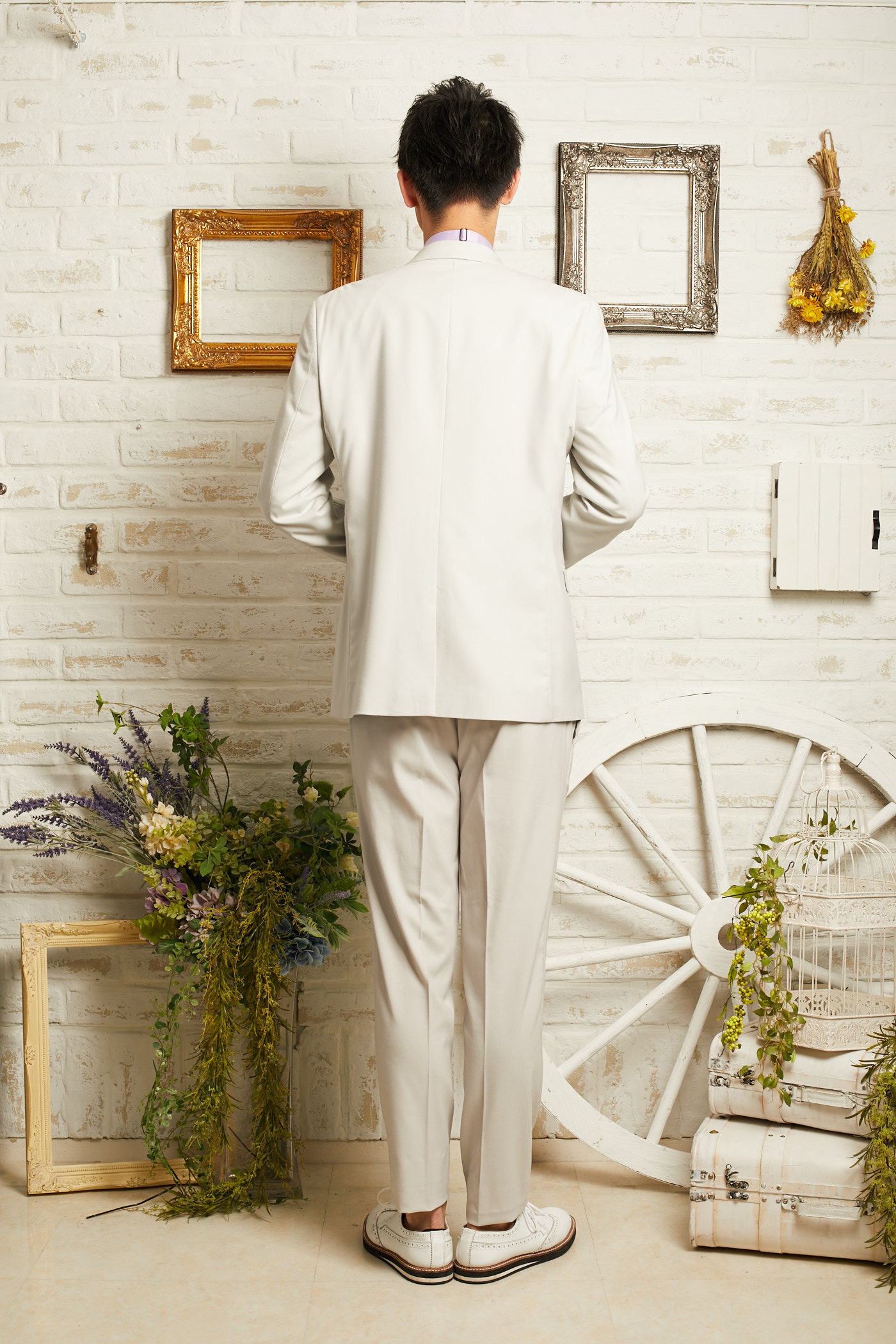 ライトグレーのパンツはとてもシンプルで着る人を選びません。セットのジャケットを合わせればより一層明るく華やかな印象になります。前撮り写真撮影にもおすすめです。生地感は柔らかく、厚くないので、長時間着ていても負担は少ないと思います。披露宴のお色直し、二次会、1.5次会、リゾートウェディング、レストランウェディング、パーティー、様々なシーンでご利用頂けます。シャツをチェック柄やストライプ柄、カラーシャツ、小物としてハットなど合わせてもおしゃれなコーディネートになります。また、ゲスト用タキシードとしてもご利用頂けます。