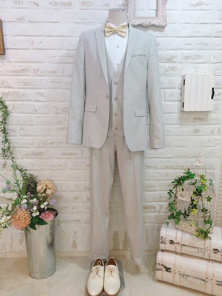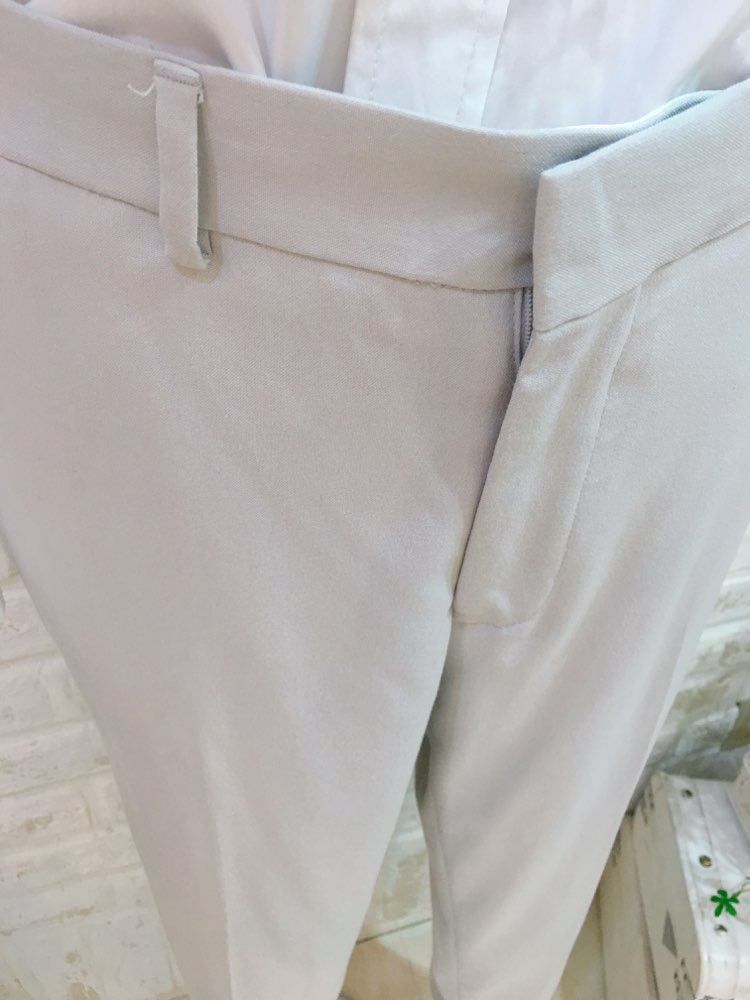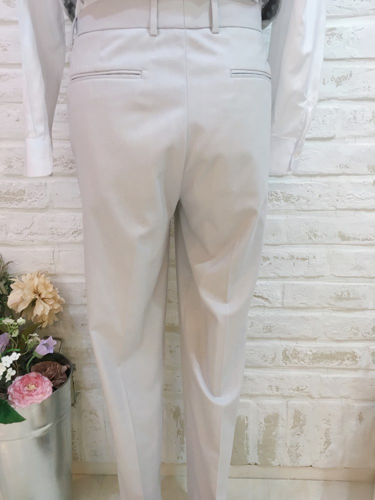 ライトグレーのパンツはとてもシンプルで着る人を選びません。セットのジャケットを合わせればより一層明るく華やかな印象になります。前撮り写真撮影にもおすすめです。生地感は柔らかく、厚くないので、長時間着ていても負担は少ないと思います。披露宴のお色直し、二次会、1.5次会、リゾートウェディング、レストランウェディング、パーティー、様々なシーンでご利用頂けます。シャツをチェック柄やストライプ柄、カラーシャツ、小物としてハットなど合わせてもおしゃれなコーディネートになります。また、ゲスト用タキシードとしてもご利用頂けます。