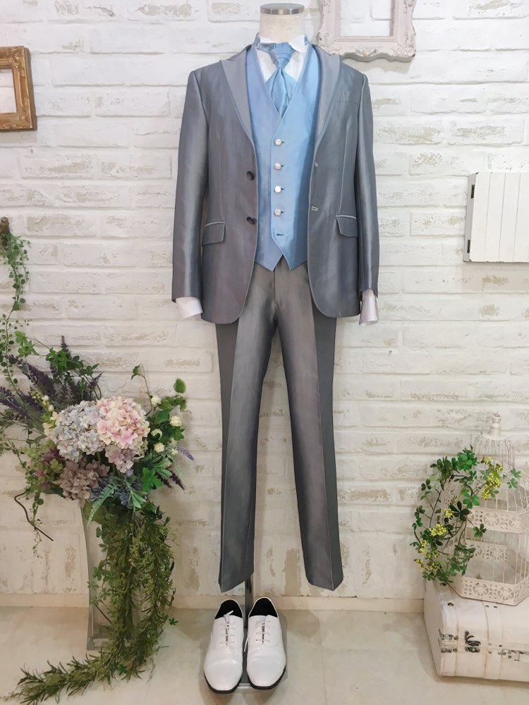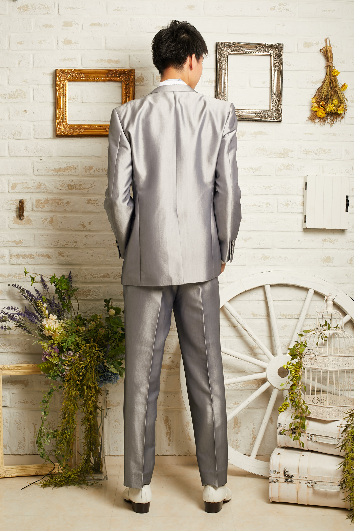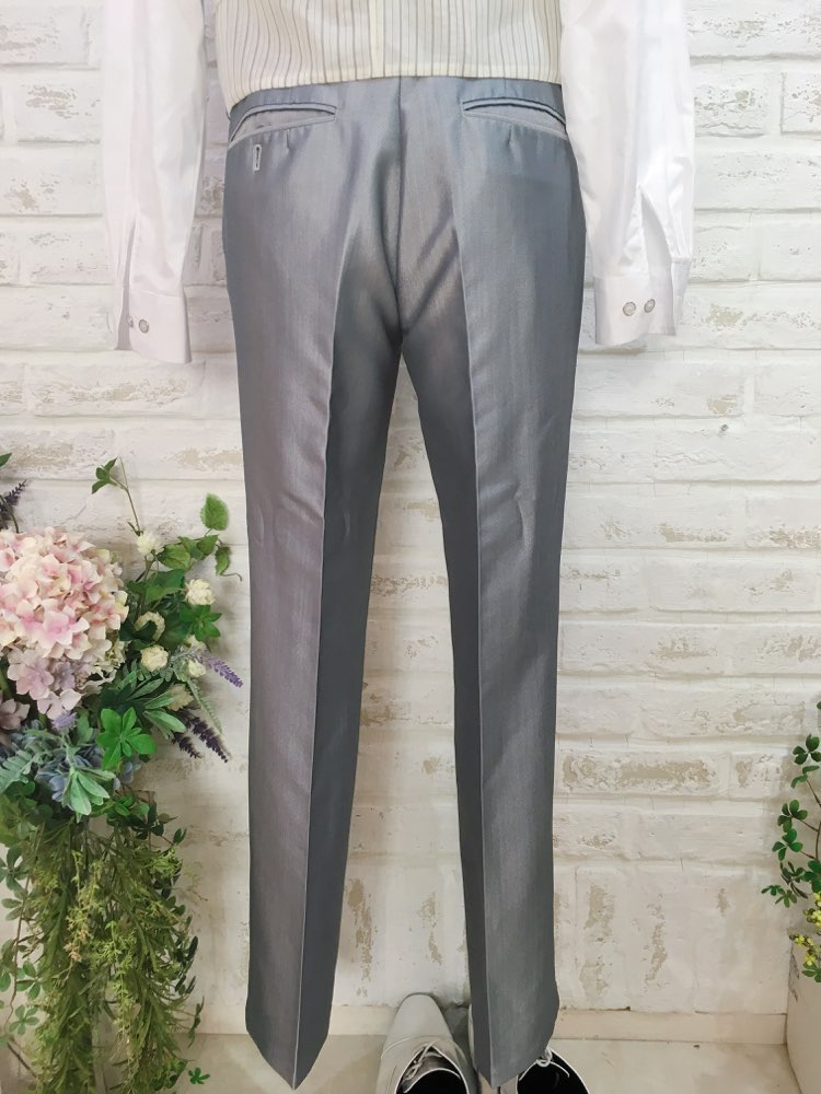 パンツはグレーで光沢感のある上品な素材です。セットのジャケットと合わせれば挙式などにもお使い頂けるデザインとなっておりますので、前撮り写真撮影にもおすすめです。生地感はそれ程厚くないので、長時間着ていても負担は少ないと思います。パンツウェストにはアジャスター付きなので、お客様の丁度いいサイズに合わせる事が可能。