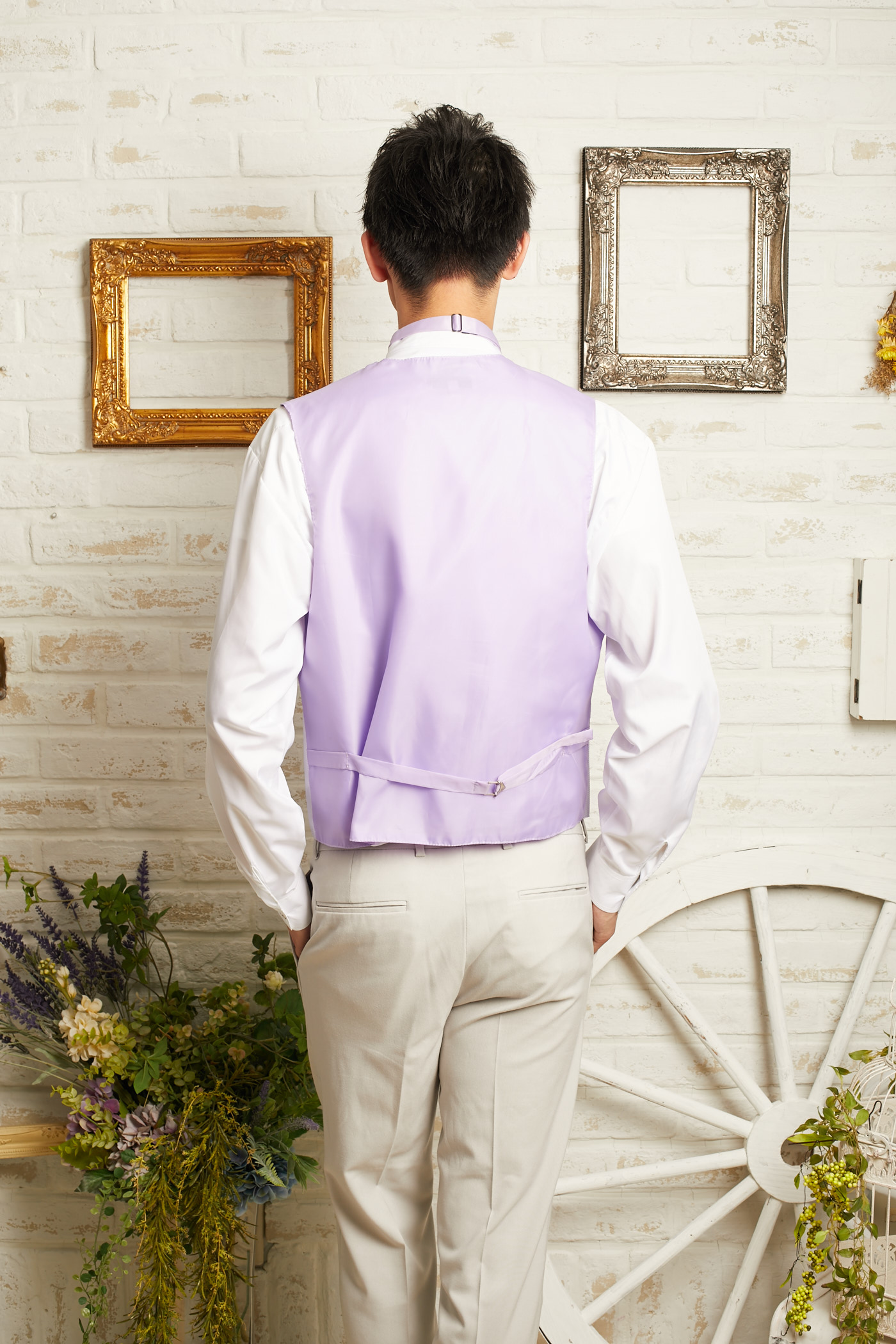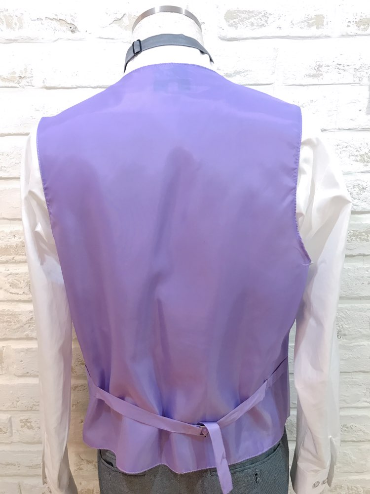 つるっとした肌触りの淡いパープルラベンダーカラー×ストライプ柄ベスト。爽やかなお色味なのでとくに春~夏におすすめの一枚です。セットのタイと合わせてお使い頂くとよりお洒落な印象になります。ウェディングパーティーや前撮り撮影、アッシャー、クルージングパーティーなど様々なシーンに。タグの表記はSサイズですが大きめのつくりなので