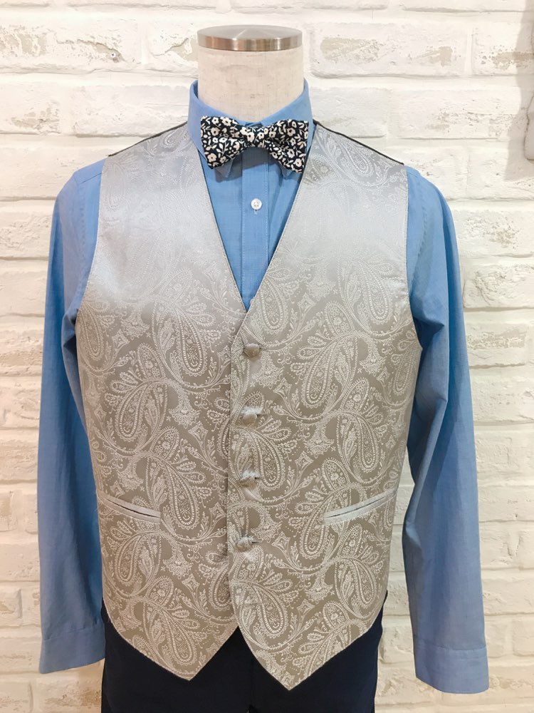 つるっとした肌触りのシルバー地×ペイズリー柄のベスト。光沢感が上品で大人っぽい印象の一枚。セットのネクタイと合わせてお使い頂くとよりお洒落にまとまります。レストランウェディングや前撮り撮影、授賞式、レセプションパーティーなど幅広いシーンに。タグの表記はXLサイズですが大きめのつくりなので