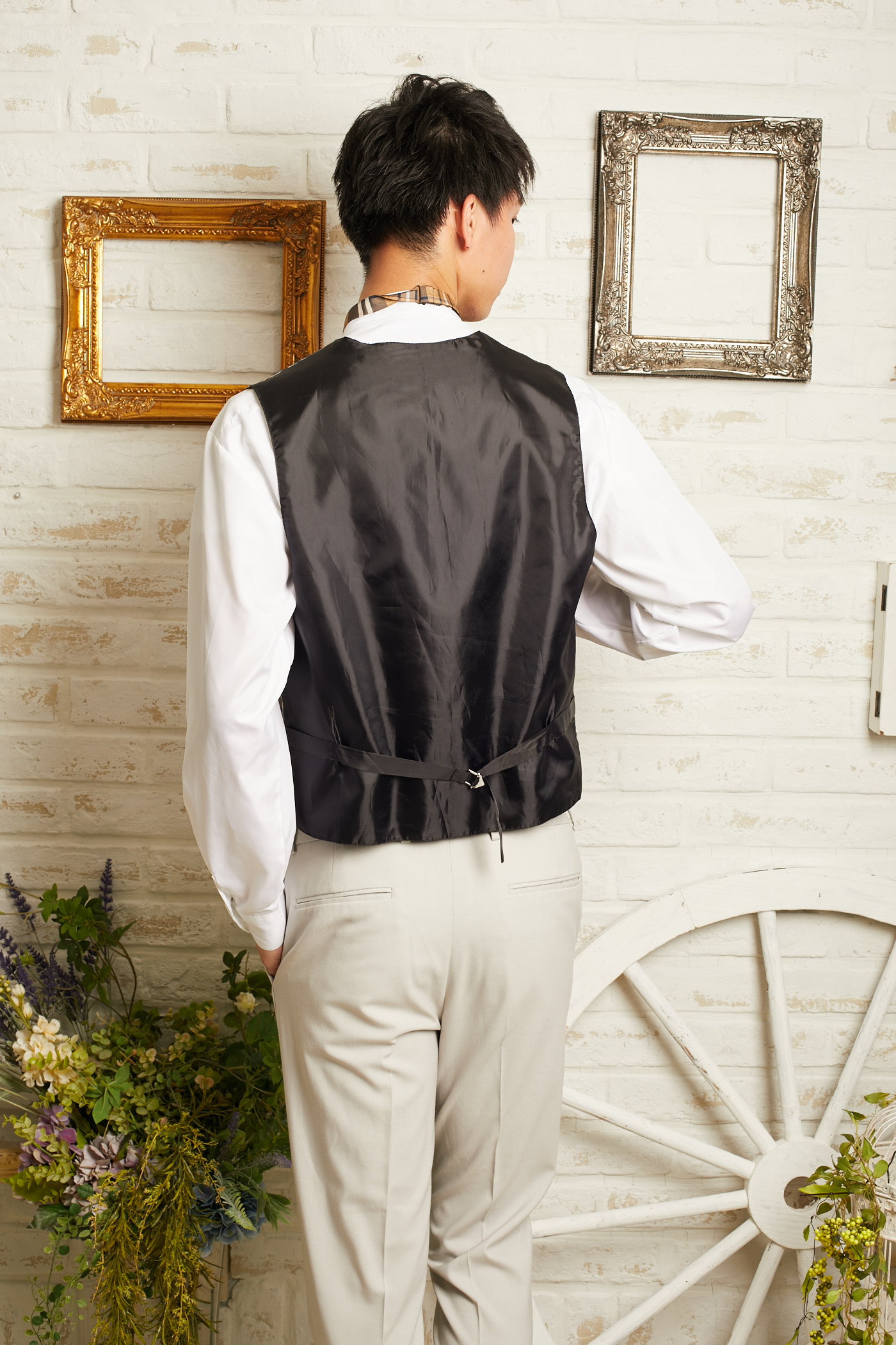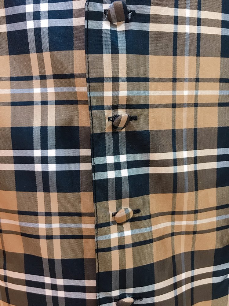 つるっとした肌触りのキャメル地×マドラスチェック柄ベスト。パッと目に引くデザインなのでコーディネートの主役にしたい一枚。秋冬の各種パーティーにおすすめです。セットのタイと合わせてお使い頂くとよりお洒落な印象に。タグの表記はXSサイズですが大きめのつくりなので
