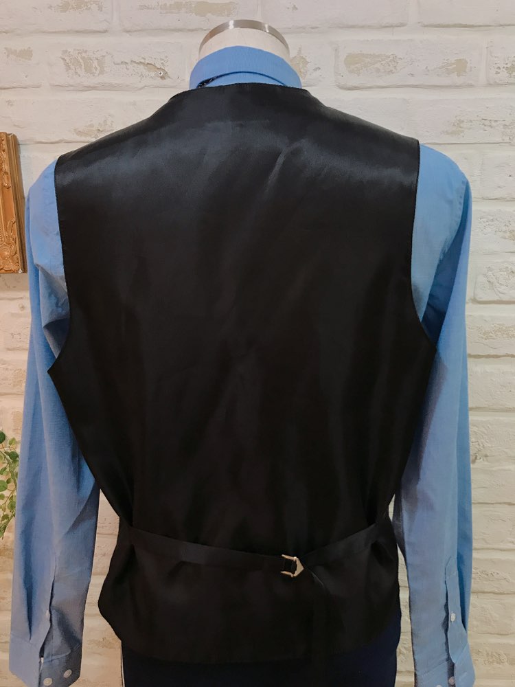 つるっとした肌触りのネイビー×ストライプのベスト。程良い光沢感が上品で大人っぽい印象の一枚。セットのタイと合わせてお使い頂くとよりお洒落にまとまります。レストランウェディングや前撮り撮影、授賞式など幅広いシーンに。タグの表記はLサイズですが大きめのつくりなので