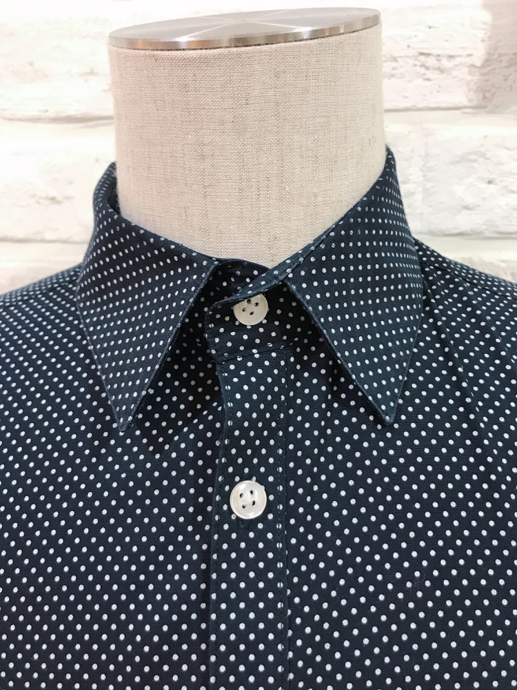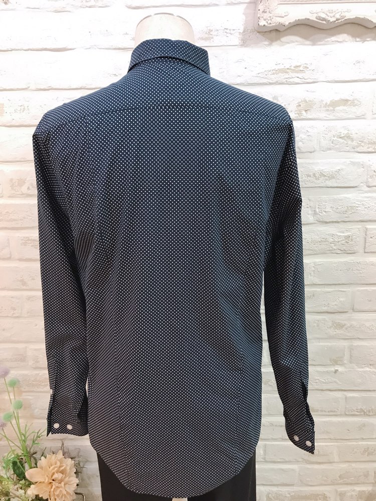 ネイビーブラック×ホワイトドットのポリエステル混紡素材の長袖シャツ。つるっとした生地感。レギュラーカラー。ブラック、ネイビー、ホワイト、グレー、ライトブルー、ブルー、ピンク等の無地タキシードやジャケットと相性が良いです。ノージャケットのベストスタイルもおすすめです。他の小物との組み合わせによってモード風にも、レトロ風にも着こなせる水玉柄です。イージーアイロン加工でシワいらず。袖口周りをボタンで調節できます。裾はラウンドカット。レギュラーフィット?動きやすいゆとりがあり、ウエスト部分をゆるやかに絞ったクラシックなフィット。着心地のよいテーラードシルエットを創り出します。普段Lサイズを着用されている方におすすめです。