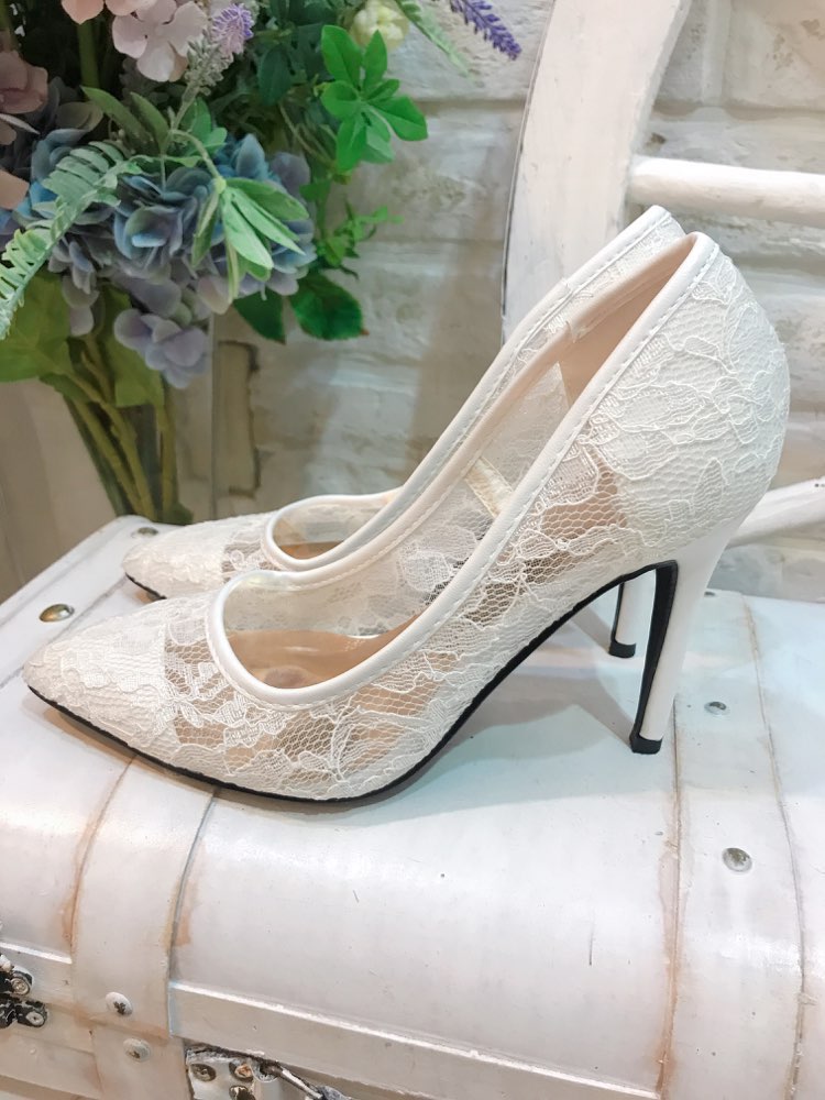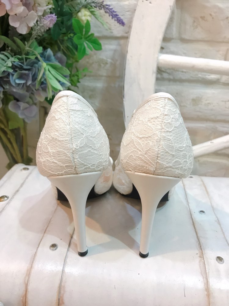 上品なシルエットと繊細なレースワークが目を引く10cmヒールパンプス。美脚度の高いポインテッドトゥのすっきりしたフォルムと、少し高めの華奢なヒールが女性らしく品のある印象に。結婚式や2次会など華やかなシーンに履きたい1足。