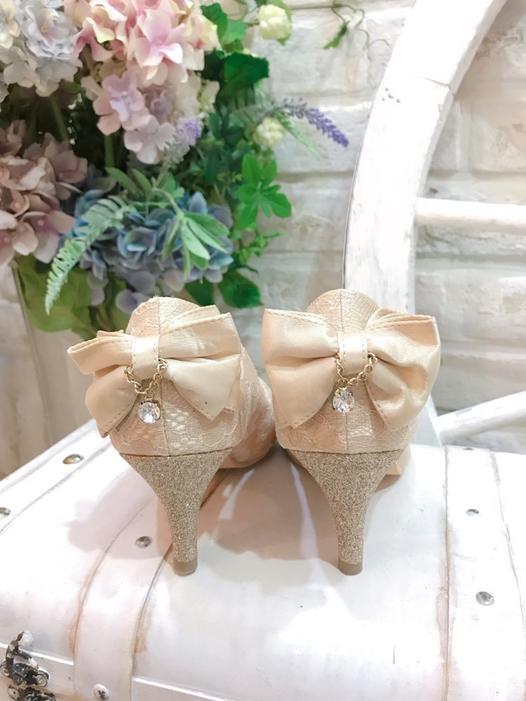 マルチにつかえる大人可愛いベージュカラーのパンプスです。一見シンプルなデザインですが、バックデザインにこだわりが盛り込まれている一足。後姿まで気を抜かない女心くすぐる、大ぶりのバックりぼんに、ヒールのグリッターが輝きをプラス。 また、歩くたびに揺れるチャームも気分を盛り上げます。 つま先は「アーモンドトゥ」で足元を優しい印象に見せてくれるのも魅力です。 履き心地も良くクッション性の高いインソールで、たくさん歩く日も安心。 ドレスアップの機会にぜひご利用ください♪