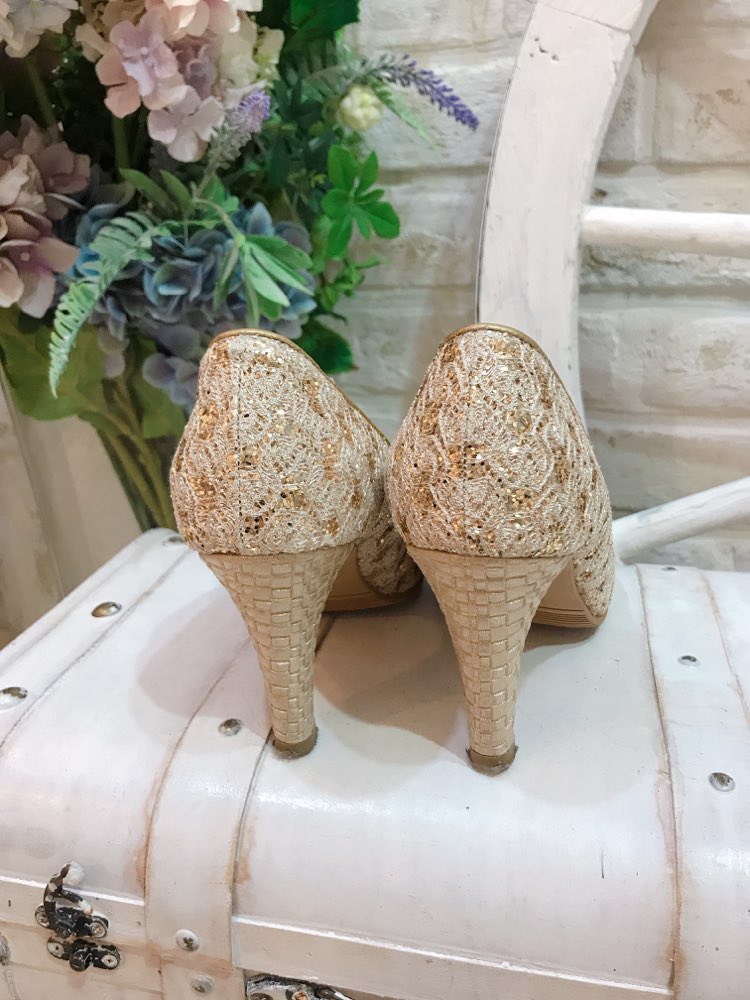 ゴールドのラメが全体にあしらわれた、キラキラと華やかなパンプス。ゴールドカラーなのでどんなドレスとも相性抜群。パーティ・結婚式・2次会と様々なシーンで活躍する1足です。2.5cmのストーム×8cmヒールの前底プラットフォームパンプスなので長時間履いても足が疲れにくく、同時にスタイルアップも叶えてくれる優れモノ◎ サイズ展開も豊富に取り揃えております。