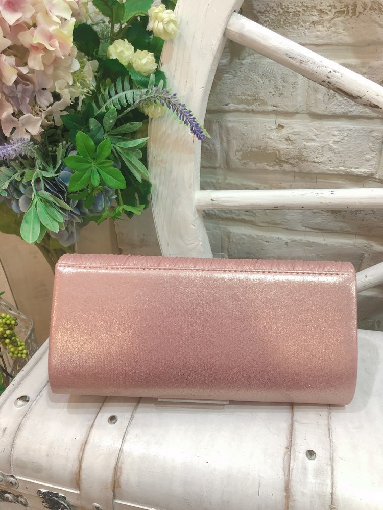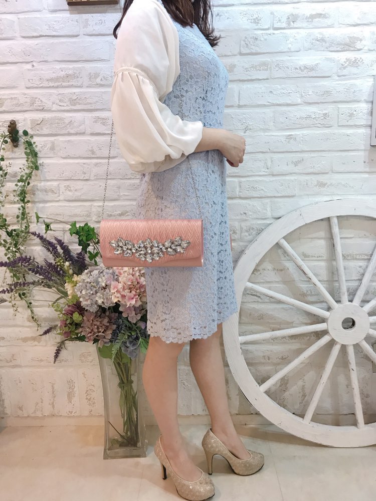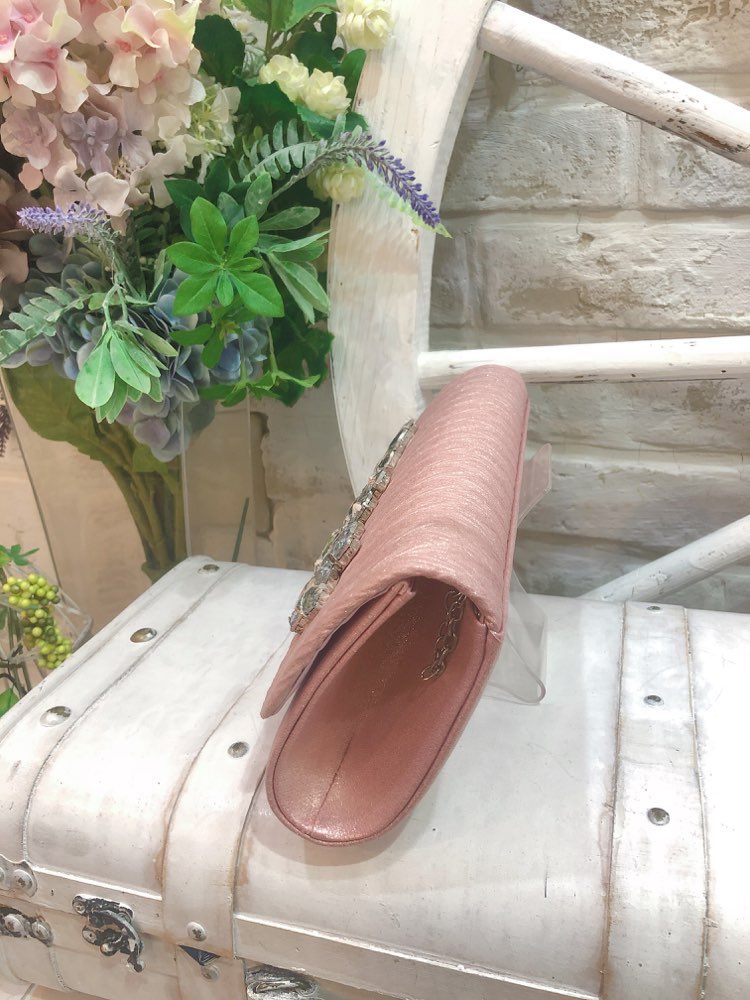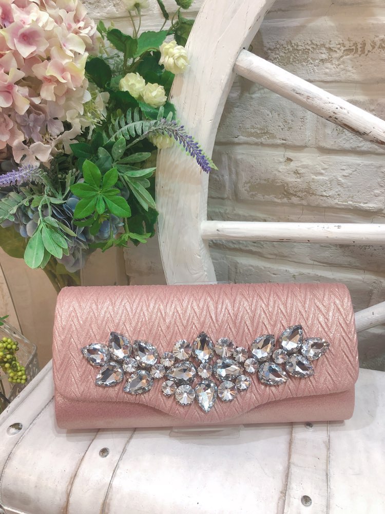 パールピンクのクラッチバッグ。キラキラとした大きめのストーンがお花の形にあしらわれていてとても華やかです。コーディネートのアクセントにピッタリです。チェーン付きの2way仕様なので、利用シーンによって持ち方を替えられるのも嬉しいポイントです。袱紗が入る大きさで、収納力もあり抜群の機能性。結婚式や二次会、各種パーティなど華やかな場面にぴったりなバッグです。