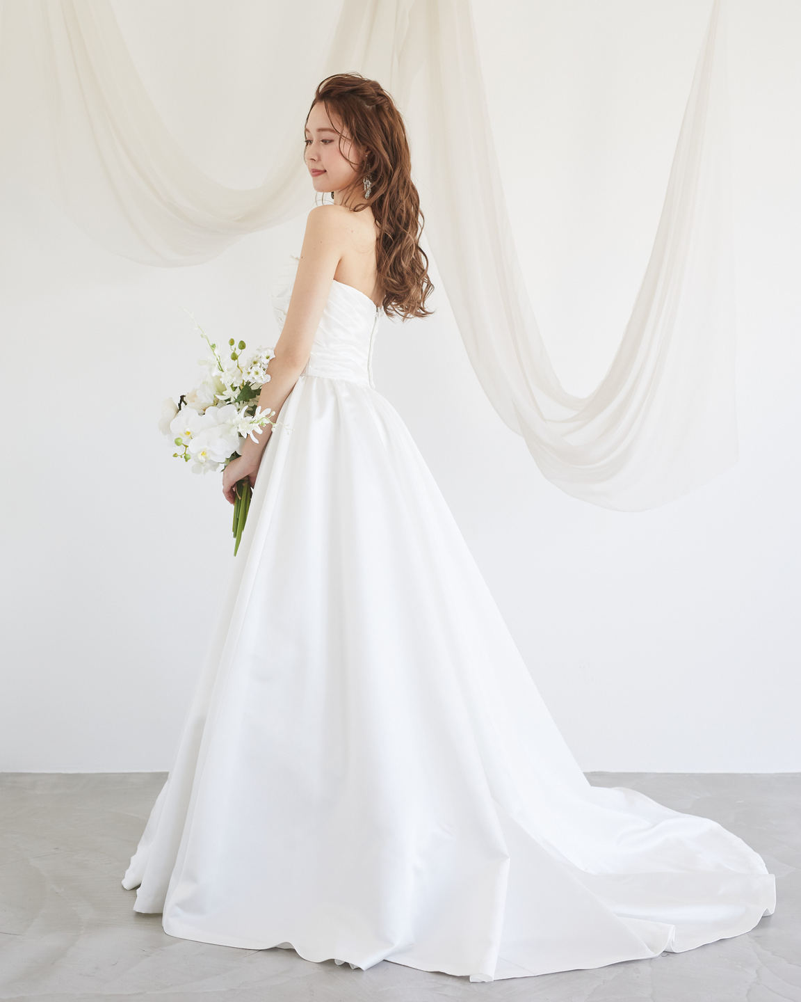 クラシックなオフホワイトのドレス。ハリのある生地感です。裏地にはたっぷりとハードチュールが入っているのでパニエを入れなくてもボリュームが出るデザインです。ティアラやグローブを合わせて挙式用でもお使いいただけます。シンプルだからこそ着ている人を引き立たせてくれるデザインです。そのままでも十分素敵ですが、サッシュベルトを巻いたアレンジもお勧めです。二次会や結婚パーティ等幅広いシーンでお使いいただけます。光沢があるのでシルバーまたはゴールドの石がついたアクセサリーと相性が良いです。