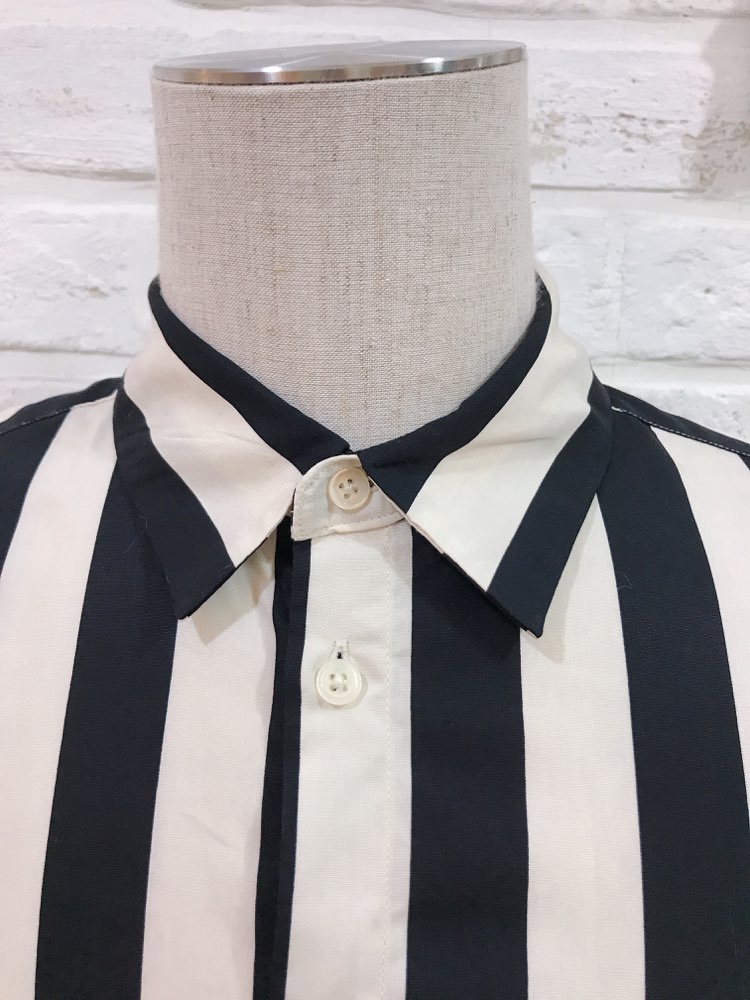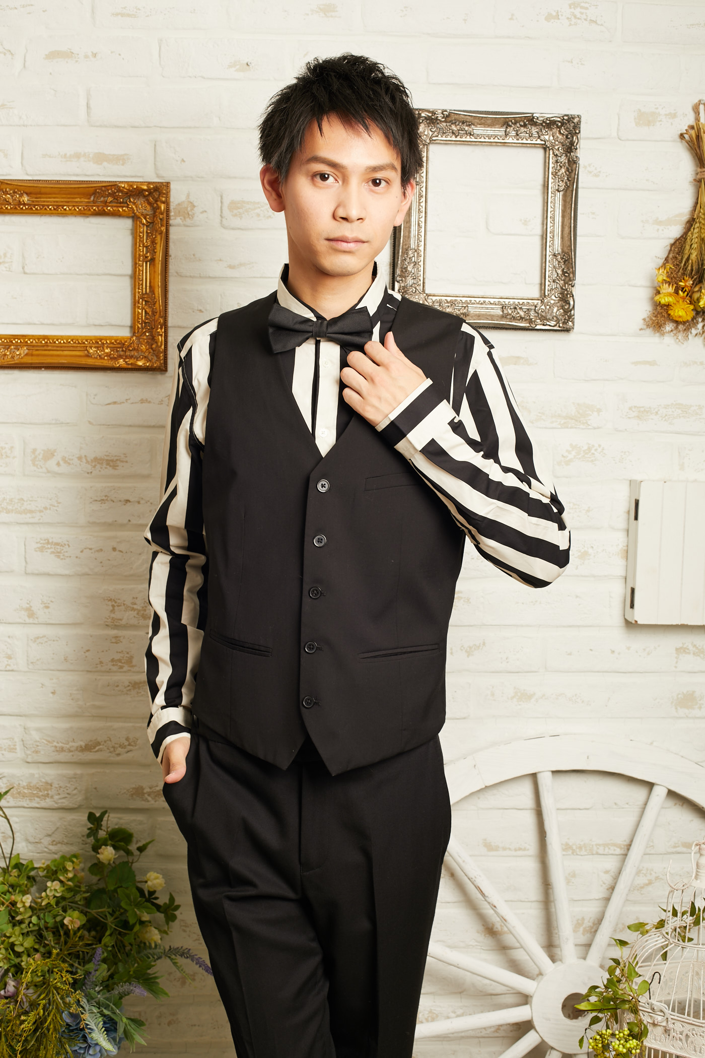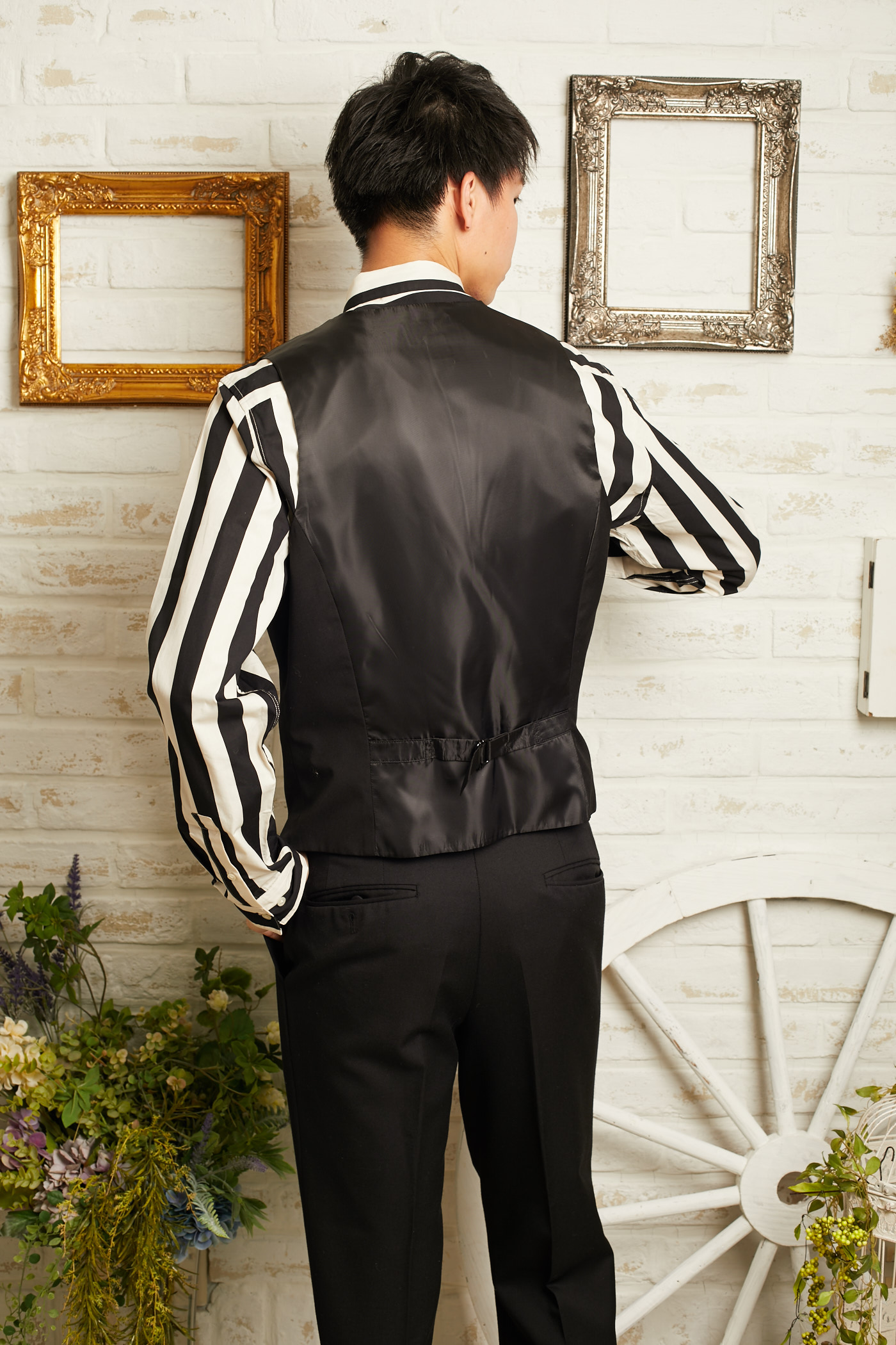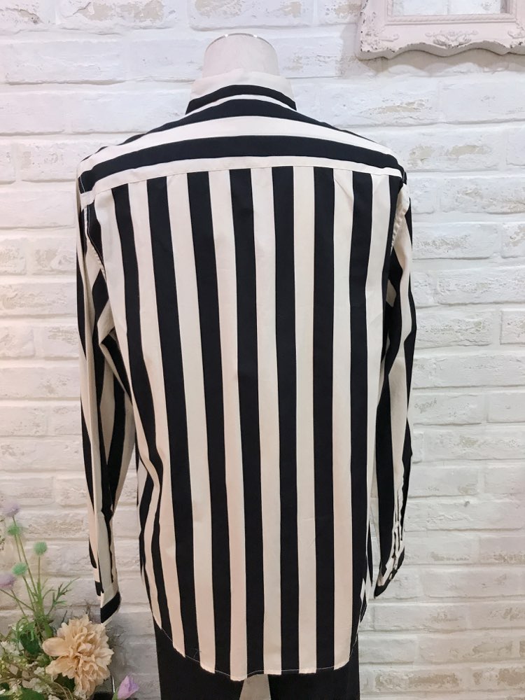 ブラック×ベージュのストライプ柄のコットン素材の長袖シャツ。つるっとして若干光沢のある生地感。レギュラーカラー。ネイビー、ブラック、ブルー、ホワイト、グレー、ピンク、グリーン等の無地タキシードやジャケットと相性が良いです。ノージャケットのベストスタイルやサスペンダースタイルにもよく合います。インパクトのある柄ですので結婚式の主役のほか、イベントやパーティでも着用いただける一枚です。袖口周りをボタンで調節できます。裾はラウンドカット。レギュラーフィット?動きやすいゆとりがあり、ウエスト部分をゆるやかに絞ったクラシックなフィット。着心地のよいテーラードシルエットを創り出します。
