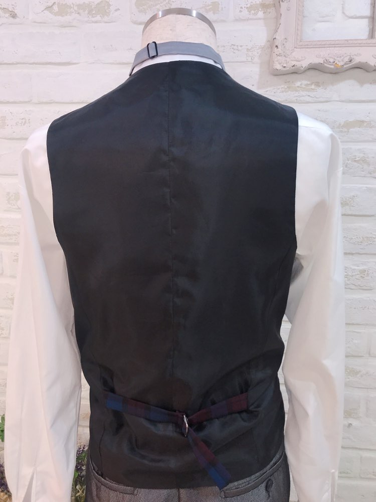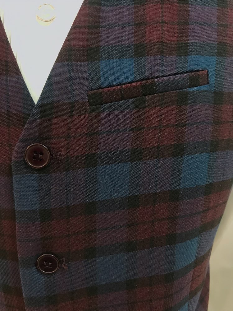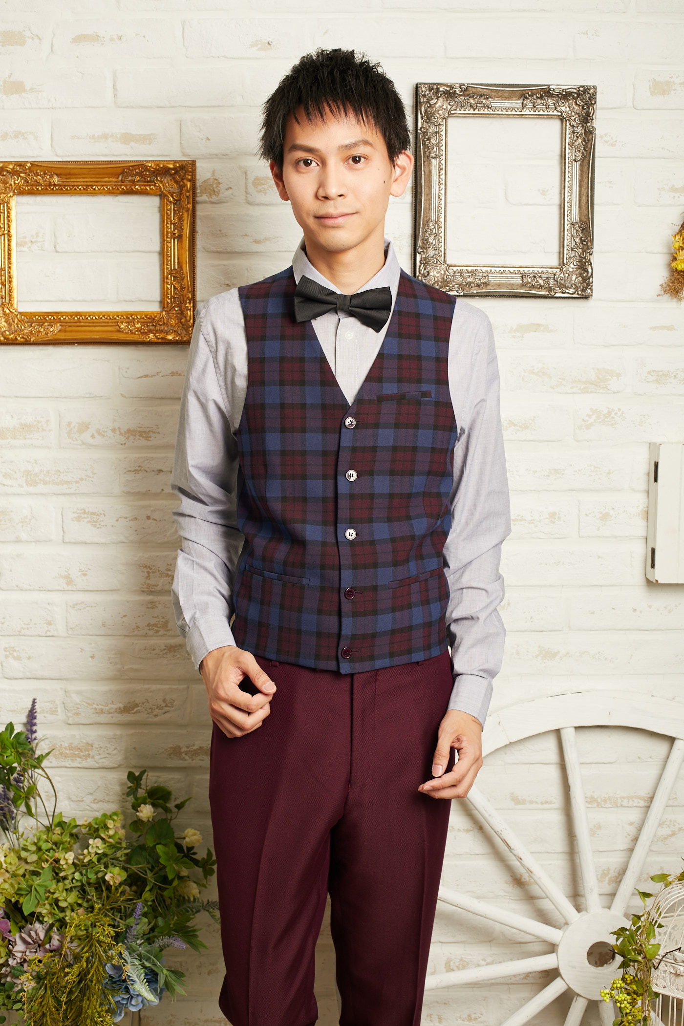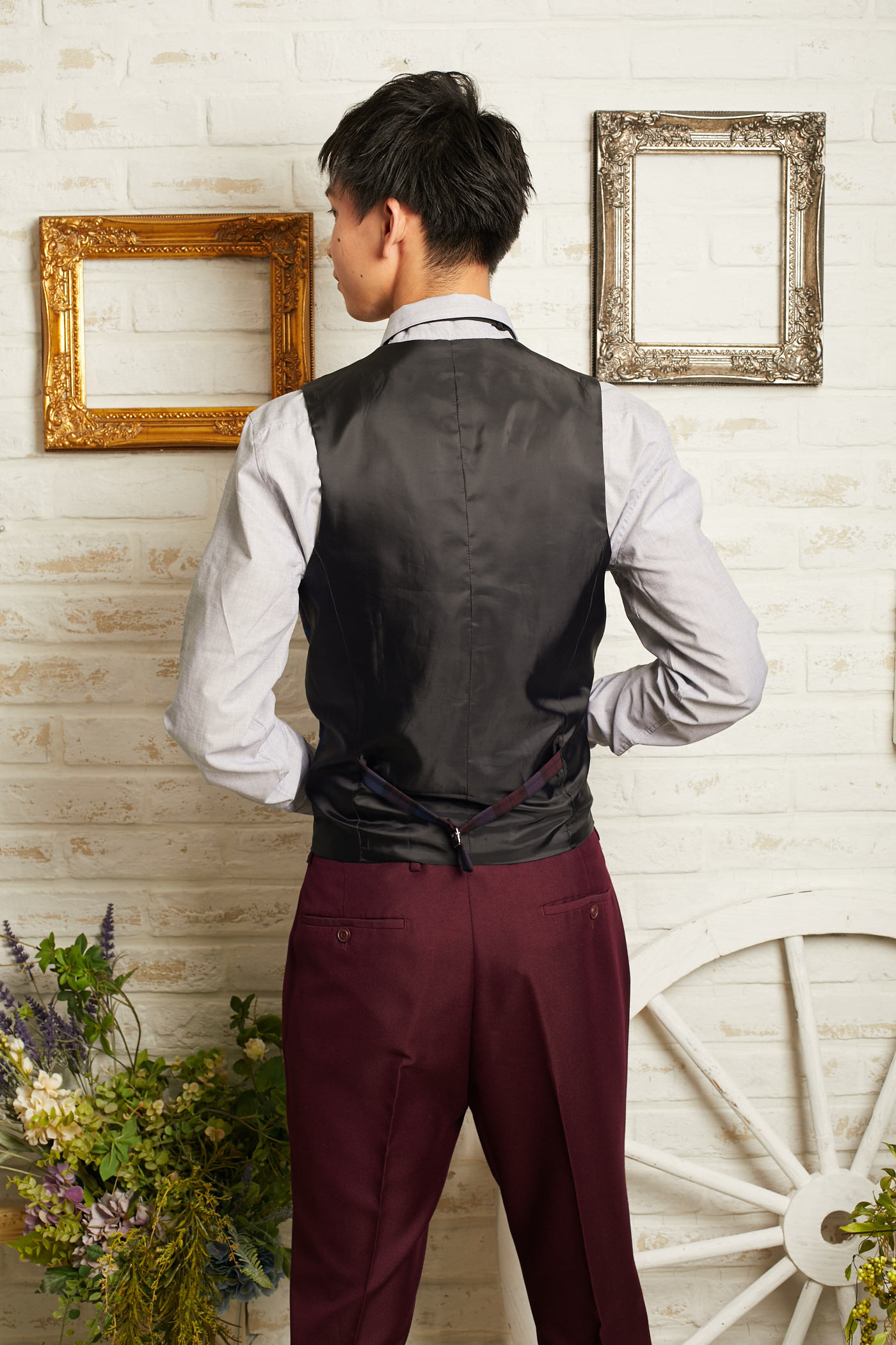 ネイビー×ボルドーのブロックチェック柄ベスト。後身頃はブラックのつるっとした素材。このベストは単品の展開です。ネイビー、ホワイト、ブラック、ブルー、ボルドーなど無地のジャケットと相性が良いです。パンツもジャケットとセットのものを履いていただくとまとまりのあるコーディネートになります。ホワイトデニムとの相性も良いです。ノージャケットのベストスタイルでカジュアルな二次会タキシードとしても素敵。その他パーティースーツ・二次会・海外ウェディング・フォトウェディング、前撮りにまで幅広いシーンでご使用いただけます。オールシーズンに適しています。