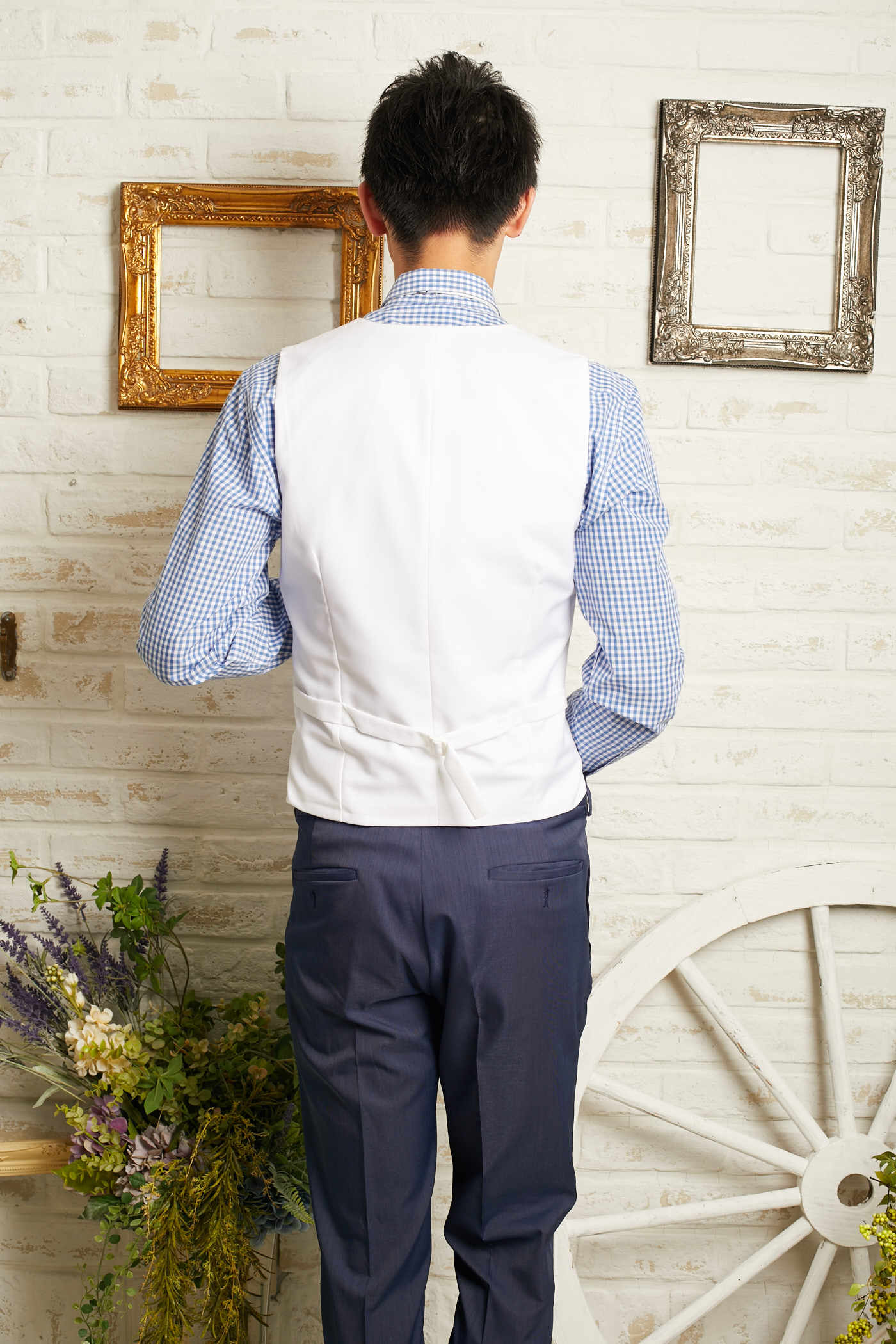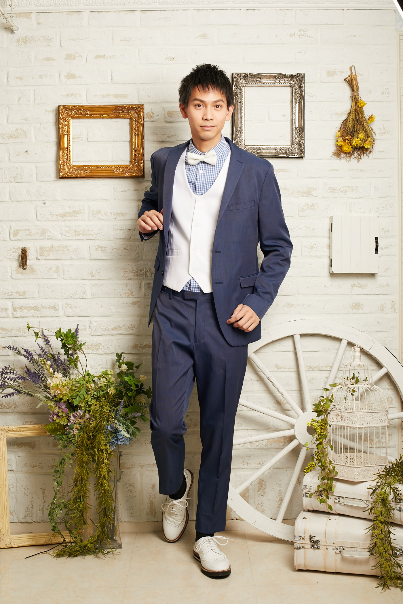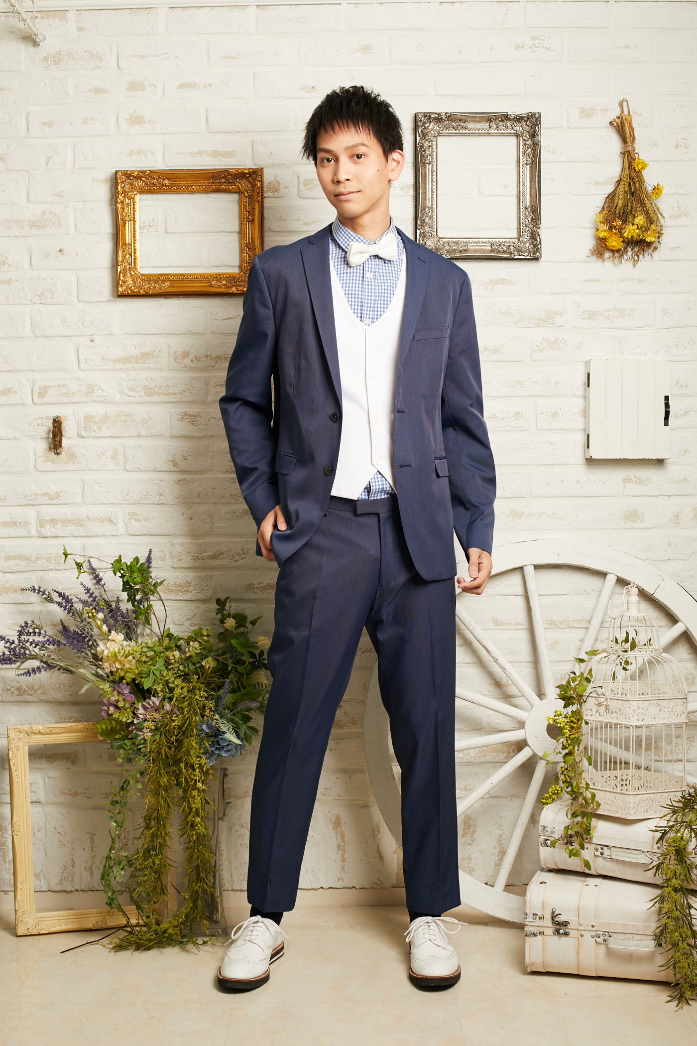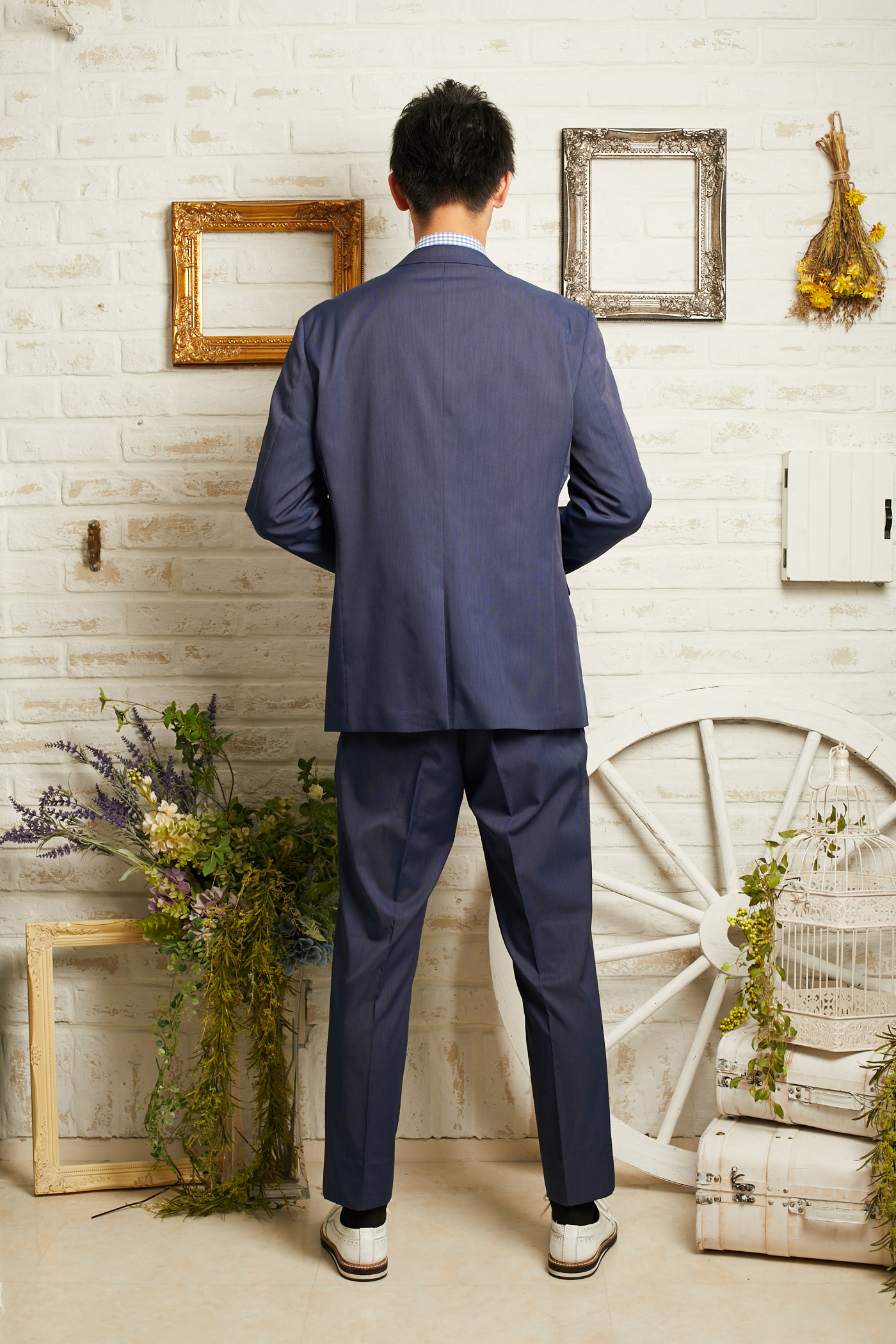 明るめのネイビーのパンツはとてもシンプルで着る人を選びません。セットのジャケットを合わせればより一層華やかな印象になります。前撮り写真撮影にもおすすめです。生地感は柔らかく厚くないので、長時間着ていても負担は少ないと思います。披露宴のお色直し、二次会、1.5次会、リゾートウェディング、レストランウェディング、パーティー、様々なシーンでご利用頂けます。シャツをチェック柄やストライプ柄、カラーシャツ、小物としてハットなど合わせてもおしゃれなコーディネートになります。また、ゲスト用タキシードとしてもご利用頂けます。