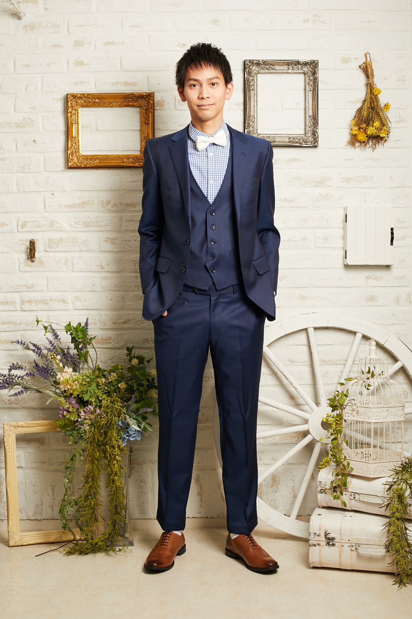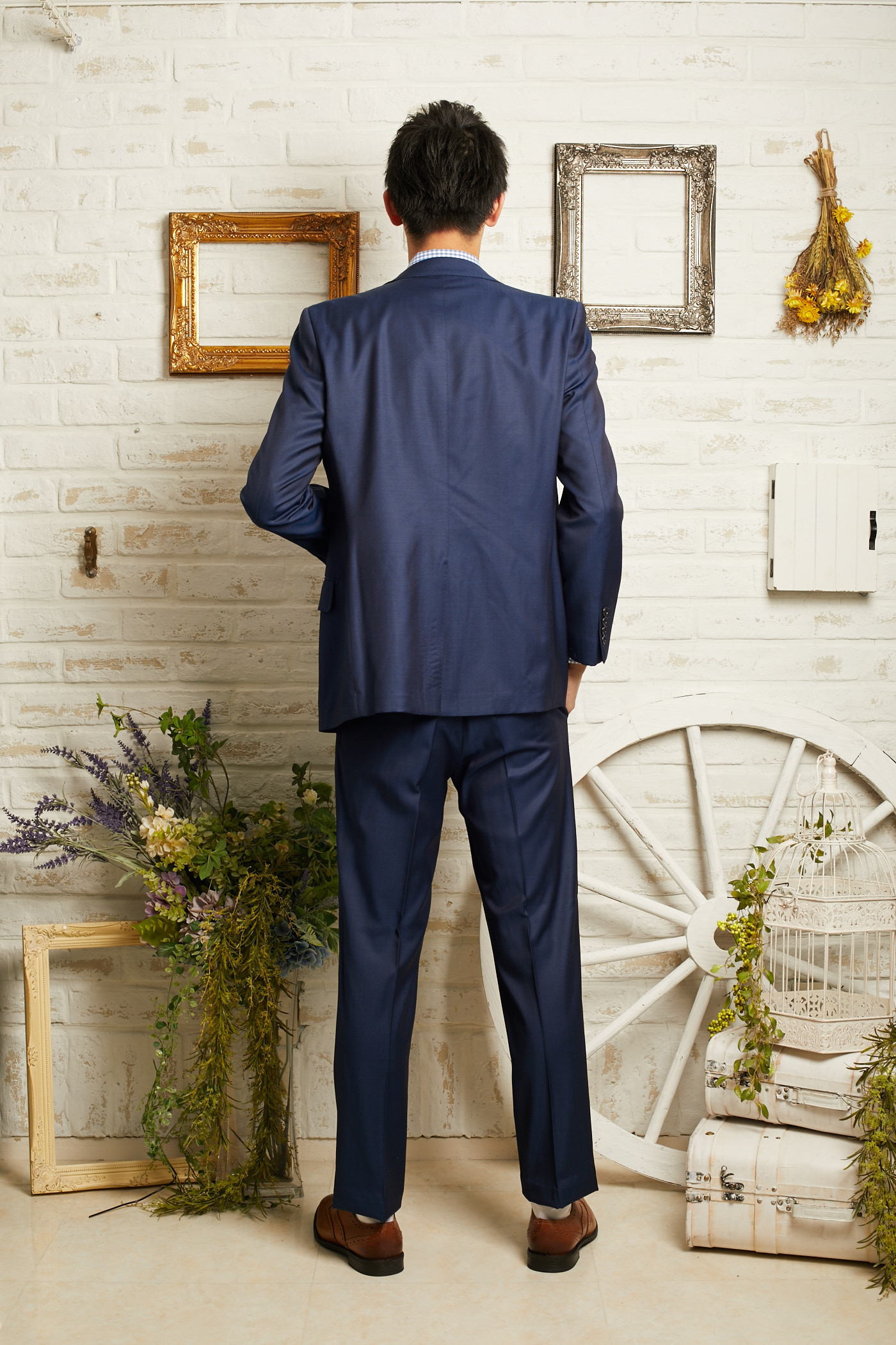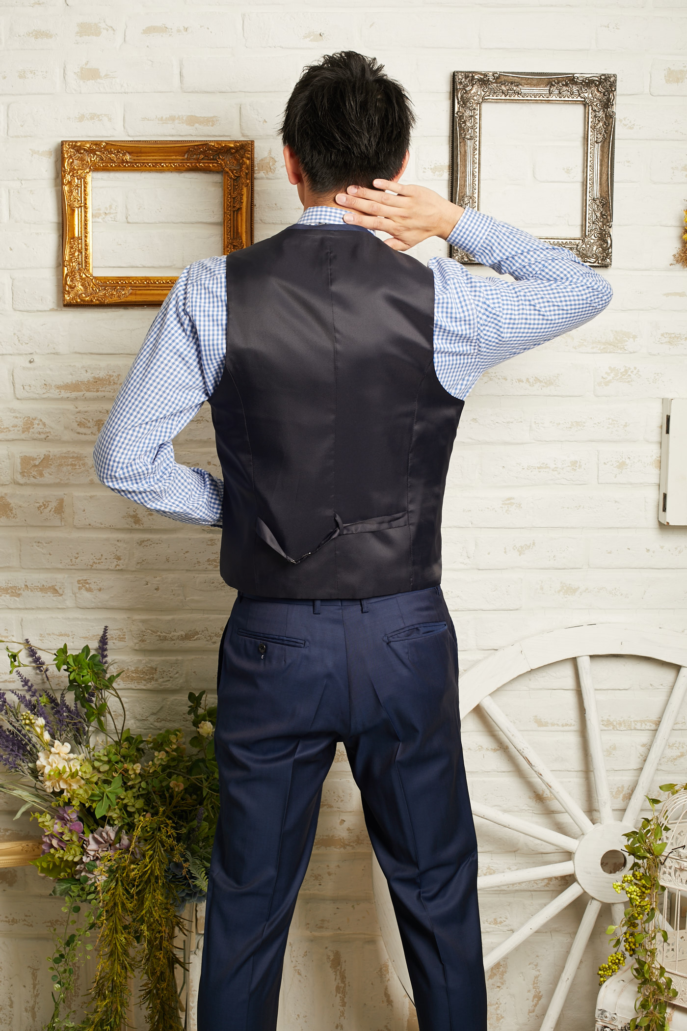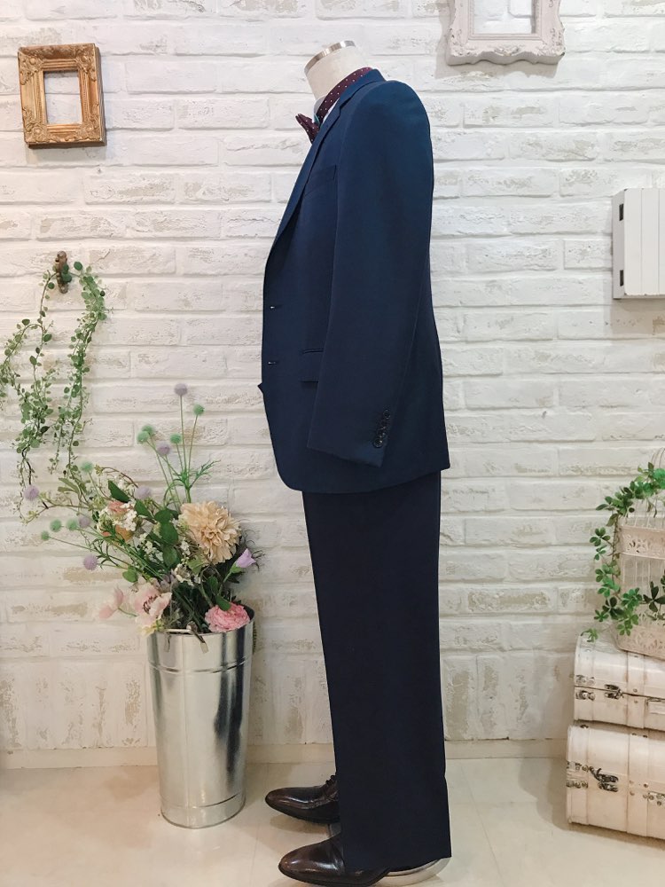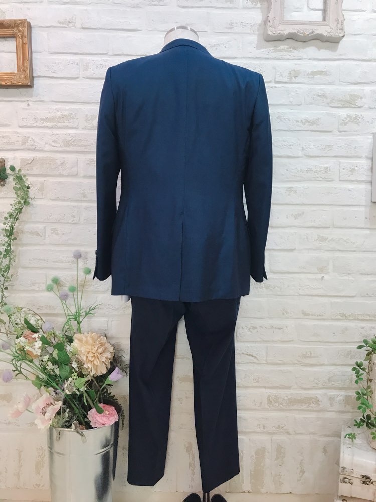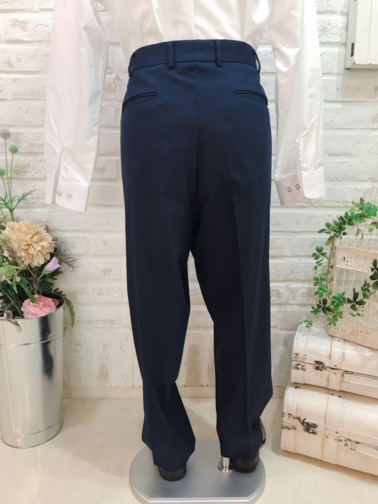パンツは明るめのネイビーカラー。セットのジャケットとセットのベストと合わせて、リゾートウェディング、レストランウェディング、2次会、1.5次会などカジュアルウェディングにおすすめなデザインとなっております。前撮り写真撮影にもおすすめです。生地もさらっとしていて柔らかいので、夏場や長時間着て頂いても疲れにくいと思います。とてもシンプルなデザインなのでゲストタキシードとしてもご利用いただけます。