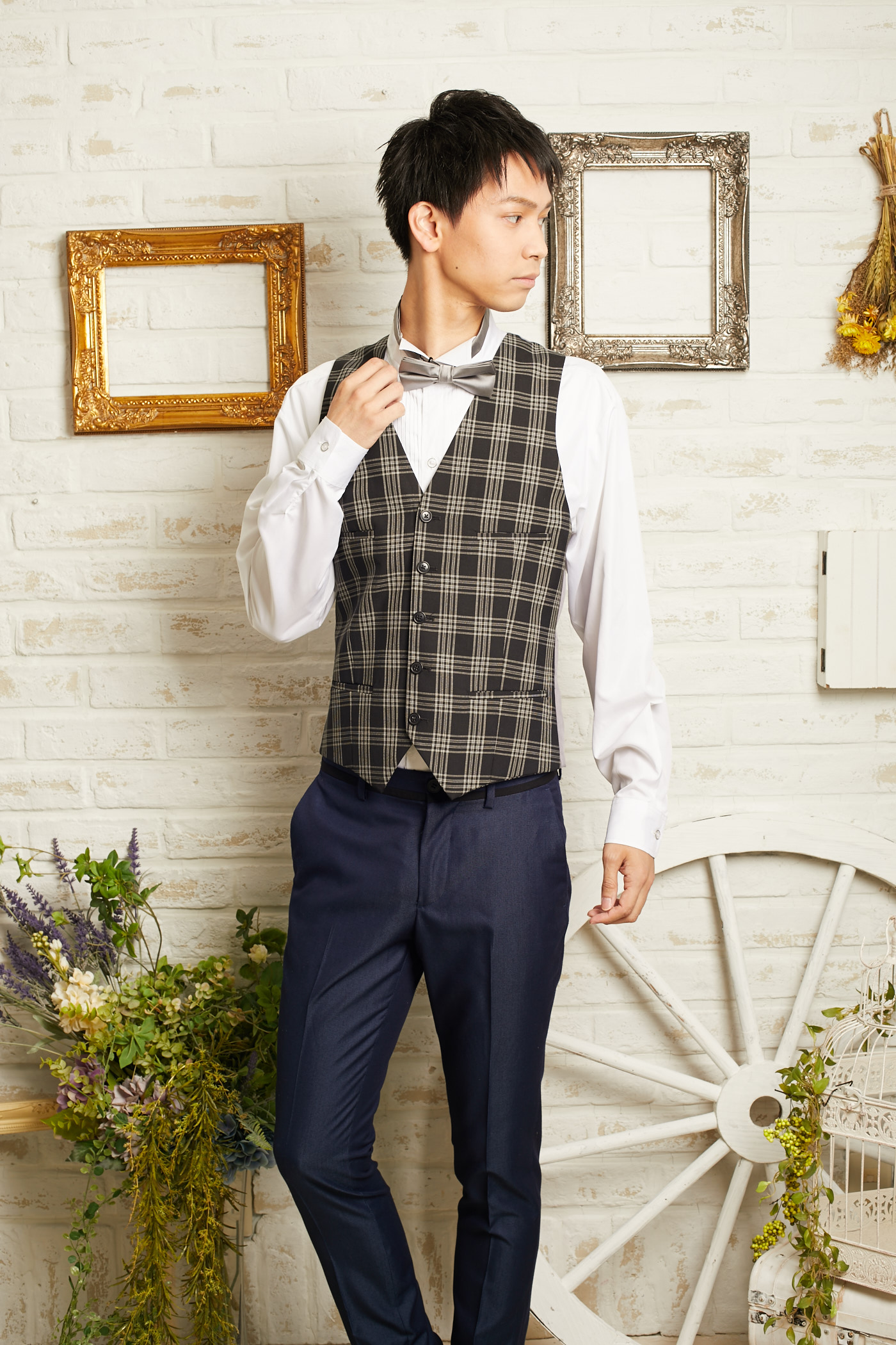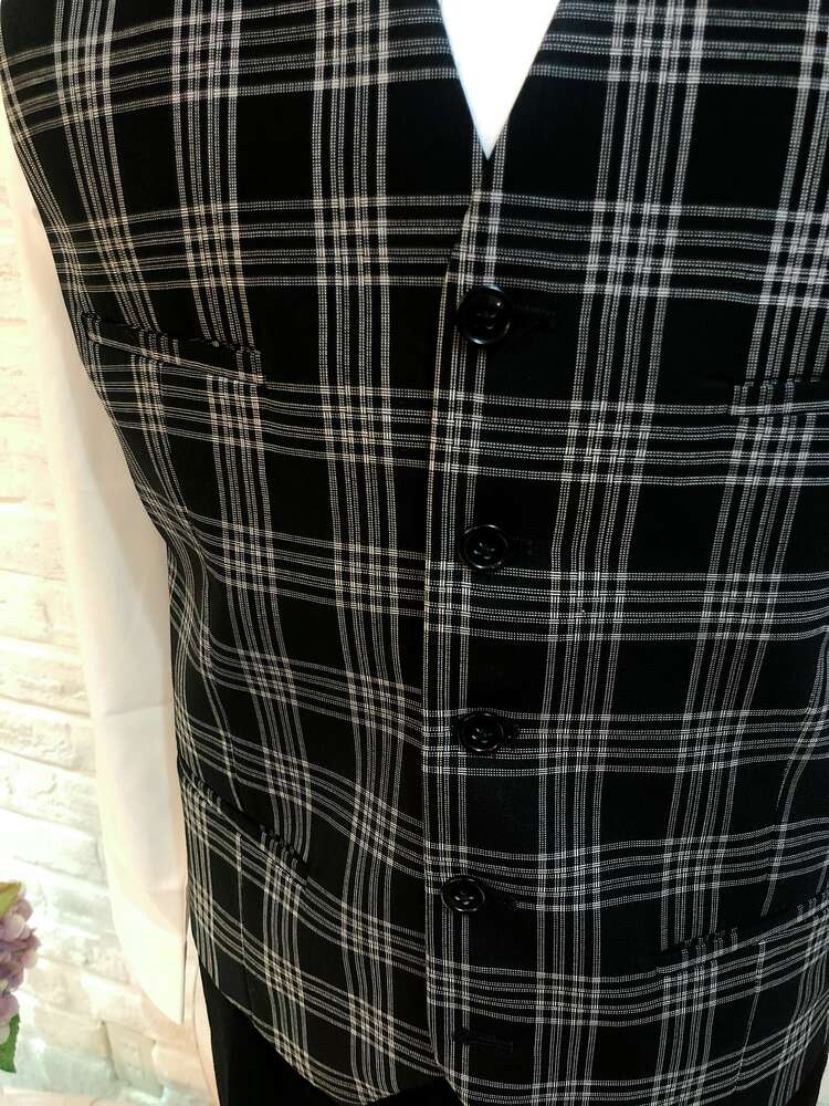 ブラック×ホワイトのタータンチェック柄ベスト。ざらざらした生地感。このベストは単品の展開です。ブラック、ホワイト、ネイビー、ブラウン、ベージュ、ブルー、グリーン、ピンク、ライトブルーなど、どんな色のシャツやジャケットとも相性のいい万能なベストです。パンツは上下の組み合わせを変えてホワイトデニムや柄のパンツ等を合わせても可愛いです。ノージャケットのベストスタイルでカジュアルな二次会タキシードとしても素敵。白のウィングカラーシャツを合わせればきちんとした披露宴向けのフォーマルなコーディネートになります。披露宴・結婚式・ゲスト/結婚式の参列にも。その他パーティースーツ・二次会・海外ウェディング・フォトウェディング、前撮りにまで幅広いシーンでご使用いただけます。オールシーズンに適している定番の一枚です。