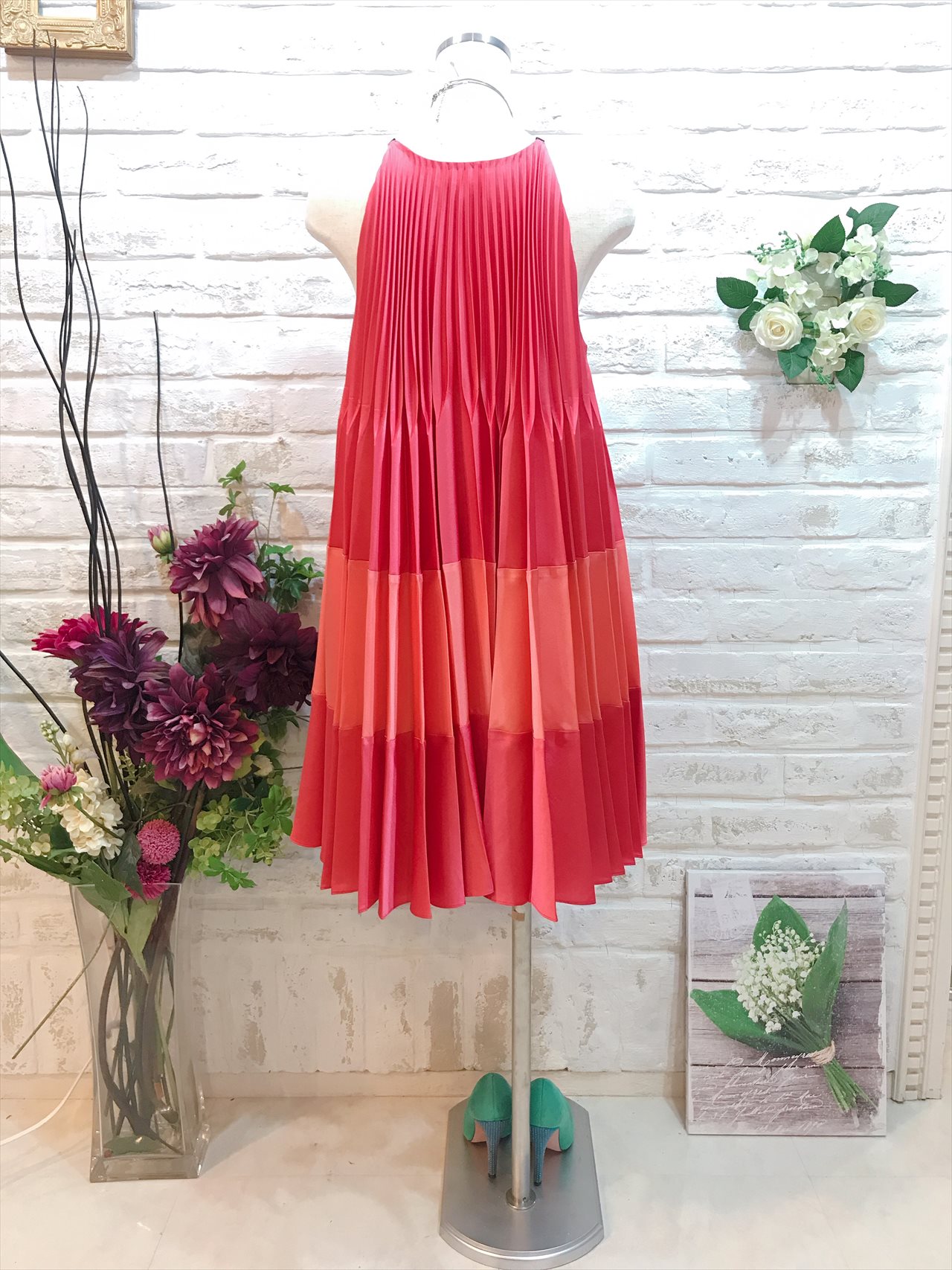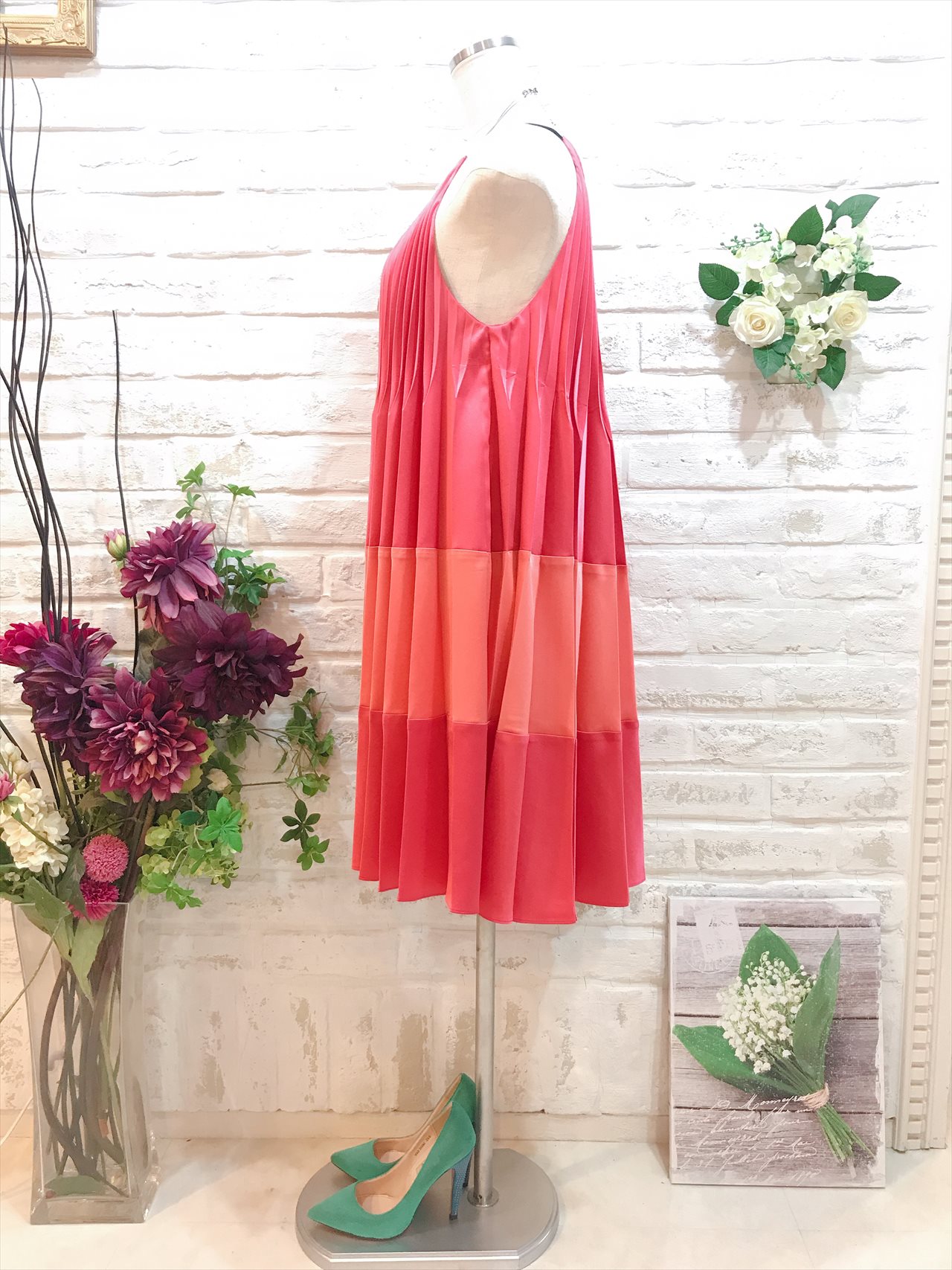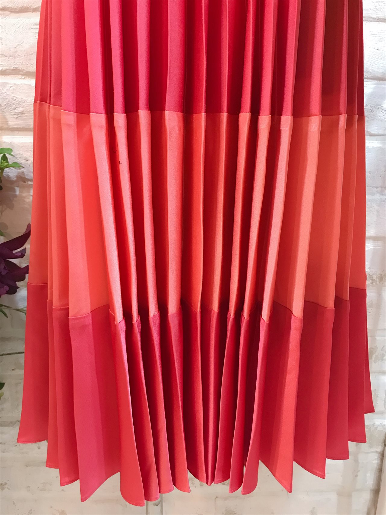 ピンクオレンジグラデーションプリーツドレス。全体的なプリーツがとても可愛く、色味も一色ではないのでとても華やかな印象です。広がりがある為ウエスト部分等締まる所がないので着心地抜群です。お靴を同じピンク系で合わせても可愛いです。ネックレスはパール系やロングネックレス等も相性が良いです。ボレロやストールなども相性が良いので、結婚式やパーティーにもお勧めです。光沢のある素材の為、華やかなな印象になります。
