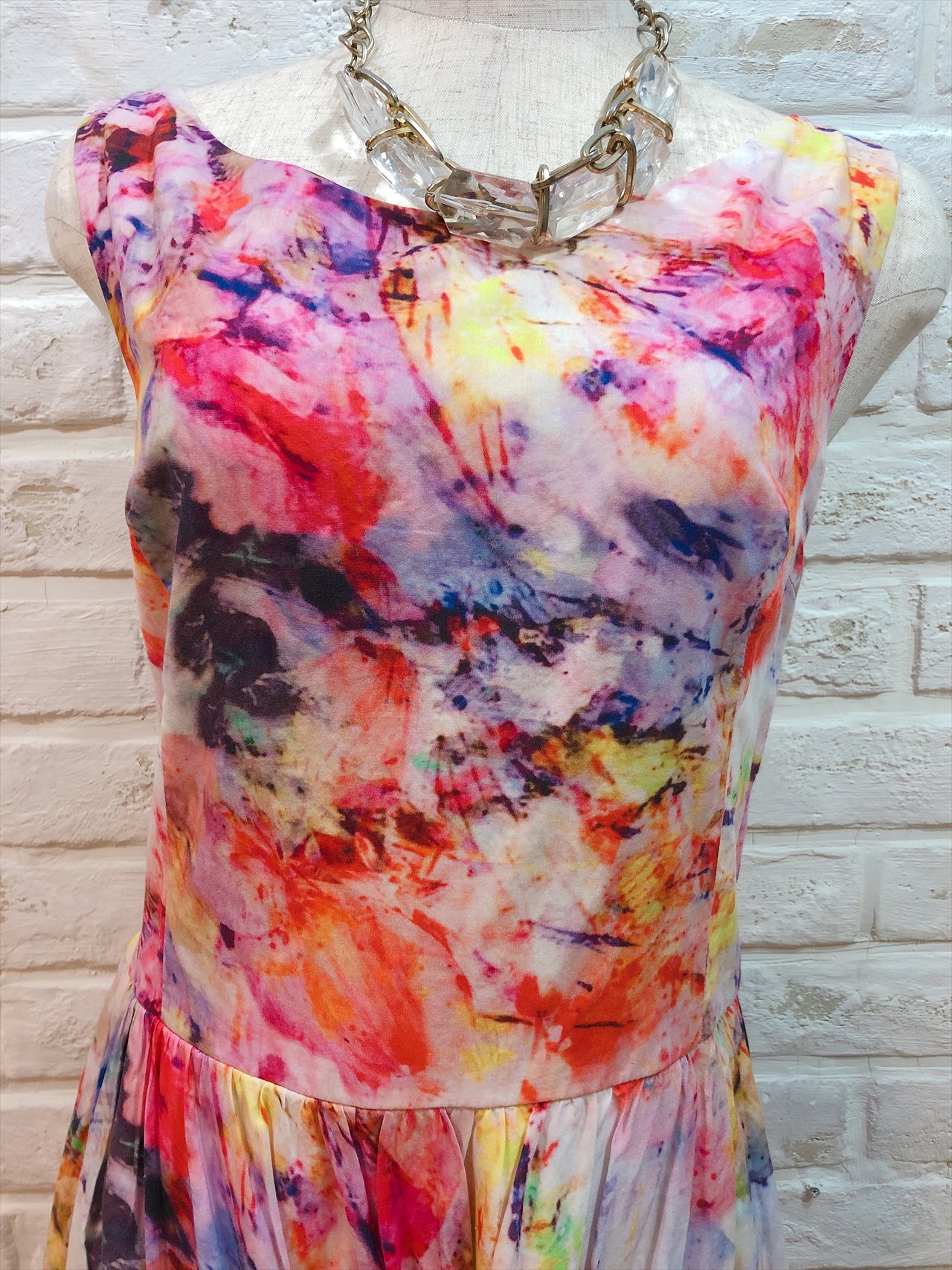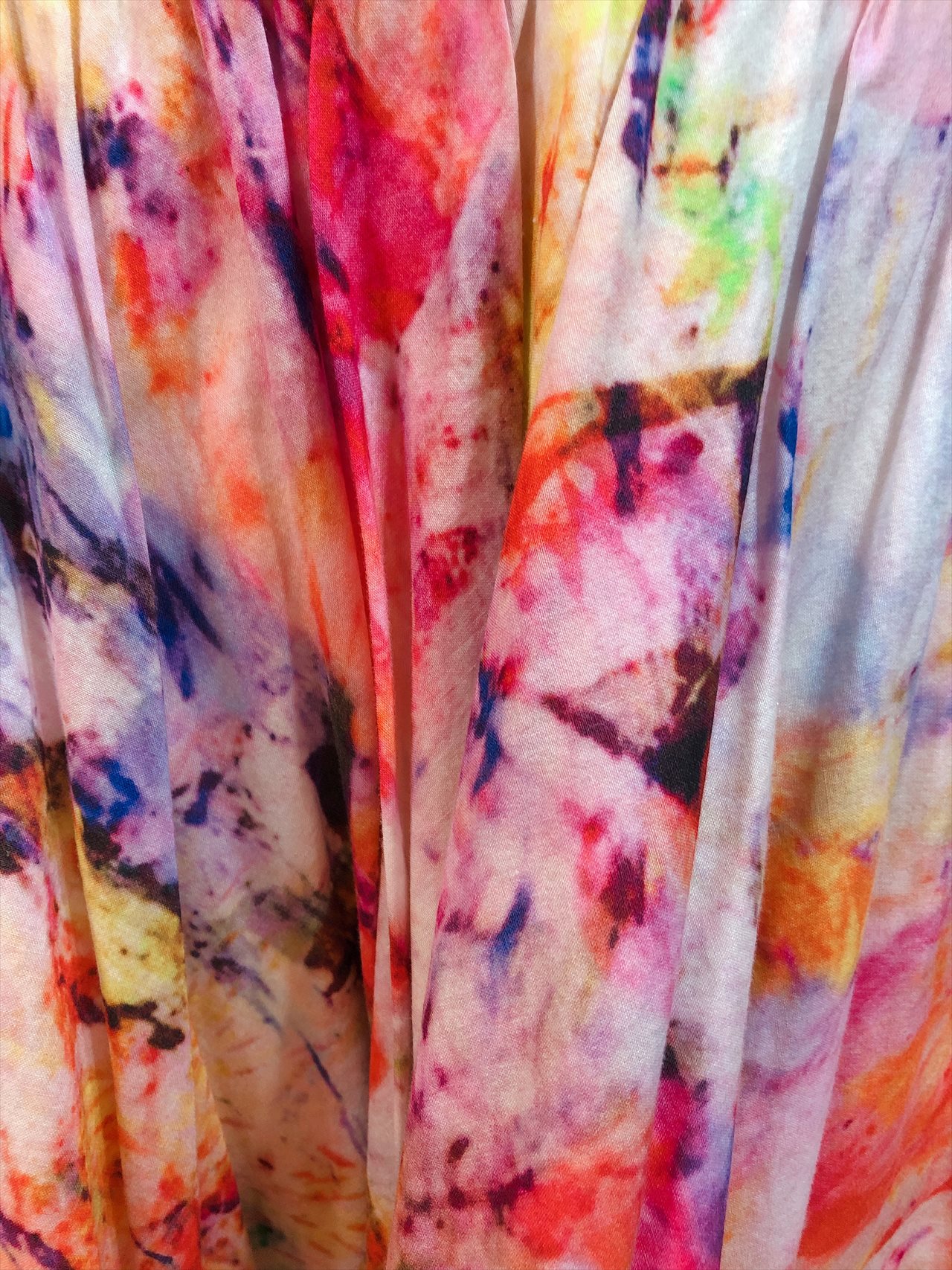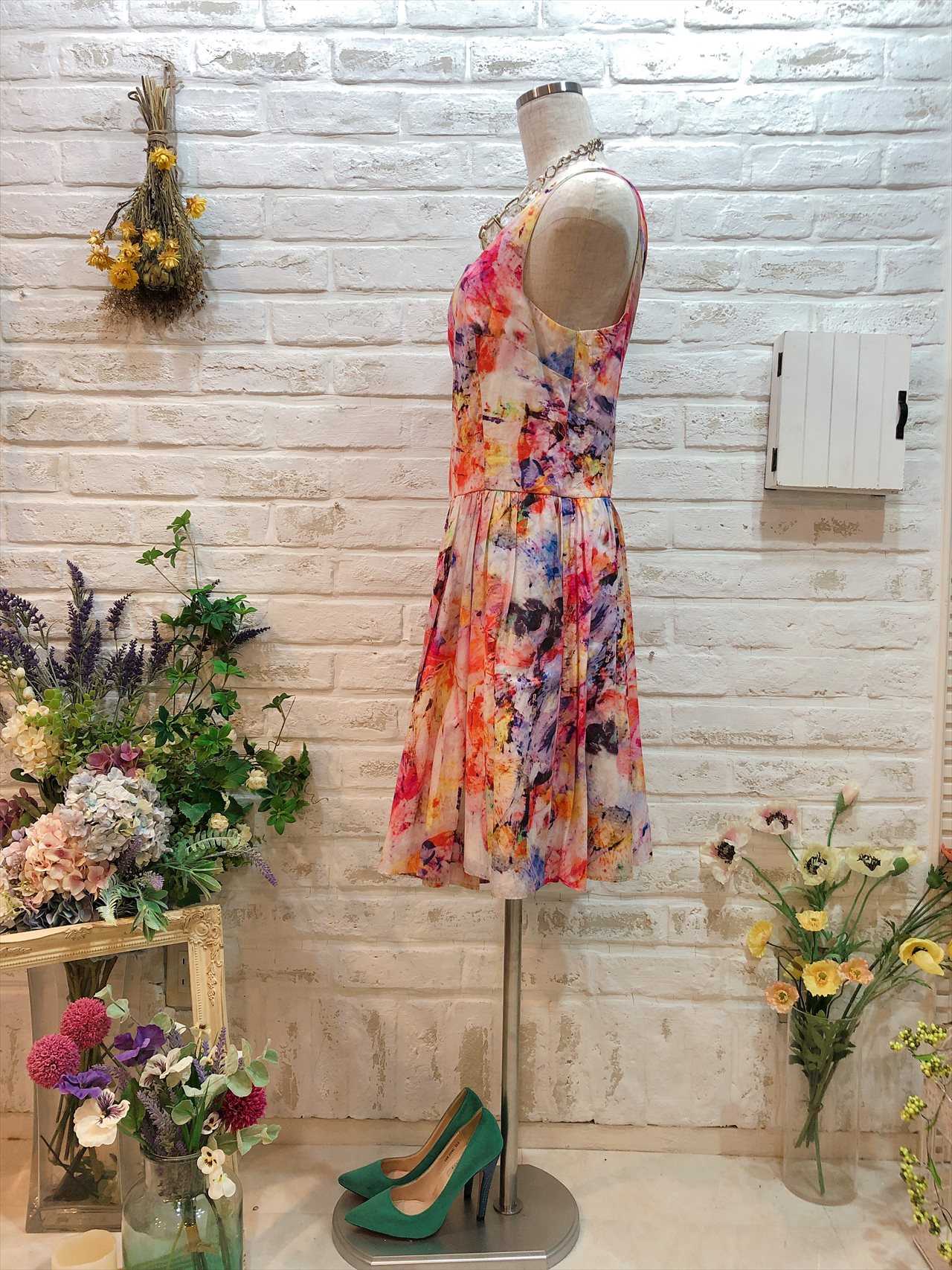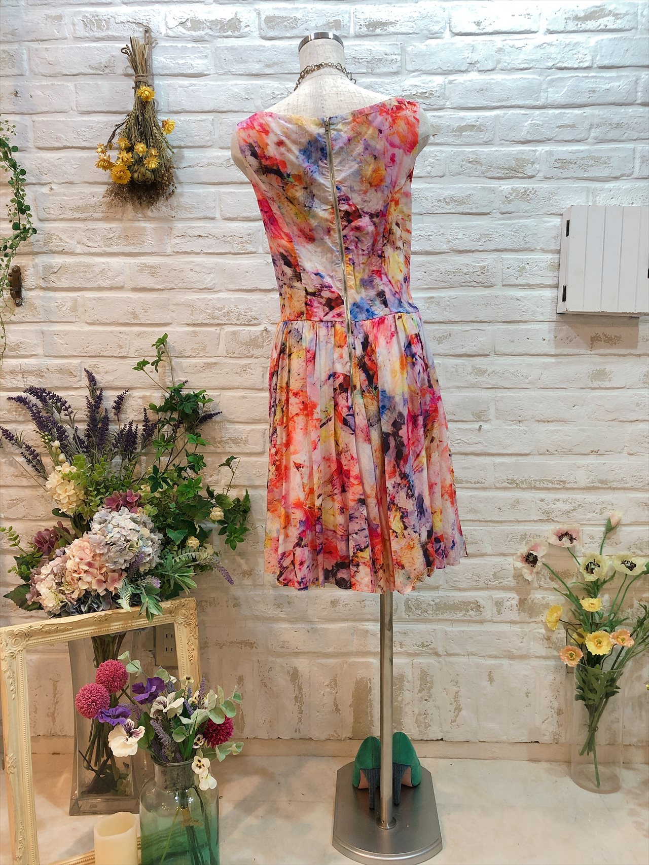 柄の肩ありドレス。ベルトを合わせて可愛いドレス。白地にタイダイ柄で赤やピンク・ブルーなど何色もお色がプリントされたデザイン。ウエストに黒ベルトなどをして頂いてもポイントになって素敵です。2次会やカジュアルなパーティーにお勧めです。スカート部分をよりふんわりされたい場合は中にパニエをはいて頂くといいと思います。他の方とかぶりたくないお客様に是非着て頂きたい1着。