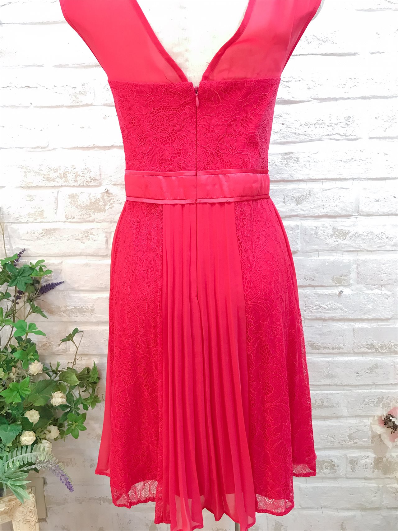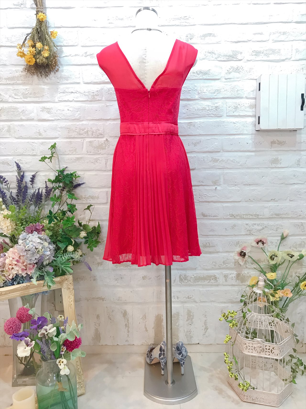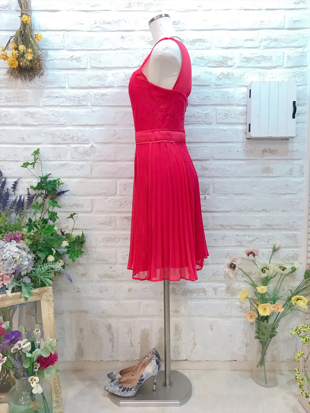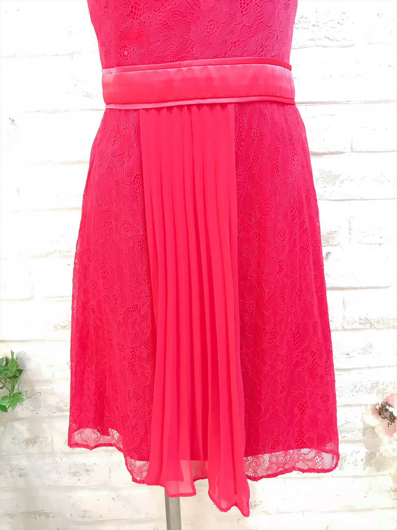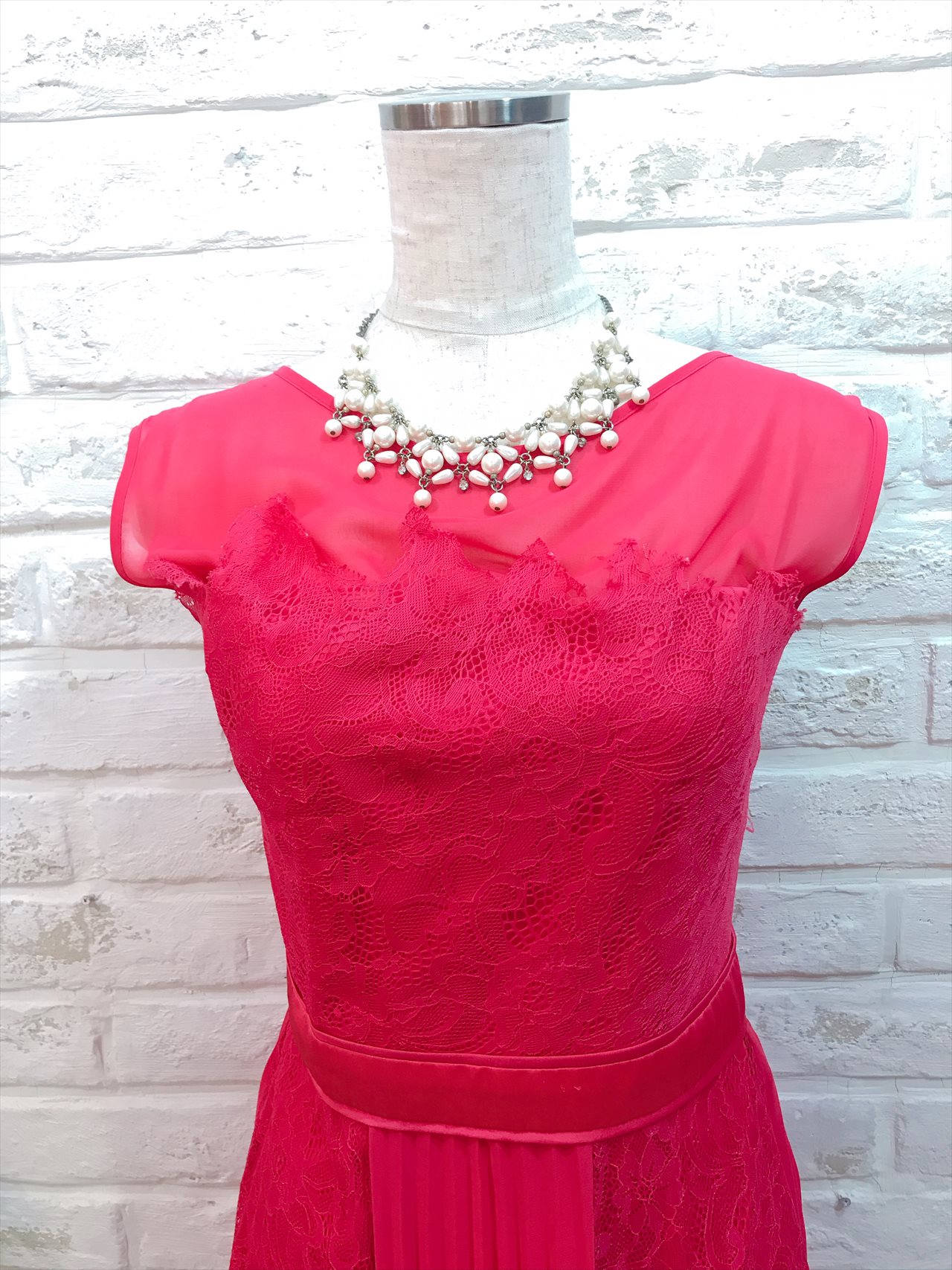 ビビットピンクのカラーのドレス。デザインは胸から肩背中にかけては素肌が少し透けるような生地となっていてそれ以外は花柄の総レースになっています。スカートの前後ろと両側にシフォン生地でのプリーツがはいっていていて異素材の組み合わせが素敵なデザインのドレスです。ウエストはサテン生地で切り替えが入っているのでスタイルもよくみせてくれます。はっきりとしたお色味のドレスなのでお小物はブラックで合わせていただくのがお勧めです。