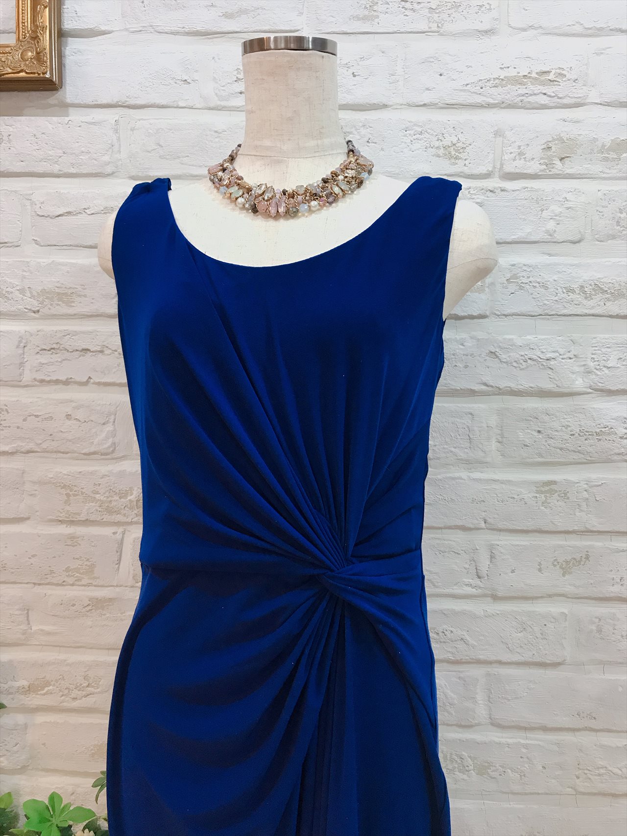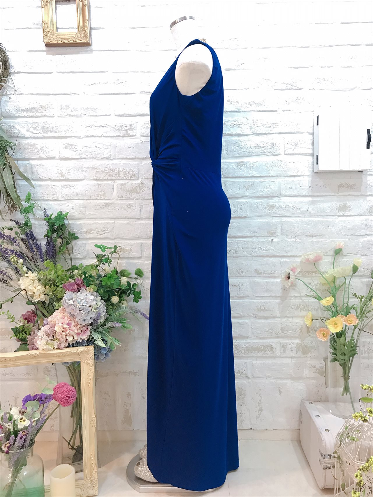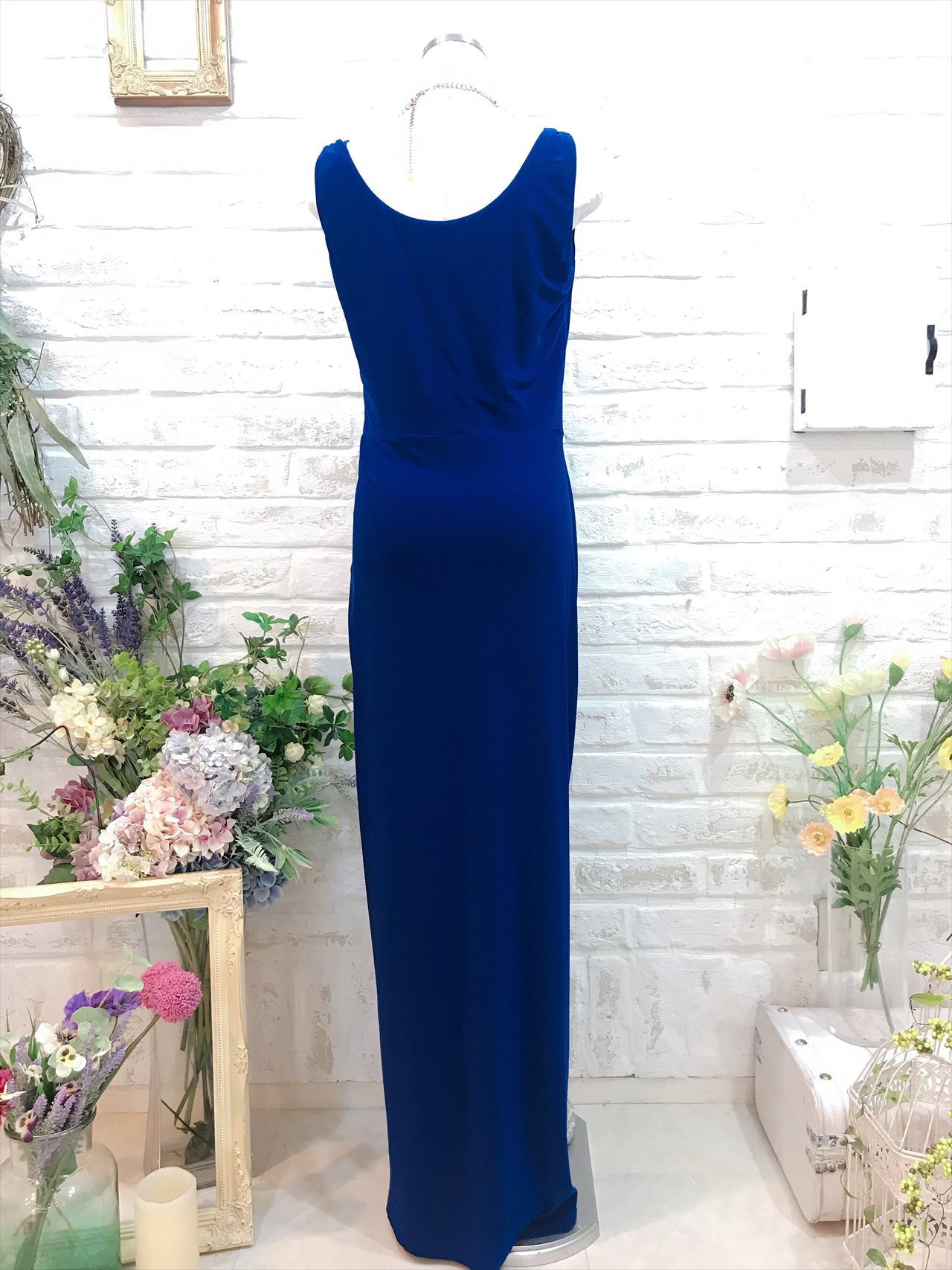 親族の方にもおススメのロイヤルブルーのロングドレス。ウエスト部での絞りが優美なドレープと裾丈の変化を作り、エレガントな立ち姿を演出してくれます。シルバーのクラッチを合わせることで、大人っぽいコーディネイトに仕上げました。