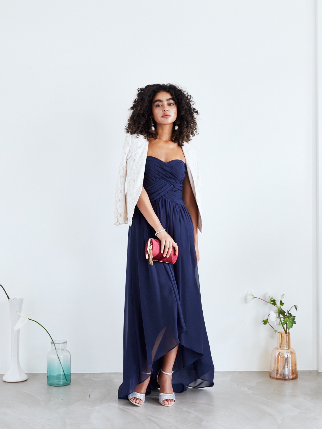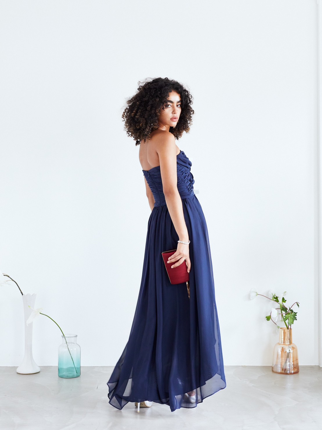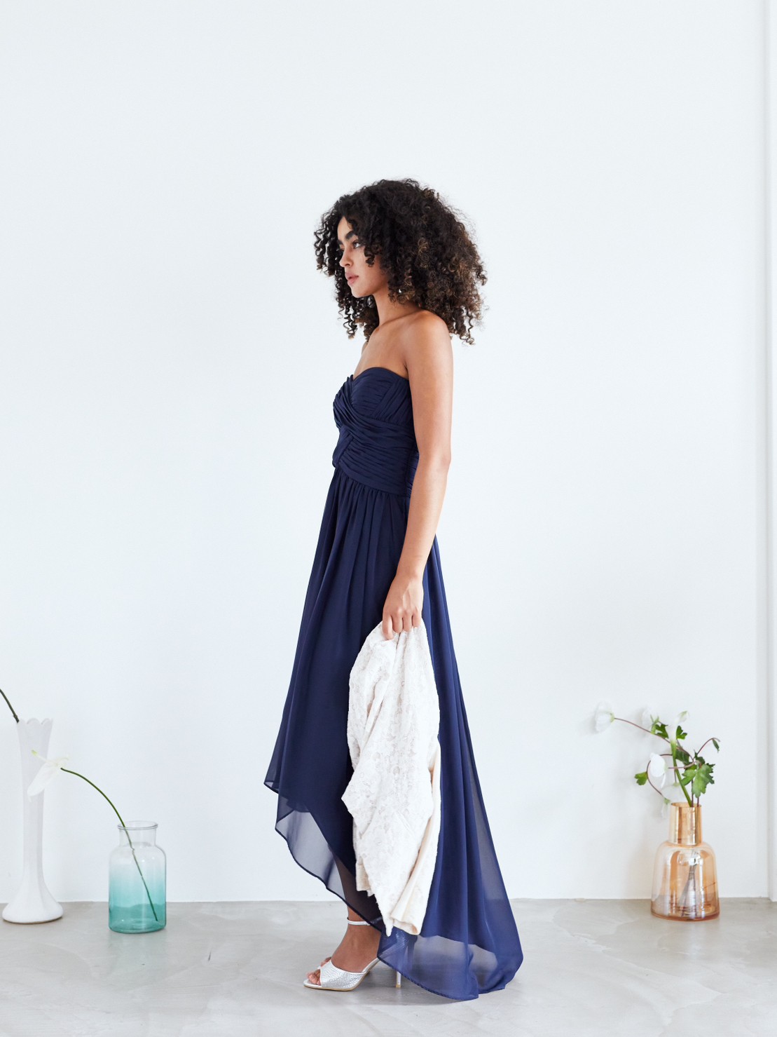 ネイビーのベアトップドレス。前方の中央にかけて裾が短くなっているため、丈が少し長めですが足さばき良好です。結婚式に参列する親族の方にもオススメな落ち着いたデザイン。
