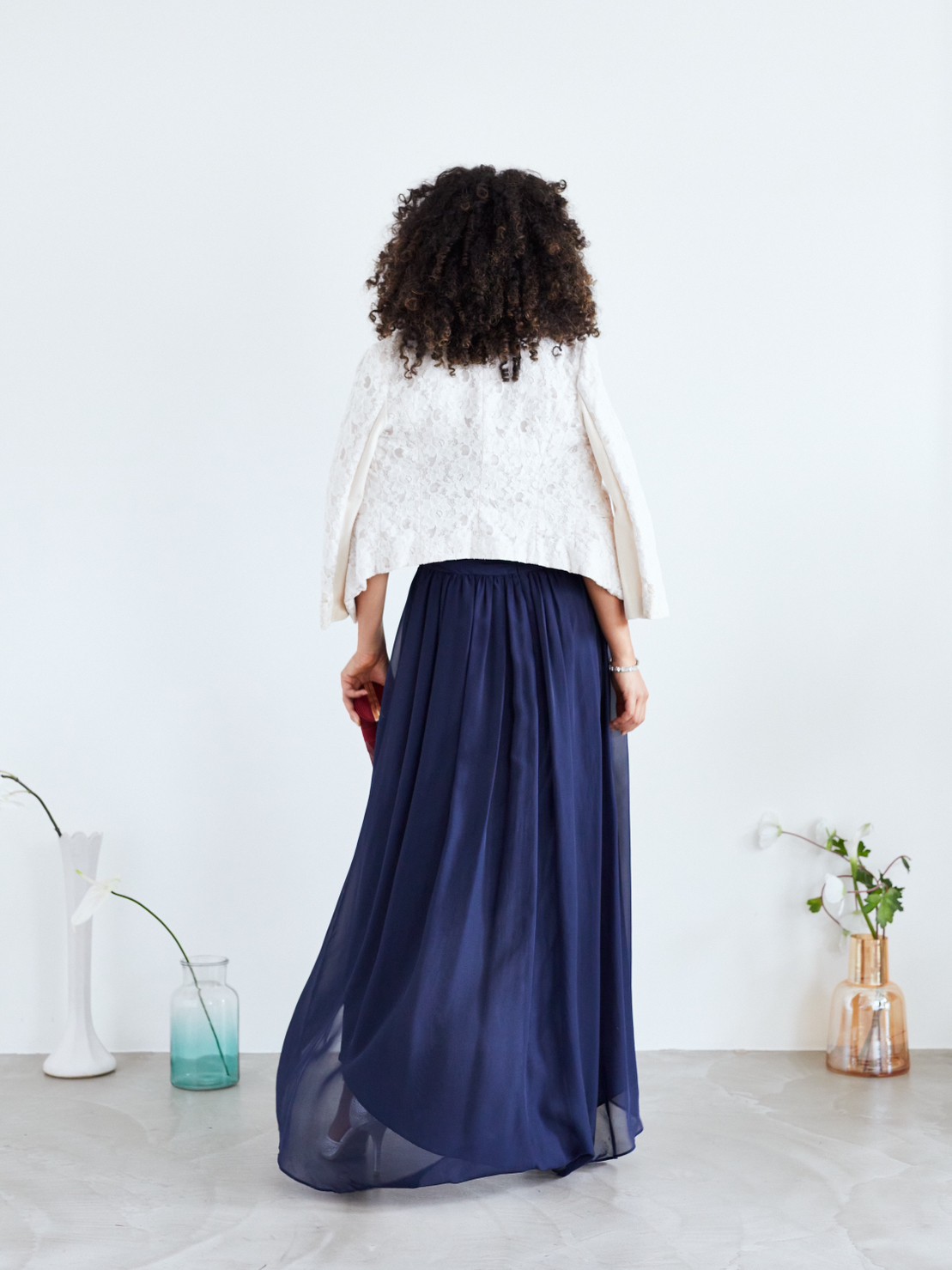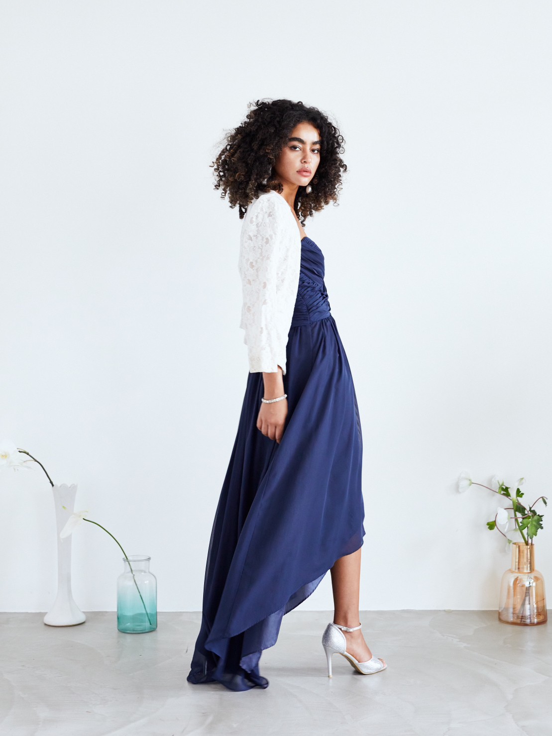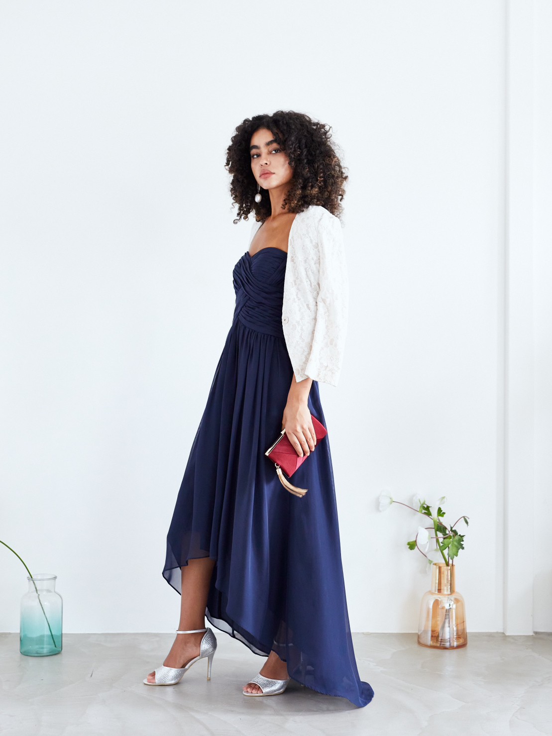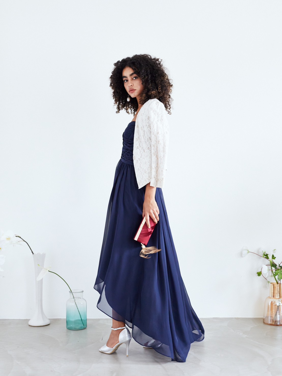 ネイビーのベアトップドレス。前方の中央にかけて裾が短くなっているため、丈が少し長めですが足さばき良好です。結婚式に参列する親族の方にもオススメな落ち着いたデザイン。