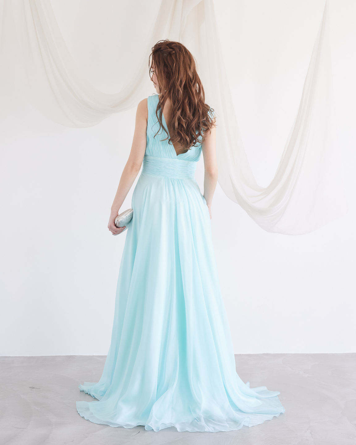 オペラや観劇、ご自身のイベントにもおススメの光沢のある水色が清楚なロングドレスです。胸元が深いVラインになっているため、すっきりとしたデコルテラインに見せてくれます。