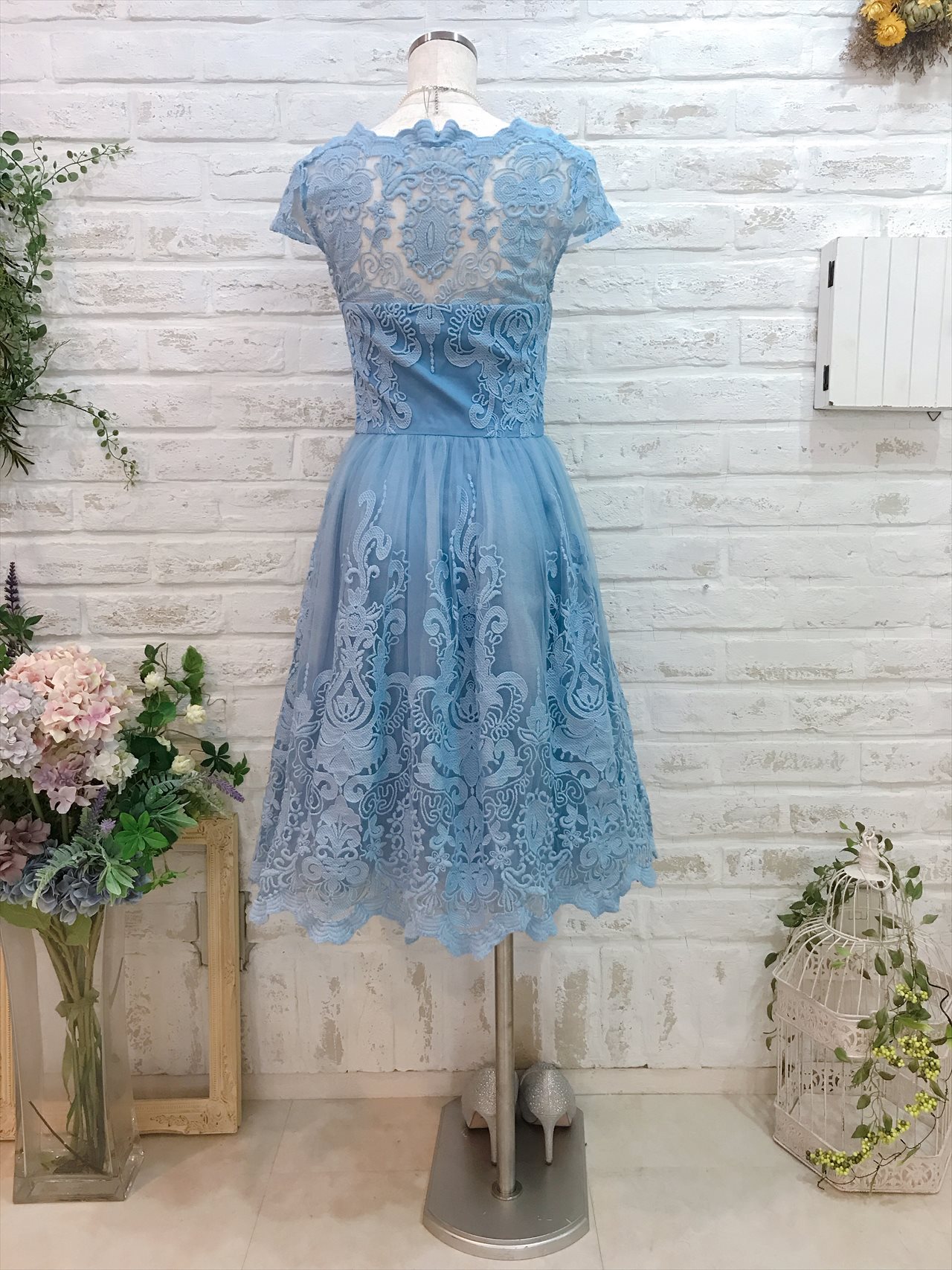 水色総レースフレアスカートショートスリーブ膝下ドレス