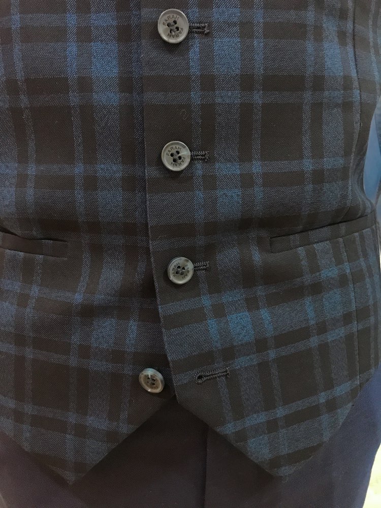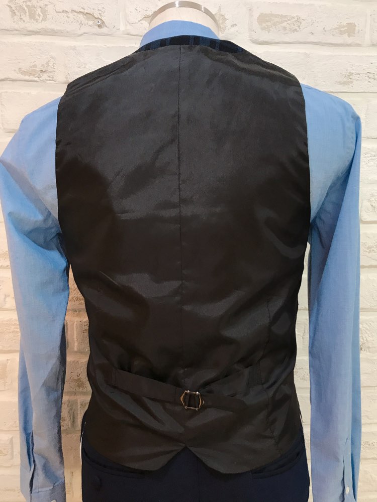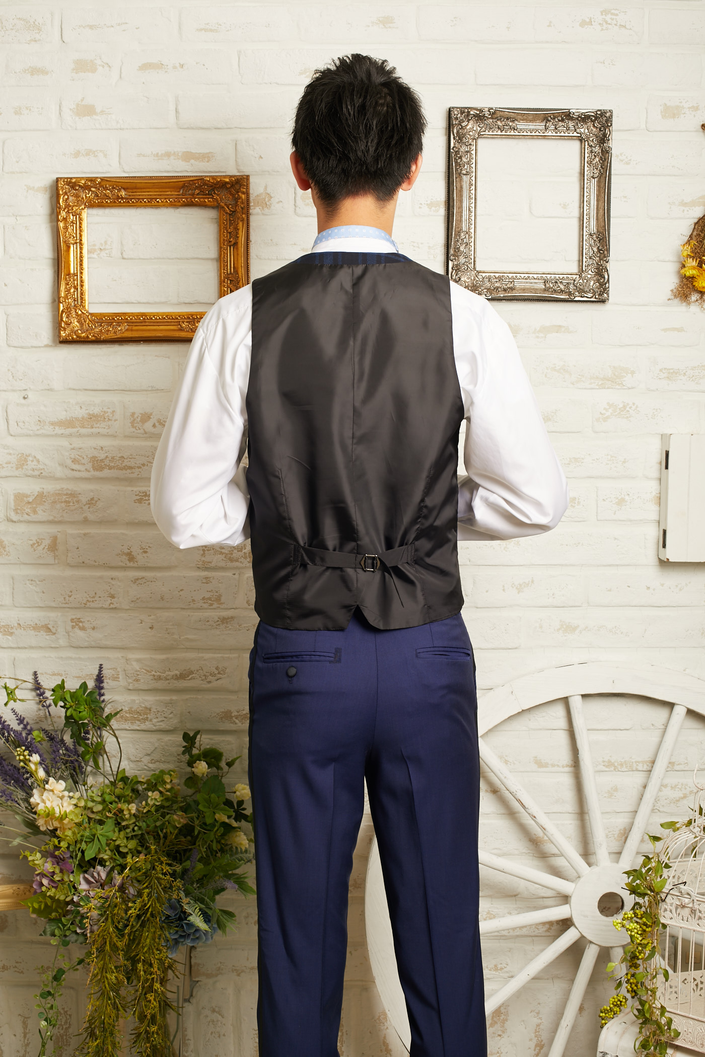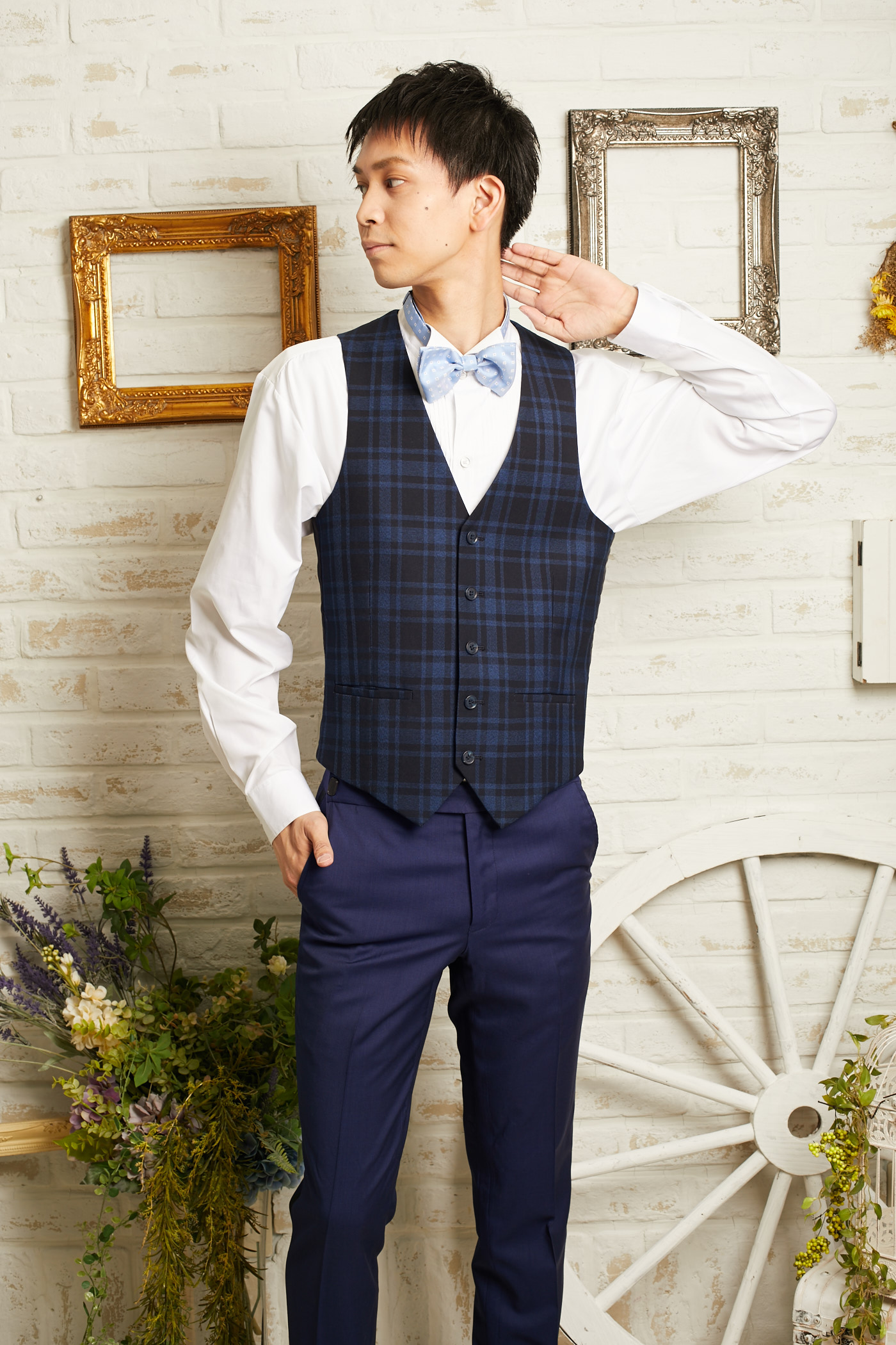 ネイビー×ブラックのブロックチェックベスト。暗めのお色なのでチェックがさりげなく、使い勝手の良い一枚。オールシーズンお使い頂けます。2次会や1.5次会など各社パーティーにおすすめ。