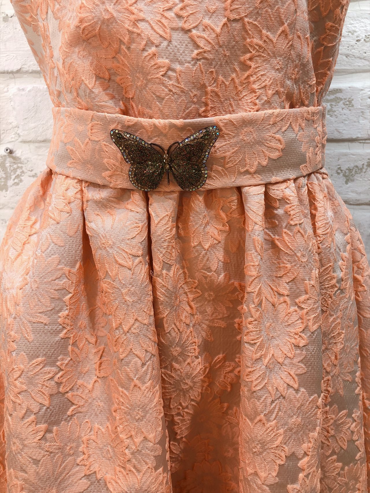 コーラルピンク花柄蝶モチーフベルト付き肩ありドレス