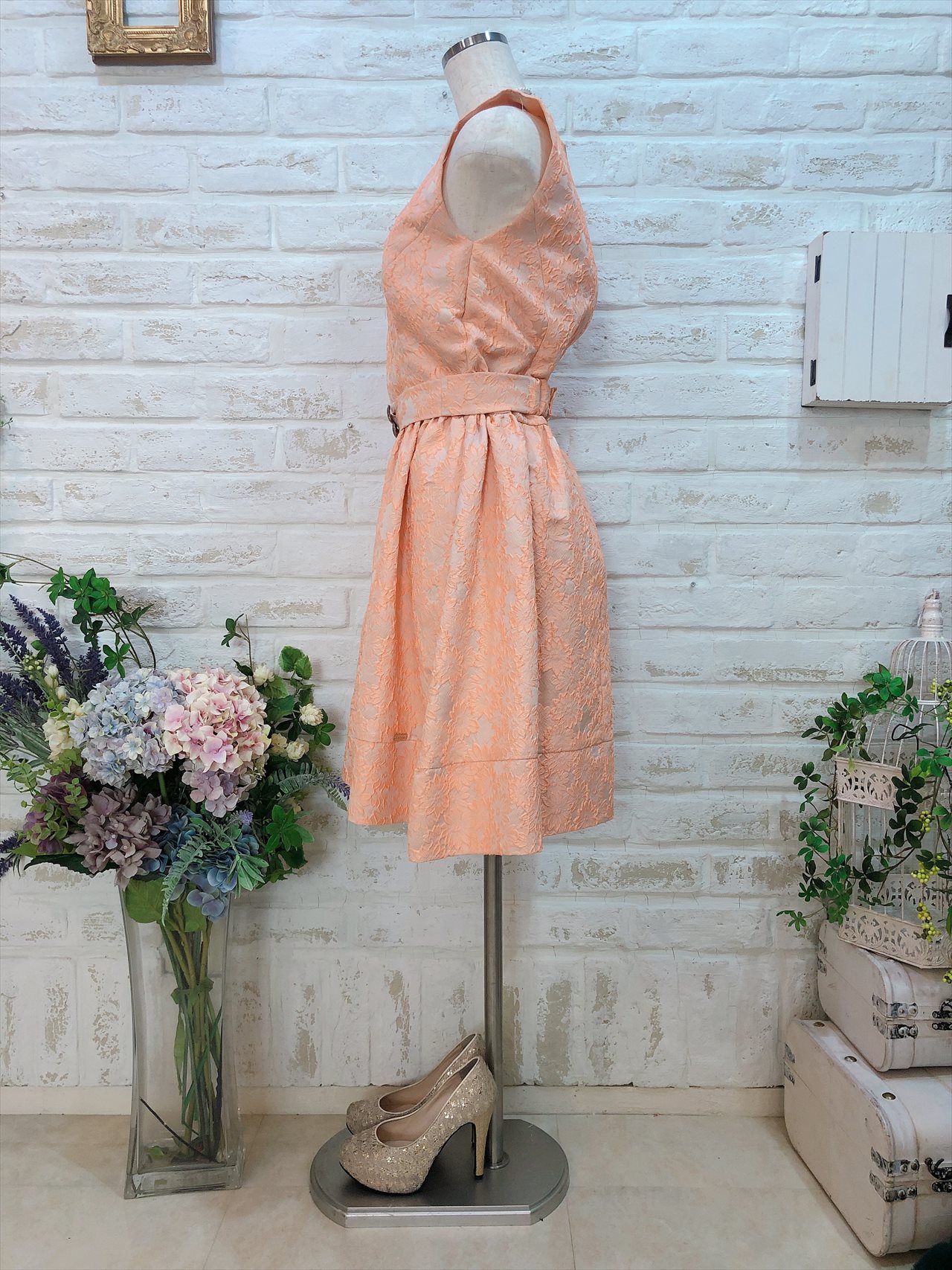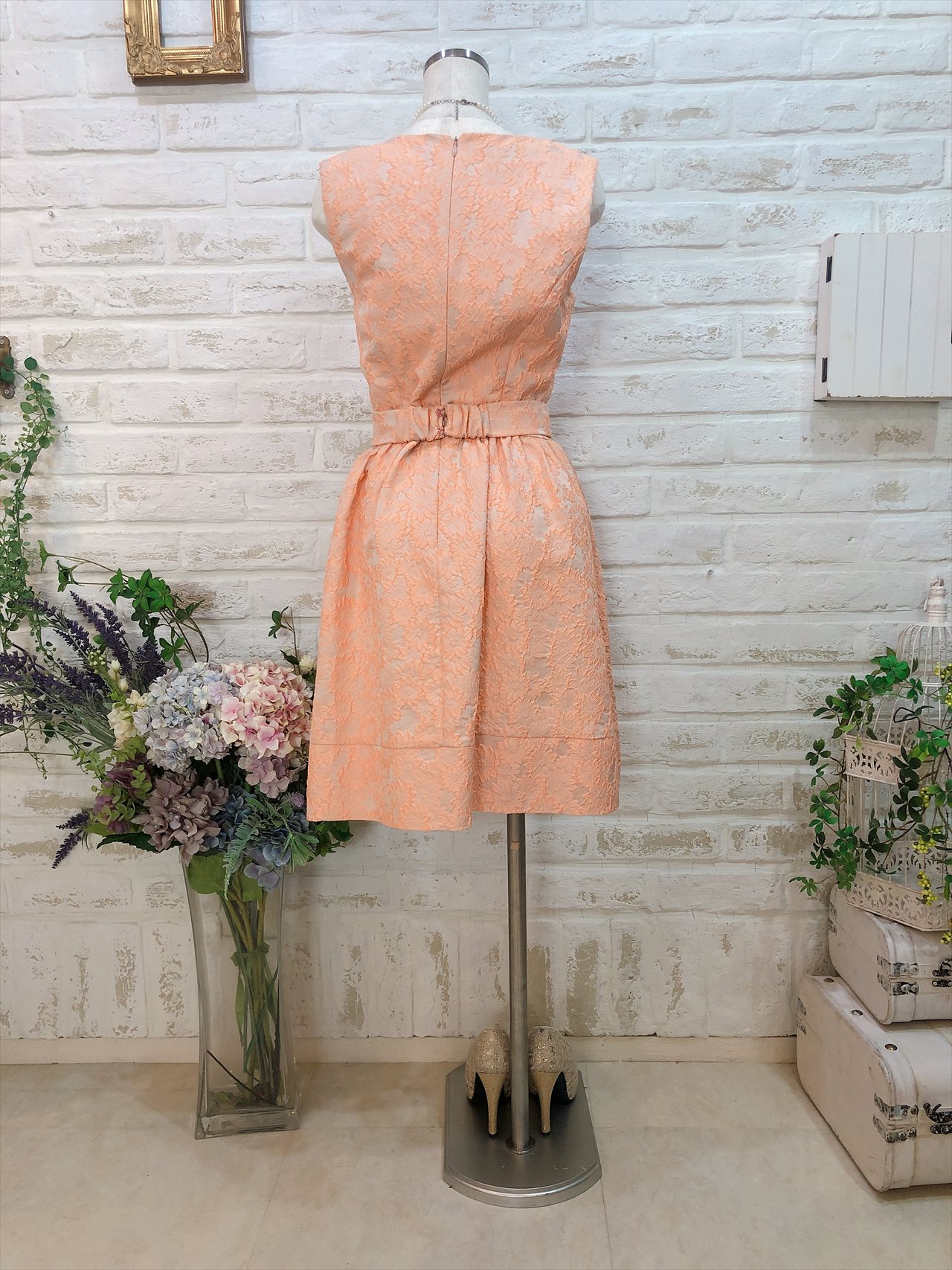 コーラルピンク花柄肩ありドレス。付属のベルトには蝶々のバックルがあり可愛いです。
